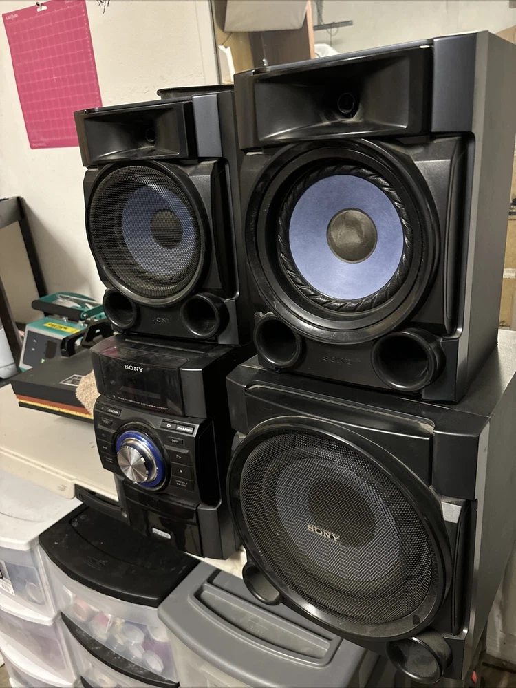 Used Sony system , 2 speakers and one subwoofer One speaker missing cover No remote Connects to older iPod/phone , aux and CD Msg me for any questions !
