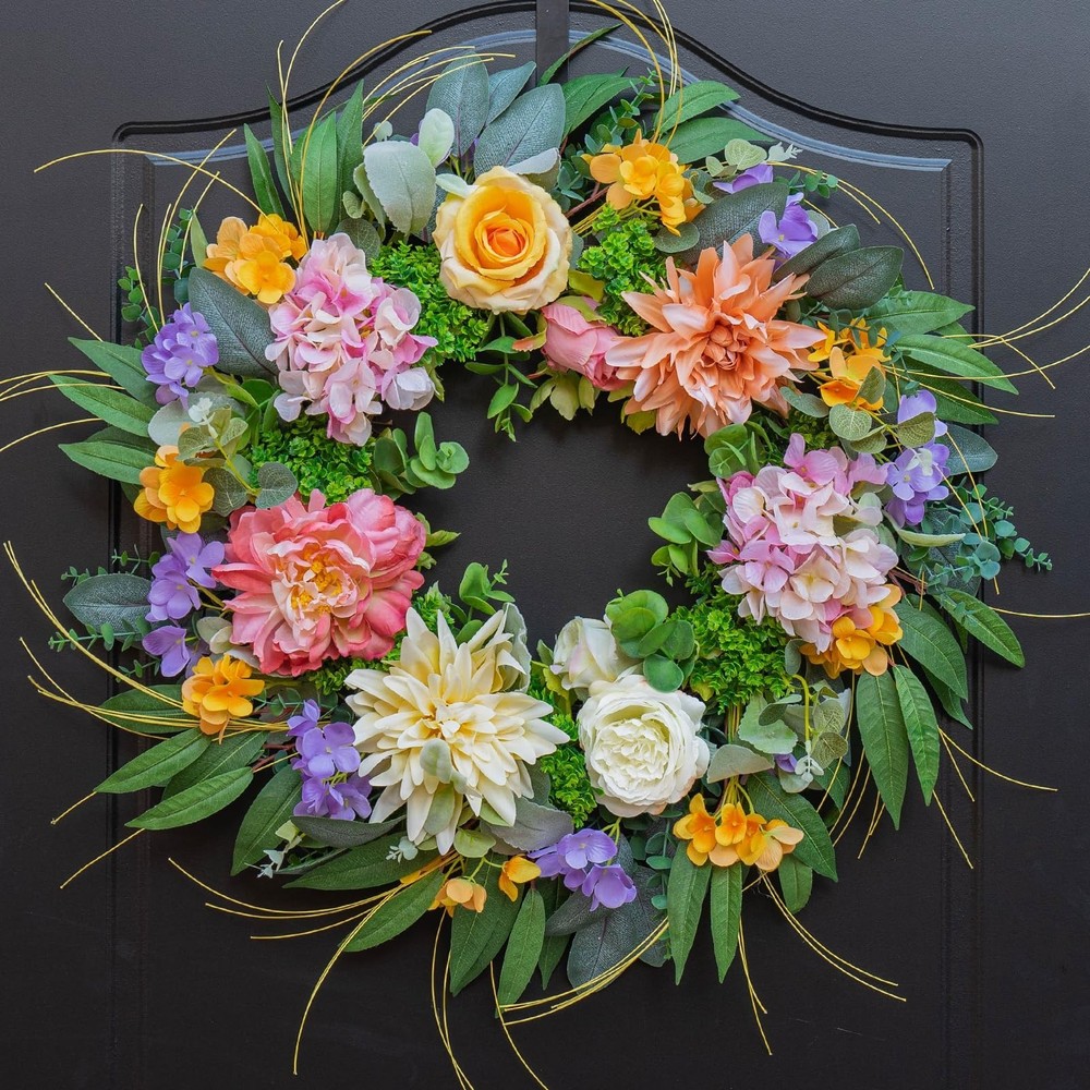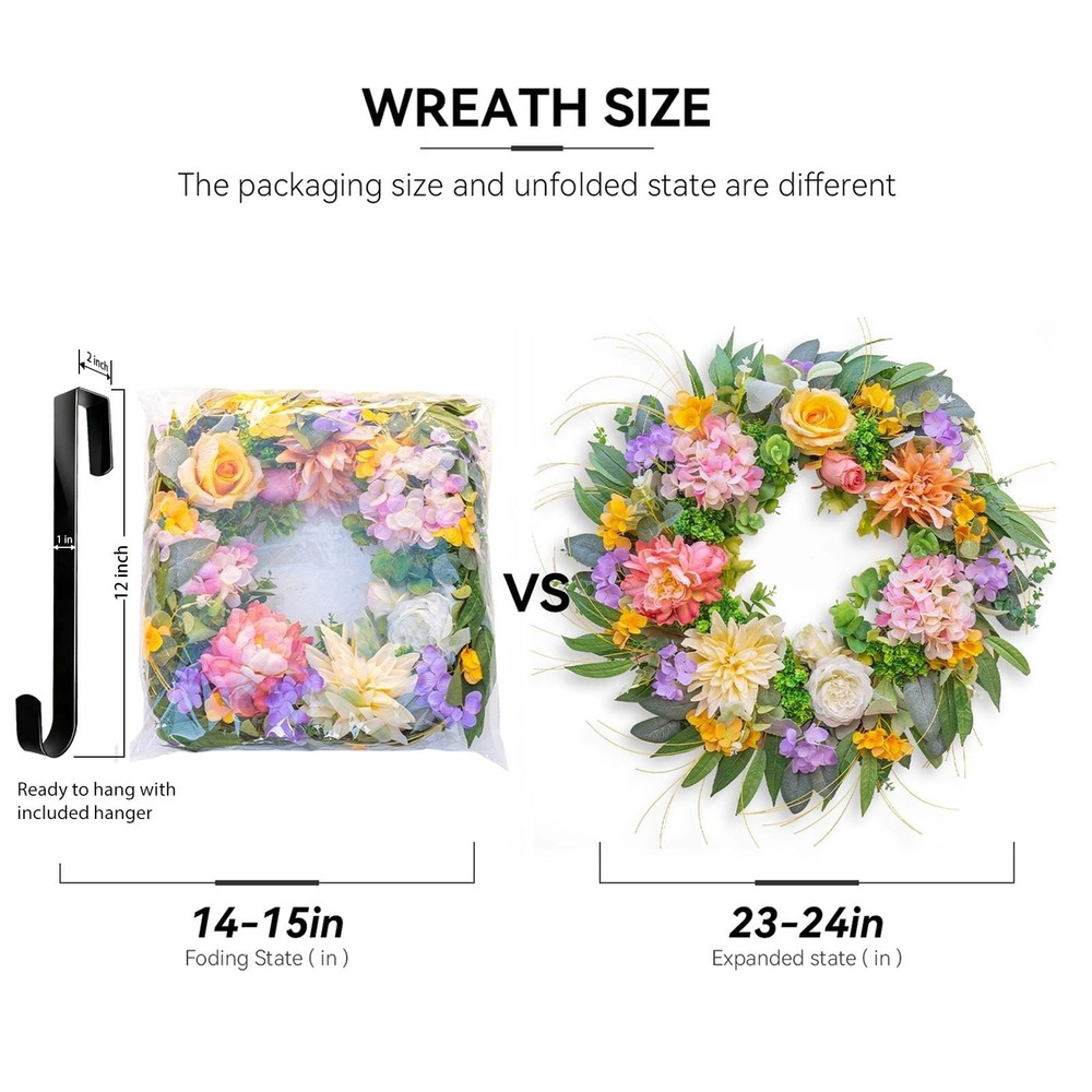 Spring Wreaths for Front Door, Soomeir Summer Peony Outdoor Wreath, Green Floral Door Decor for All Season Home Wall Wedding Farmhouse Holiday Product Details Color: Hydrangea Wreth With 12 Inch Hanger Brand: Soomeir MPN: christmas wreath UPC: Does not apply EAN: Does not apply Color: Hydrangea Wreth With 12 Inch Hanger Brand: Soomeir Material: Silk Mounting Type: Door Mount Shape: Round Product Dimensions: 6"D x 24"W x 24"H Occasion: Christmas Manufacturer: soomeir Color: Hydrangea Wreth With 12 Inch Hanger Brand: Soomeir Material: Silk Mounting Type: Door Mount Shape: Round Product Dimensions: 6"D x 24"W x 24"H Occasion: Christmas Manufacturer: soomeir Item Weight: 1.9 pounds Country of Origin: China Item model number: christmas wreath Date First Available: January 26, 2024 Gorgeous Wreath! Soomeir spring wreaths are expertly arranged by professional florists using hydrangea, peonies, roses, and various artificial greenery. The colors of the flowers are extremely vibrant, making them the perfect colors making your home stand out on the street. Graceful And Eye-Catching You'll be amazed by the fullness and beauty of this hydrangea wreaths! The elegant flowers and realistic greenery create a natural and fresh atmosphere. It can be hung not only at the front door, living room, fireplace, cabinets, walls, windows, stairs, balcony, but also as a centerpiece, matching all types of home decor styles all year round. Durable&Sturdy The spring wreath for front door made of artificial silk flowers is handcrafted and flowers are securely attached to a vine base. It's lightweight and easy to hang on a typical wreath hanger. Even with long-term outdoor use, there's no need to worry about fading or deformation of the wreath. Perfect size The spring Hydrangea wreath's diagonal width should be 22 inches, and its depth should be 5-6 inches. Due to shipping reasons, we've packed the wreath into a smaller box. Please adjust the wreath according to the instructions on the card before hanging it, and you'll get a full and beautiful wreath! Out Of The Box It only takes a couple of minutes to fluff up the spring wreath and make it look as good as new, so full and beautiful! We've also included the high-quality packaging box,for easy transport and storage, and they can even be used as a gift.