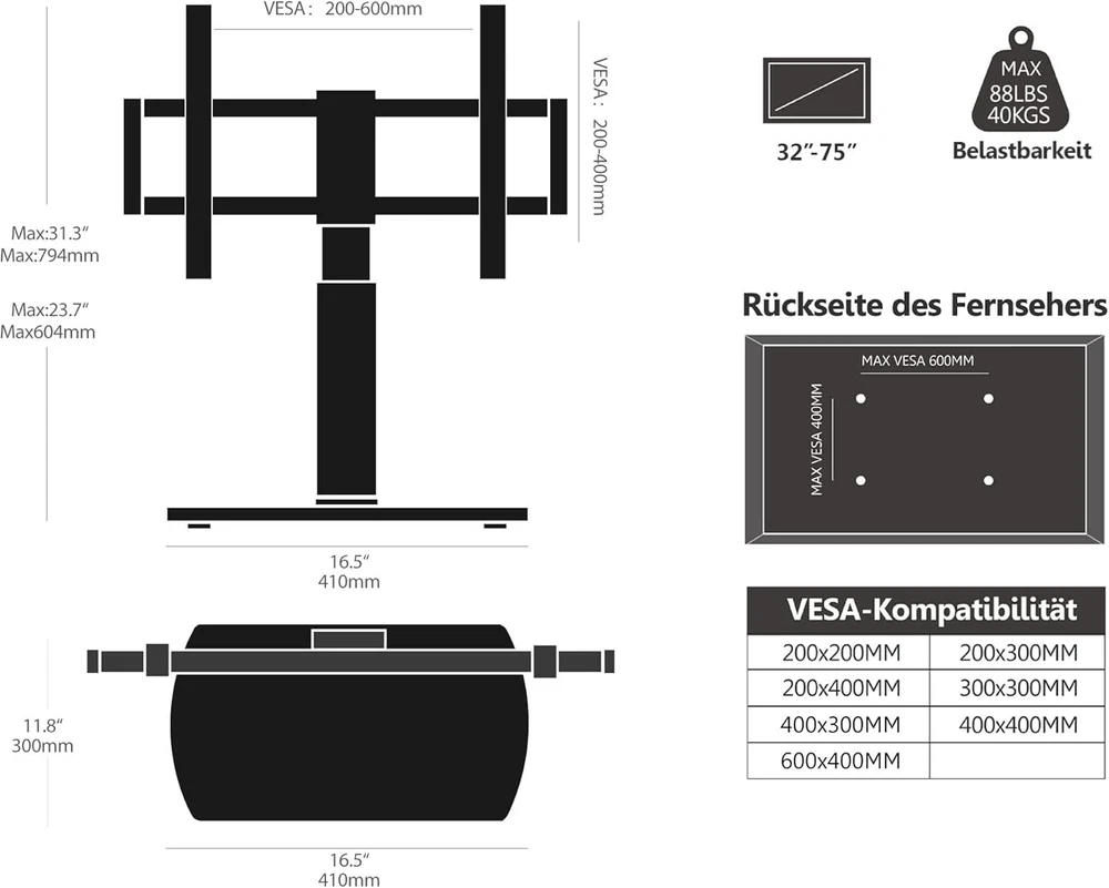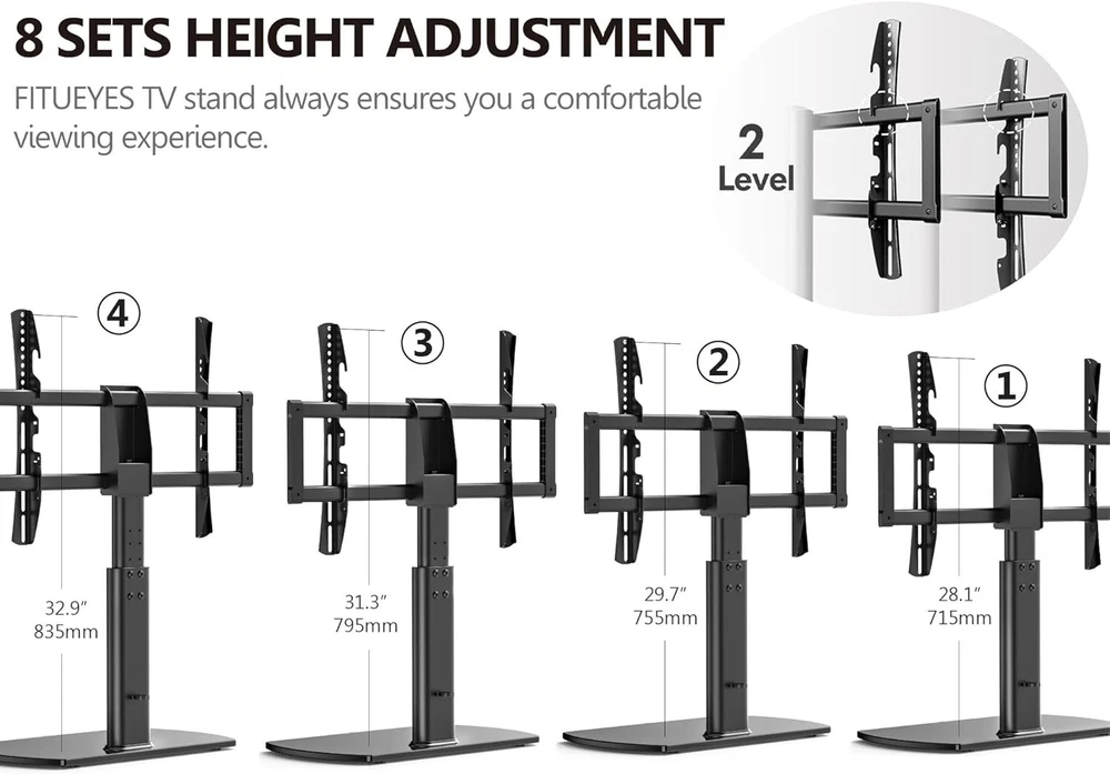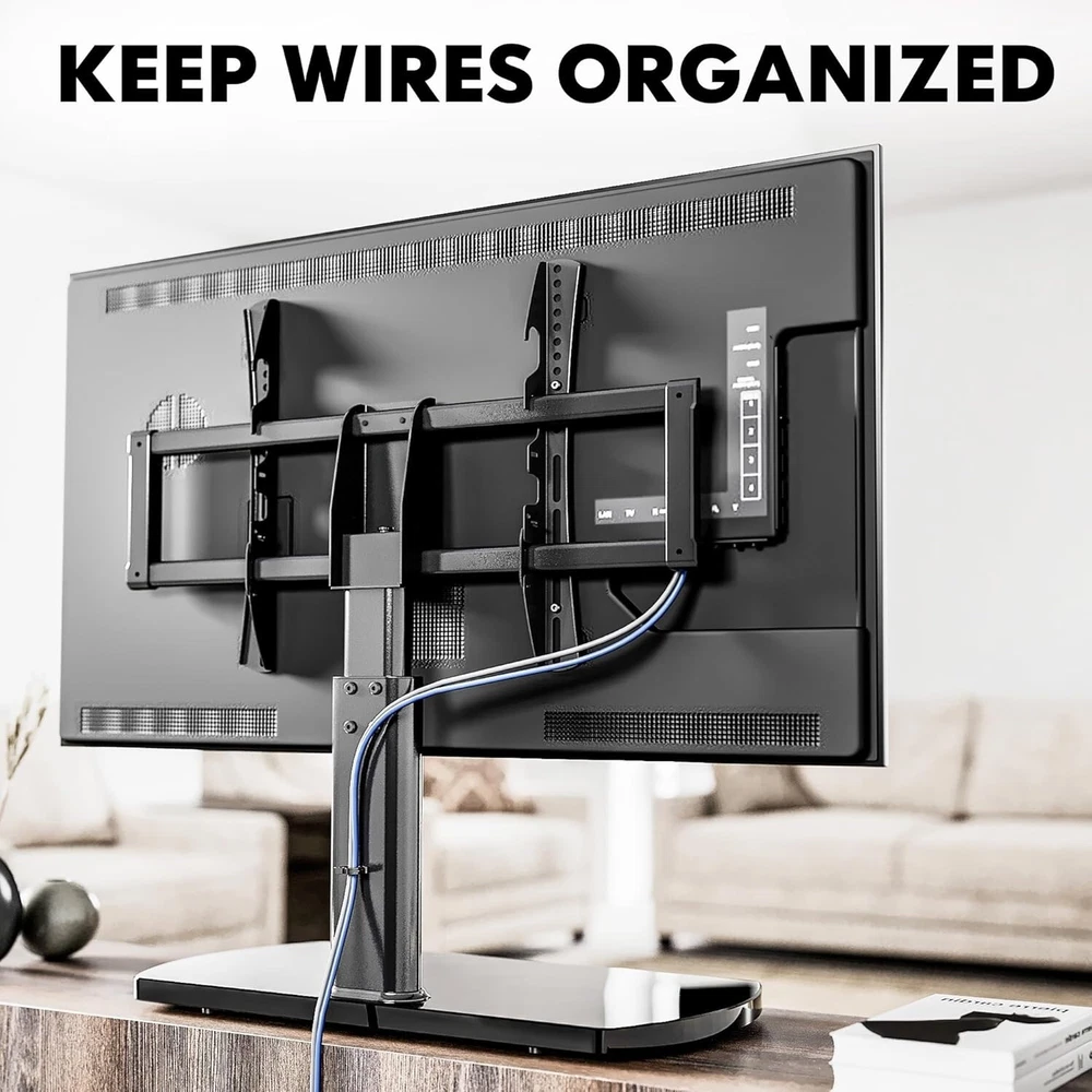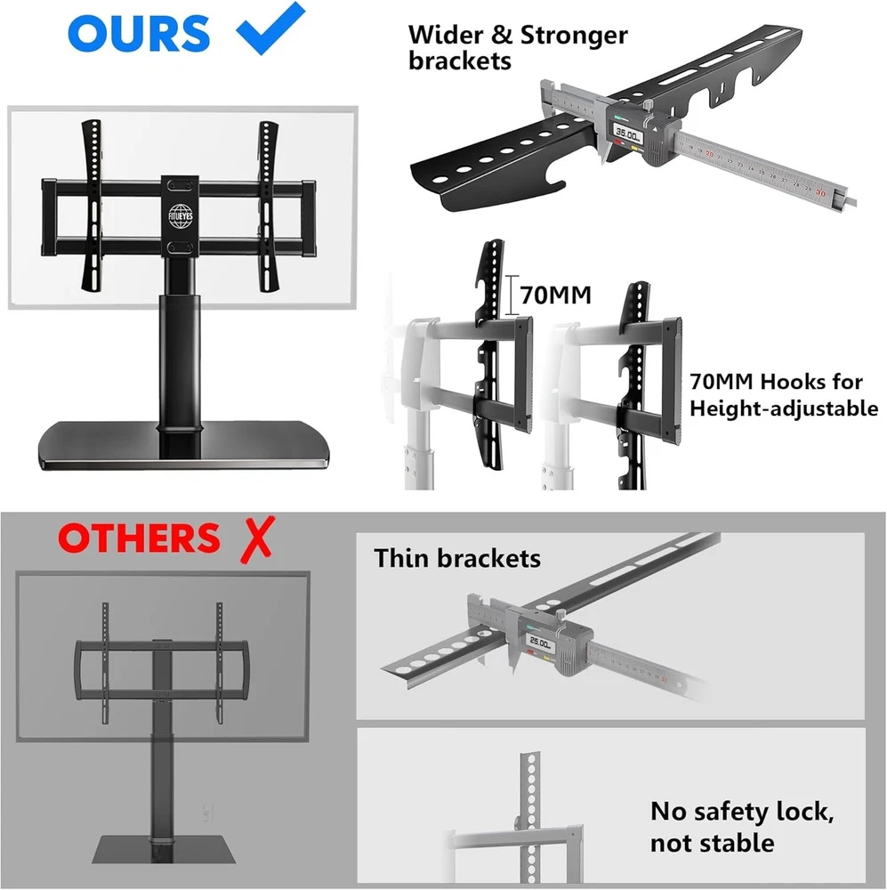 Universal TV Stand, Swivel TV Table Stand for 32-65 70 75 Inch Flat Screen, Table Top TV Stand Base Replacement, Height Adjustable TV Mount Stand with Glass Base, Max Holds 88lbs Universal Design: This universal TV stand base can easily hold TV on table top with safety and stability. Its TV mounting bracket fits most 32" - 70" 75" flat-panel that weighing up to 88 lbs. (most 32 37 39 42 47 50 55 60 65 70 inch curved/ flat screen tvs). Fits VESA (mounting hole pattern) : 200x200mm - 600x400mm ( wxh) Height Adjustable & Swivel +/-35°: Both TV stand and brackets of swivel mount are height adjustable. It can also pivot 35° right or left for better viewing flexibility with this swivel TV mount stand 10mm Tempered Glass TV Base: Unlike other tv legs, our strong tv stand with heavy-duty glass base could support max 88lbs TV well. It is much more steady and much taller. A great replacement stand & TV riser. Unique safety lock design on the TV brackets fix TV tightly Organize Wires: Come with a clip to organize the wires at the back of your table top TV stand. Black hooks is specially designed to distinguish left or right with this black TV stand Easy Installation: No drill on your wall. Comes with numbered parts, needed tools and a detailed manual. 15 minutes will be enough