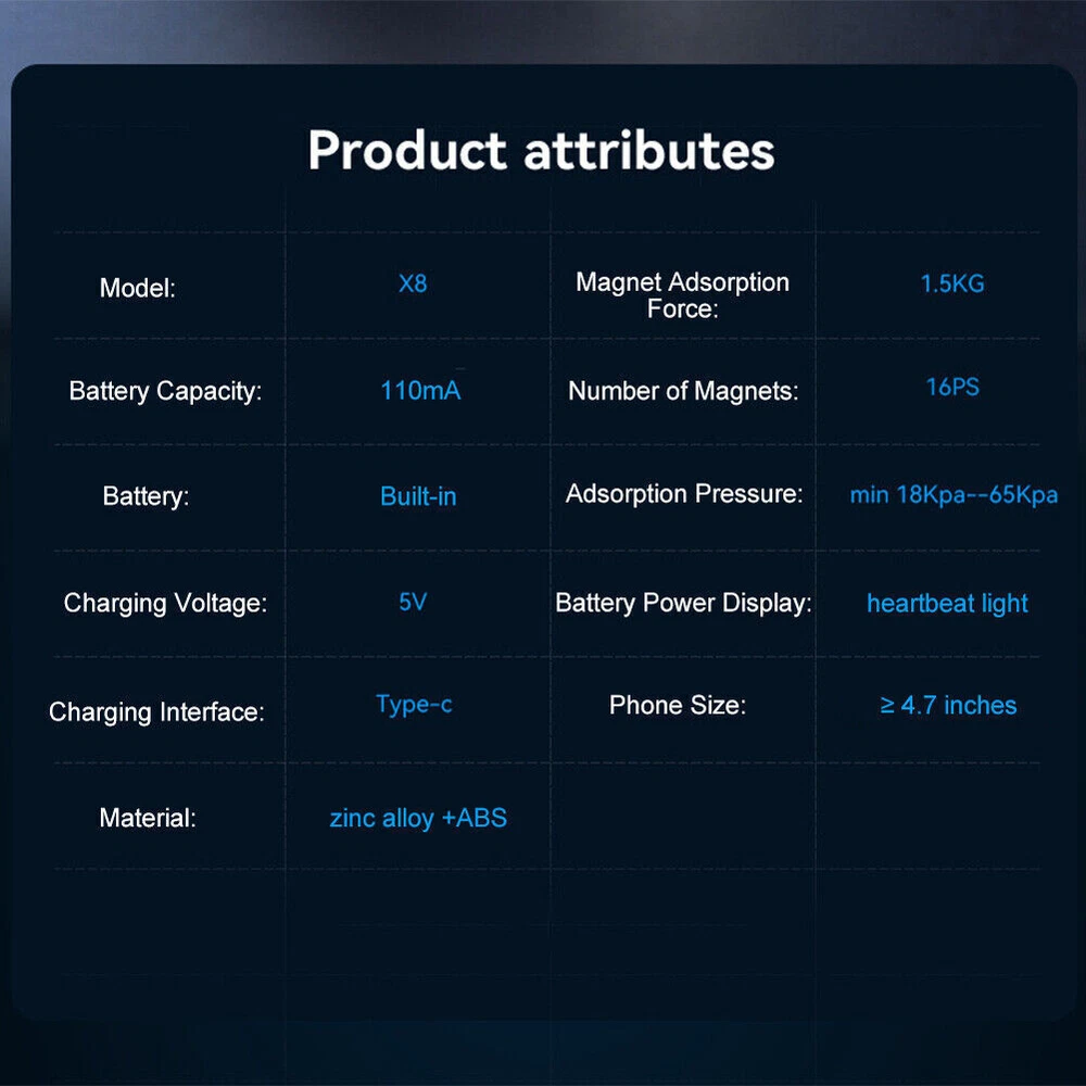 Phone Stand with Bluetooth Speaker 3 in 1 Bluetooth Audio Power Phone Holder 26.68 USD 29.98 USD Free shipping 11% off New High Intelligent Mobile Phone/Pad Holder 41.52 USD 46.65 USD Free shipping 11% off 360°Rotatable Car Magnetic Holder Intelligent Vacuum Adsorption Phone Holder Car 24.98 USD 27.76 USD Free shipping 10% off For Magsafe Car Mount Charger Magnetic. 27.68 USD 31.1 USD Free shipping 11% off 12V 8A 95W Double-deck Electronic Semiconductor Refrigeration Sheet TEC2-25408 25.69 USD 28.87 USD Free shipping 11% off Product Description Car Phone Holder Universal Vacuum Suction Cup Car Phone Double-sided Adsorption Description: *1. Model: X8 *2. Battery Capacity: 110mAh *3. Battery: Built-in *4. Charging Voltage: 5V *5. Charging Interface: Type-C *6. Material: zinc alloy +ABS *7. Magnet Adsorption Force: 1.5kg *8. Number of Magnets: 16Pcs *9. Adsorption Pressure: min 18Kpa--65Kpa *10. Battery Power Display: heartbeat light *11. Phone Size: ≥ 4.7 inches Features: *1. Materials: Magnetic car suction cup holder is made of high-quality and durable materials. It provides strong support to ensure that your device stays in place even during rough riding. *2. Long Endurance: Once the suction cup phone holder is fully charged, it lasts for over a month, meeting daily needs. It is equipped with a Type-C cable for fast and convenient charging. *3. Locate It Everywhere: Adopts innovative Magnetic & Vacuum design. Simply twist the small control lever to adjust suction, achieving a customized and secure fit. The bottom of the suction cup is coated with washable and reusable gel to ensure that it will not damage the surface of the car dashboard or windshield. *4. 360° Rotation and Safe Use: 360° adjustable phone mount allows you to find the best viewing angle. Due to its compact design, our magnetic car suction cup holder will not obstruct your driving view, making your driving experience safer and more convenient. *5. Use Case: Suitable for all smooth surfaces such as car glass, windows, screens, walls, etc., with strong adhesion. Package Includes: 1 x Suction Cup Phone Bracket 1 x USB Cable 1 x Magnetic Disk Shipping Returns Contact Us Payment Items are generally shipped out in 1-3 business day after your payment has been cleared (Sat. & Sun. excluded.) Orders from the United States Warehouse will be shipped out via USPS or UPS. The shipment usually takes 3-7 business days(Saturday and Sunday excluded), if you need the item urgently, please contact us for detail before purchasing. Local pick up is not available. Orders from China will be shipped via EDIS or China Post.The shipment will take 10-15 working days to US,take 20-35 working days to other countries,part of countries will take more days,please contact us if you didn't get the parcel for a long time. You have 60 days to return it from the date it was received. All returned items must be in the original package and you must provide us with the shipping tracking number,specific reason for the return and your ebay ID. We will refund your full winning bid amount , upo n receipt of the item in its original condition and package with all components and accessories included. Dear buyers,we appreciate your business, if you are satisfied with our service , please leave us a Positive feedback and rate the details of the transaction (Detailed Seller Ratings) with a "Pefect Stars ". We aim to provide best services and products in exchange your maximum statifaction. We will do our best to resolve your issue till your satisfaction. All emails will be answered within 24 hours except weekends and holidays. Import duties,taxes and charge are not included in the item's price or shipping cost.These charges are the buyer's responsibility. Please check with your country's customs office to determine what these additional costs will be prior to bidding or buying. Insurance is included in the Shipping & Handling costs paid. Shipping Items are generally shipped out in 1-3 business day after your payment has been cleared (Sat. & Sun. excluded.) Orders from the United States Warehouse will be shipped out via USPS or UPS. The shipment usually takes 3-7 business days(Saturday and Sunday excluded), if you need the item urgently, please contact us for detail before purchasing. Local pick up is not available. Orders from China will be shipped via EDIS or China Post.The shipment will take 10-15 working days to US,take 20-35 working days to other countries,part of countries will take more days,please contact us if you didn't get the parcel for a long time. Returns You have 60 days to return it from the date it was received. All returned items must be in the original package and you must provide us with the shipping tracking number,specific reason for the return and your ebay ID. We will refund your full winning bid amount , upo n receipt of the item in its original condition and package with all components and accessories included. Contact Us Dear buyers,we appreciate your business, if you are satisfied with our service , please leave us a Positive feedback and rate the details of the transaction (Detailed Seller Ratings) with a "Pefect Stars ". We aim to provide best services and products in exchange your maximum statifaction. We will do our best to resolve your issue till your satisfaction. All emails will be answered within 24 hours except weekends and holidays. Payment Import duties,taxes and charge are not included in the item's price or shipping cost.These charges are the buyer's responsibility. Please check with your country's customs office to determine what these additional costs will be prior to bidding or buying. Insurance is included in the Shipping & Handling costs paid. Phone Stand with Bluetooth Speaker 3 in 1 Bluetooth Audio Power Phone Holder 26.68 USD 29.98 USD Free shipping 11% off New High Intelligent Mobile Phone/Pad Holder 41.52 USD 46.65 USD Free shipping 11% off 360°Rotatable Car Magnetic Holder Intelligent Vacuum Adsorption Phone Holder 