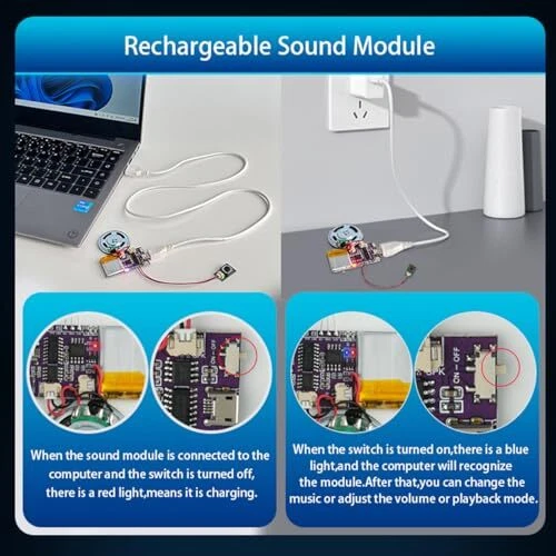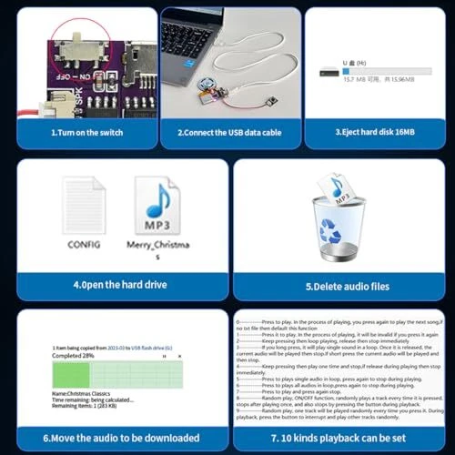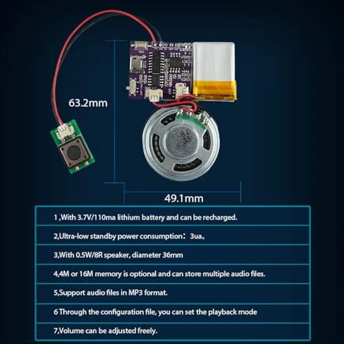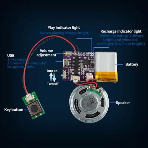 30 Days Return Policy Fast Delivery Trusted seller Sound Module,16 MB Push Button Control Activated Vioce Chips, MP3 Music Sound Module for Crafts, Christmas,New Year Greeting Presents Cards Box with Speaker Lithium Battery Powered,USB Cable. Product Description Download and Delete Music : The voice chips support download your own mp3 music, also record through MIC. You can connect to the computer to delete the built in music. Personalize your settings by adjusting the playback mode in the "config.txt" file. This allows you to achieve a personalized experience. 16 MB Storage Capacity : This sound module boasts a spacious 16MB memory, providing ample storage space to accommodate multiple favorite songs or recordings. By connecting the module to a computer using a USB-Micro cable, you can effortlessly add new audio files to the internal storage. This opens up a world of possibilities for your creativity, allowing you to easily modify and update the stored audio content according to your preferences and needs. USB Charging Recording Module : This recording module features a rechargeable design and is equipped with a big-capacity 3.7 V battery (110 mAh),fully charged takes approximately 90 minutes,played for about 120 minutes. It can be conveniently charged via the Micro USB-Type-C interface. This design extends the battery life, allowing for prolonged usage without the need for battery replacement. You can easily charge it by connecting it to a computer or using a charger, ensuring a full battery and enabling long-lasting usage with repeated charging cycles. Light and Portable : Multiplay recordable voice module card is lightweight (18 G), small (length, width 49.1mmX 63.2 mm), simple and easy to operate,can allows you to adjust the volume and features an ON OFF switch, ensuring the good listening experience. Enjoy full control over your audio creations with our voice recording module. Easy Installation : Back of the sound module is equipped with adhesive stickers. You simply need to stick it onto the surface of your greeting card, present box, or any other object, and it will securely attach to your creative creation. This way, you don't need any additional tools or materials to easily combine the sound module with your present, bringing surprise and joy to the recipient. After Sales Service : Please carefully read the user manual before Using. Any Question, please GET HELP WITH ORDER under your order ID.We have own factory, Diverse style. Support customization Welcome to email us! Shipping Returns Payment Shipping Shipping is FREE to all addresses other than APO/PO boxes in the lower 48 states. All our stock ships from US-based warehouses. Shipped via USPS or UPS (depending on location and package weight) Unless stated otherwise, all orders will ship within 24-72 hours of your payment being processed. Check our feedback to see the great reviews of FAST shipping we offer. Returns As our valued customer, we will do our best to make sure the product you receive arrives to you on time and as expected. If you are not satisfied with your purchase, please contact us within 30 days of receiving your order to process a return. Payment We currently accept payment via eBay managed payments only. Once payment is cleared, we will dispatch your shipment within 1-3 business days. Please refer to the "Shipping" tab for more information regarding shipping speed to your destination.