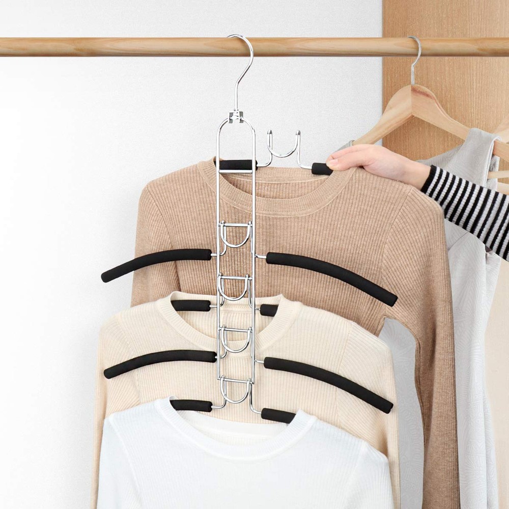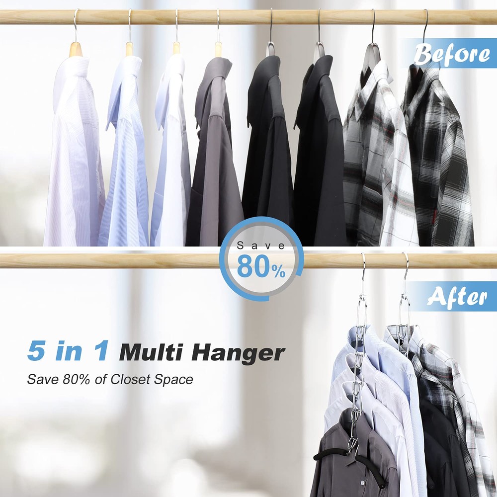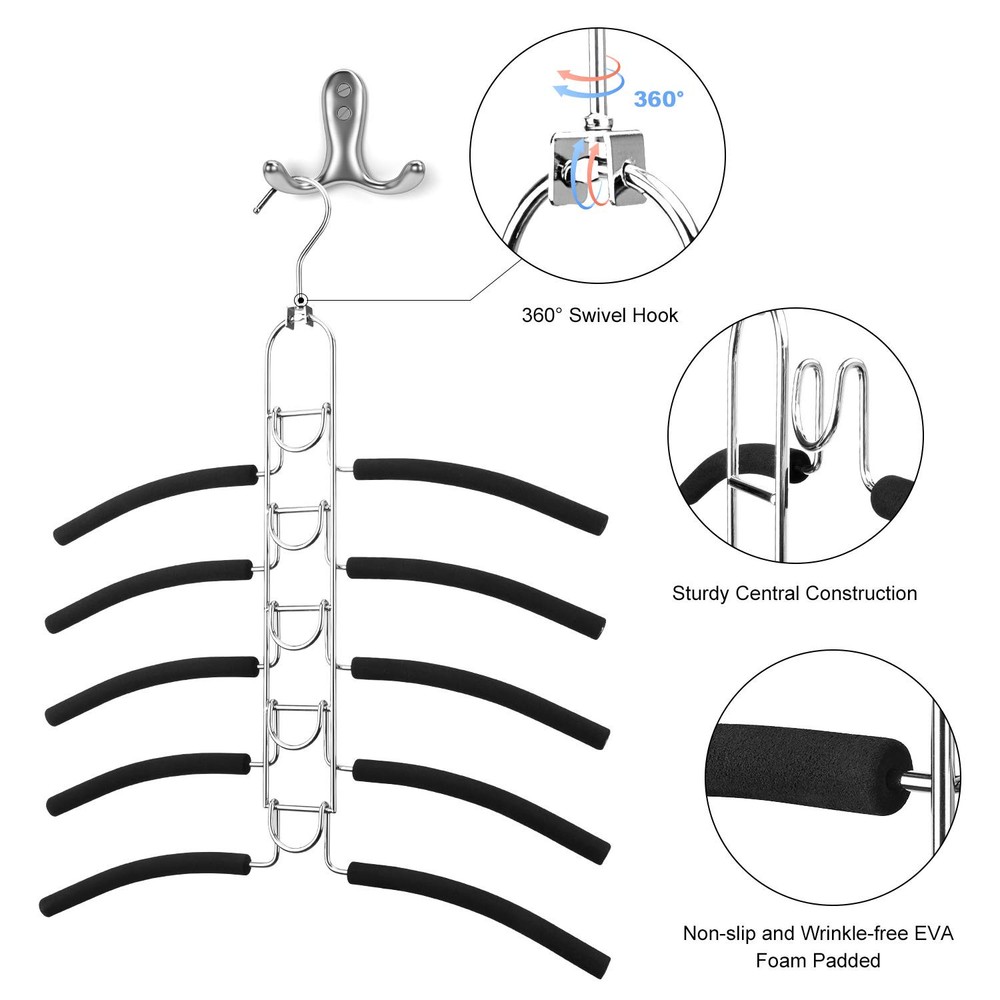 ✔【Space Saving】- Only taking up space of 1 hanger and hang up to 5 shirts, blouses, suits, jackets, coats, sweaters, pants and dresses ect. Free up to 80% space, maximize to save space in your closet and give a tidy look to it. ✔【Non Slip】- Thick non-slip EVA foam padded arms to avoid clothes falling off, leave no scratches, creases or wrinkles, help preserve clothes shape, which will make hanging clothes a simple pleasure! ✔【Sturdy Construction】- Made of premium shiny chrome and EVA foam padded ensure sturdy and durable. Rust resistant and smooth surface. Strong swivel metal hook with solid structure. ✔【Easy to Use】- This clothes hangers featuring 360-degree swivel, shiny chrome hook to easily hang clothing from any angle. And each individual hangers can be removed separately for easier to add or remove clothes. Large top hook with 2 inch mouth to widely fits closet rods. ✔【Closet Hanger Organizer】- Set of 2 metal hangers hold multiple garments, keep your closet neat and well organized. Measuring 16.3 x 21.3 Inch from top of hook to bottom of hanger.