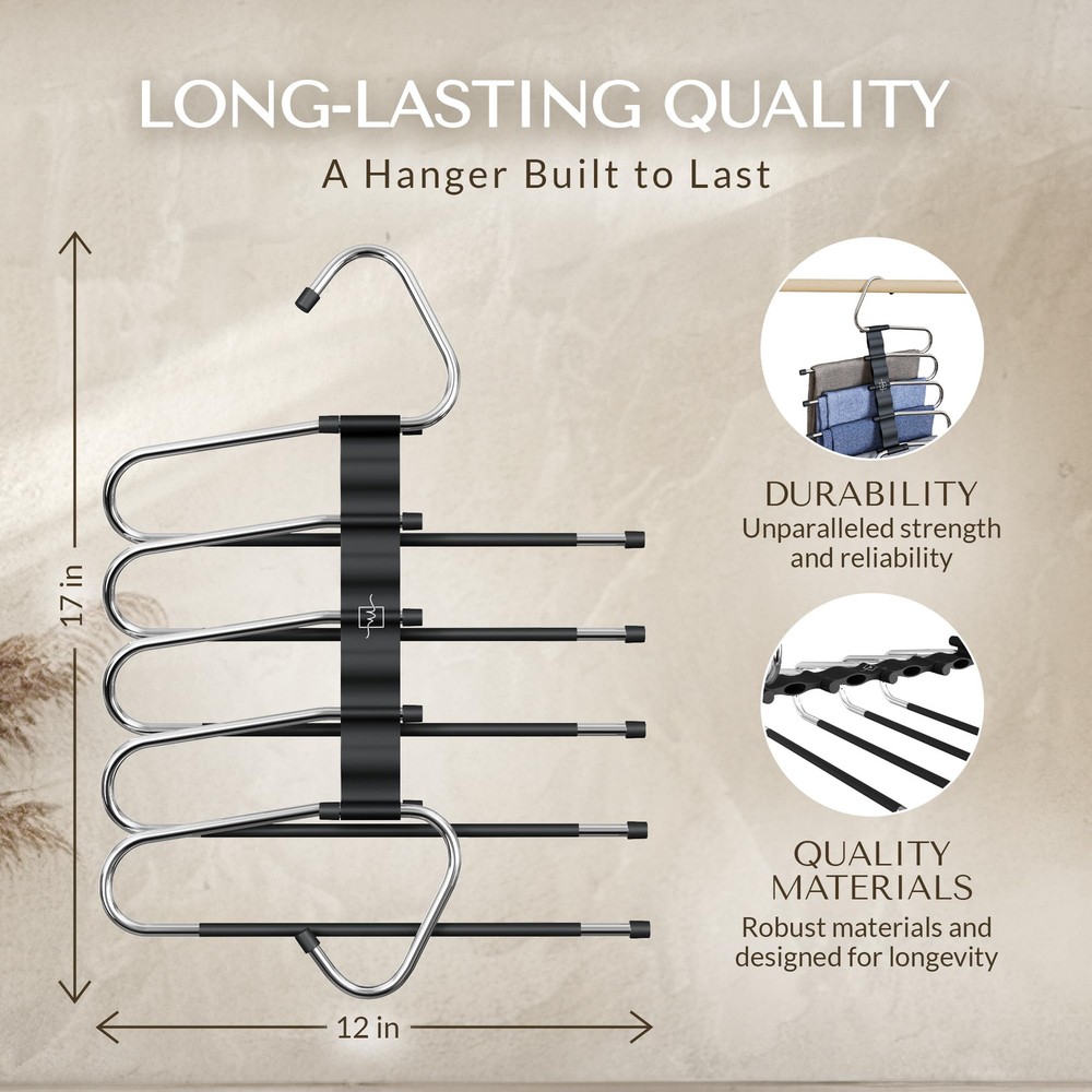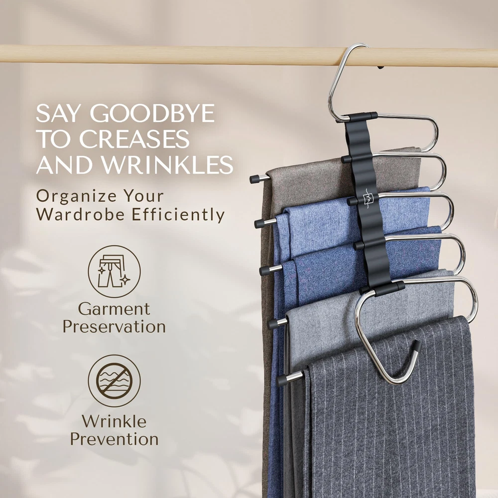 Maximize Closet Space - Transform your closet into an organized haven with our Space-Saving Pants Hangers. Each hanger features a 5-tier design, allowing you to more clothes in less space, making it perfect for small closets or maximizing any wardrobe. Versatile & Multifunctional Hanging Options - Simplify your wardrobe with these multifunctional hangers, which offer both horizontal and vertical hanging options. Ideal for organizing jeans, trousers, skirts, scarves, and slacks. Whether you’re organizing seasonal clothing or planning outfits, these hangers adapt to your needs. Secure & Convenient Design - Our Non-Slip Multi-Layer Hangers feature rods that prevent slipping and keep clothes wrinkle-free. The open-ended design allows easy hanging and removal, making daily use quick and keeping your closet organized. Durable and Sturdy Construction - Crafted from high-grade, anti-rust stainless steel and reinforced with high-quality ABS plastic, these hangers are built to last. They can support up to 10 pairs of pants without bending, maintaining their shape and strength over time. PROMISE - At , we are committed to delivering high-quality products and exceptional . We proudly stand behind our products with a no-questions-asked . If you experience any issues with your product, simply reach out to us directly through the messaging system. We're here to assist you promptly with any questions, concerns, or challenges you may have.