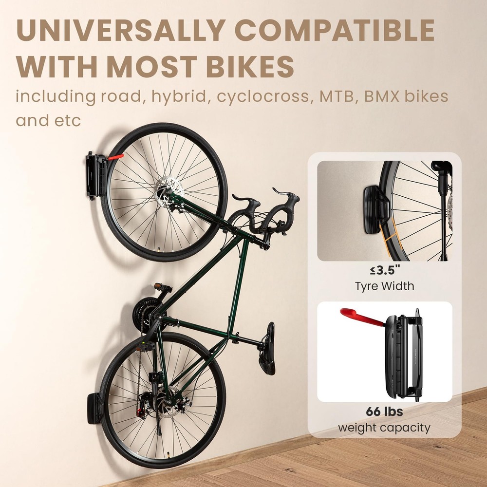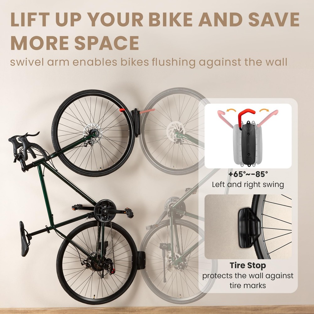 Swivel Bike Wall Mount - Garage Wall Bike Rack, Bicycle Hook Hanger - Space Saving Storage Bike Wall Holder for Home & Garage Universal Bike Compatibility: The S-BK3 bike rack is a one-size-fits-all solution. Whether you own a road, hybrid, cyclocross, MTB, or BMX bike, this rack is tailored to accommodate a variety of bicycle with a generous tire width accommodation of 3.5". Revolutionary Space Saver: Experience the future of bike storage with the S-BK3 bike rack. Its unique swivel design lets you pivot your bike effortlessly against the wall, instantly freeing up valuable space in your home, garage, or apartment Stylishly Functional: Don't just store your bike; showcase it. The SBK-3 features a chic matte black finish that complements any decor. It's not only a practical storage solution but also an addition to your home's style quotient. Uncompromising Strength: "Feel the confidence of a sturdy storage solution. The S-BK3, with its capacity to hold bikes up to 30kg/66lbs, is built to support a wide range of bikes - from road racers to hefty mountain bikes - ensuring your prized possession is securely and safely stored Join the Ranks of Satisfied Cyclists: Don't just take our word for it – join the community of cyclists who have transformed their storage woes into storage wins. Experience the blend of functionality, strength, and style that the S-BK3 offers, and see why it's the preferred choice for bike enthusiasts. The S-BK4 On-Wall Bike Rack offers a sleek and space-saving solution for storing bikes in homes, apartments, and garages. Crafted from durable steel and plastic, this wall-mounted bike rack is designed to support universal bike types up to 30kg/66lbs. Its unique DIY wall display feature coupled with a tire stop ensures that both your bike and wall stay scratch-free. Shipping We offer FREE shipping on all orders! We ship within Three business days of payment, usually sooner. We use a selection of shipping services such as UPS, FedEx, USPS etc. We only ship to the lower 48 states, no APO/FPO addresses or PO Boxes allowed. Local pickups and combined shipping options are not provided at this time. Return You can return a product for up to 30 days from the date you purchased it. Any product you return must be in the same condition you received it and in the original packaging. Please keep the receipt. Payment We accept payment by any of the following methods: PayPal Please pay as soon as possible after winning an auction, as that will allow us to post your item to you sooner! Feedback Customer satisfaction is very important to us. If you have any problem with your order, please contact us and we will do our best to make you satisfied. Contact Us If you have any queries, please contact us via ebay. We usually respond within 24 hours on weekdays. Please visit our eBay store to check out other items for sale! Thank you for shopping at our store.