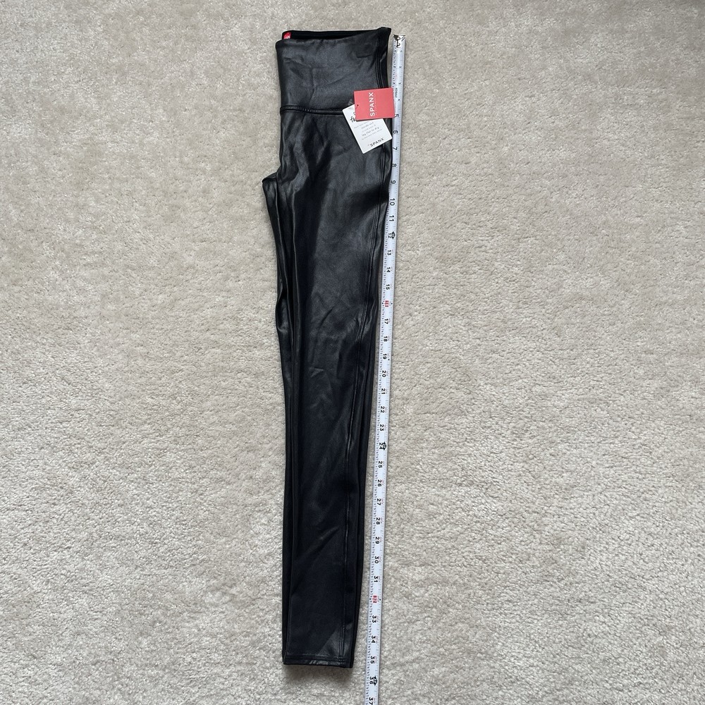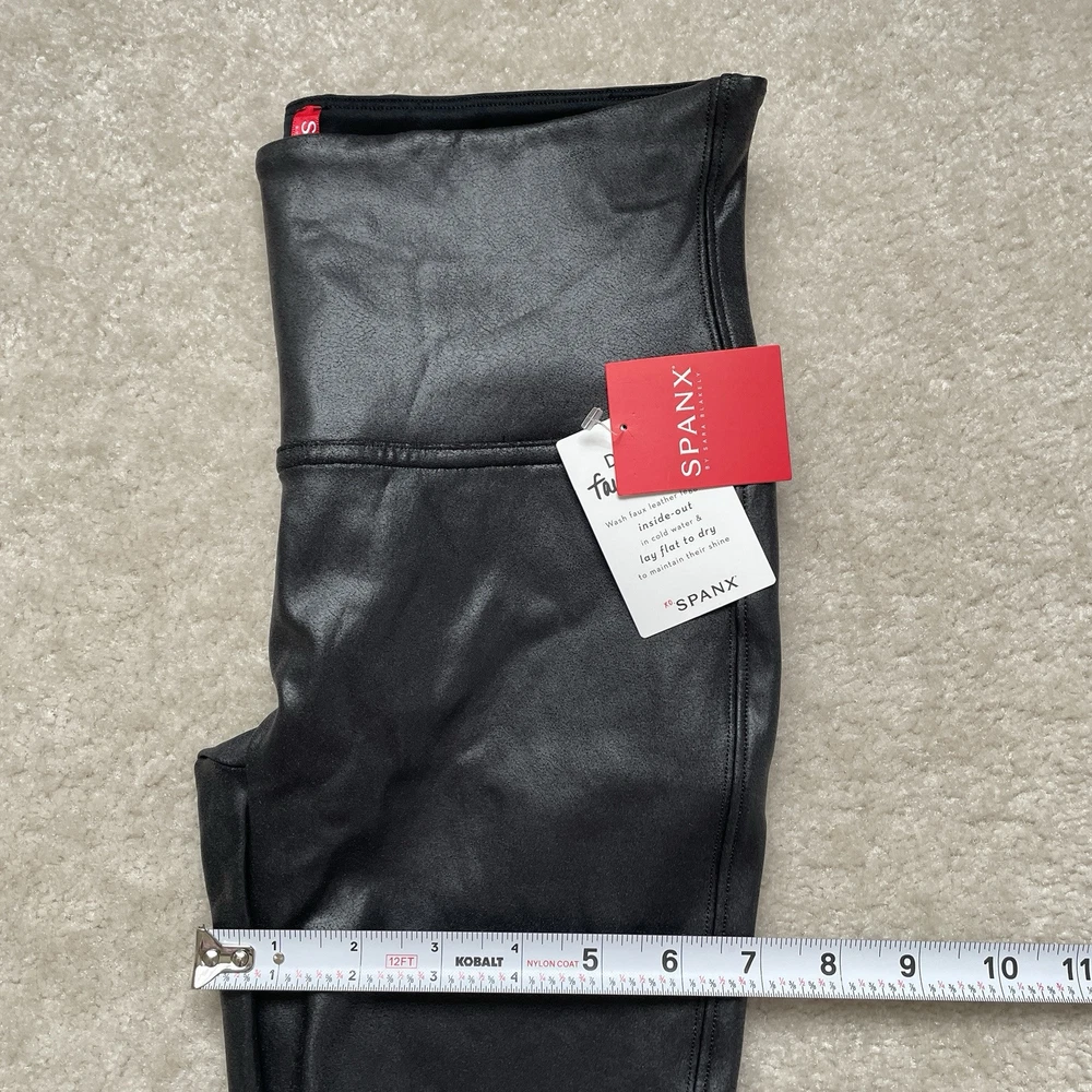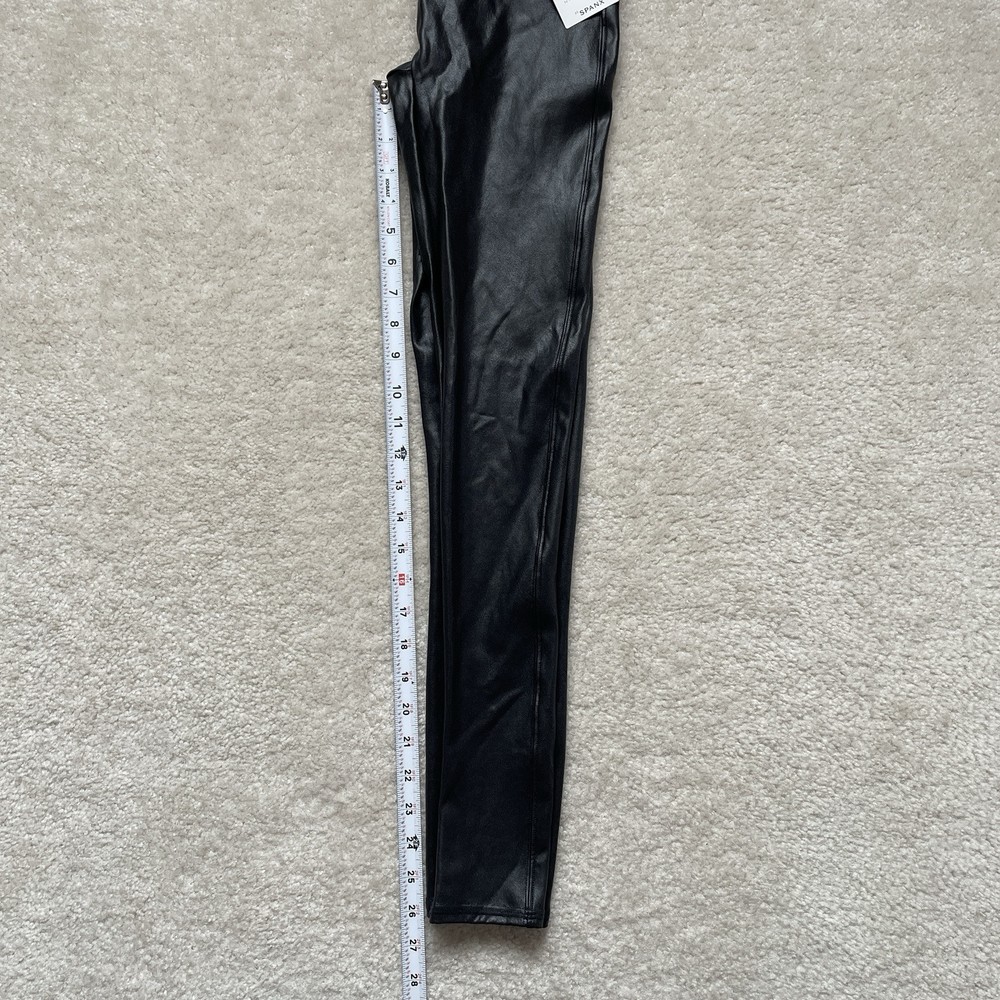Elevate your wardrobe with these Spanx faux leather black leggings, perfect for any stylish woman. These leggings come in a size medium and are brand new with tags. The blended fabric provides a comfortable stretch while shaping your figure. These leggings have it all - a sleek black color, a flattering style, and are even machine washable for easy care. Whether you're dressing up for a night out or running errands during the day, these Spanx leggings are a versatile addition to any outfit. *small blemish on right side waistband-see photo Please review photos for details, measurements and condition