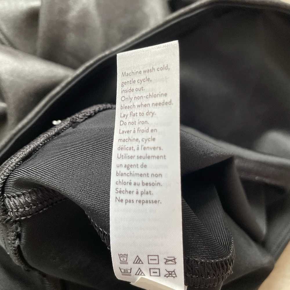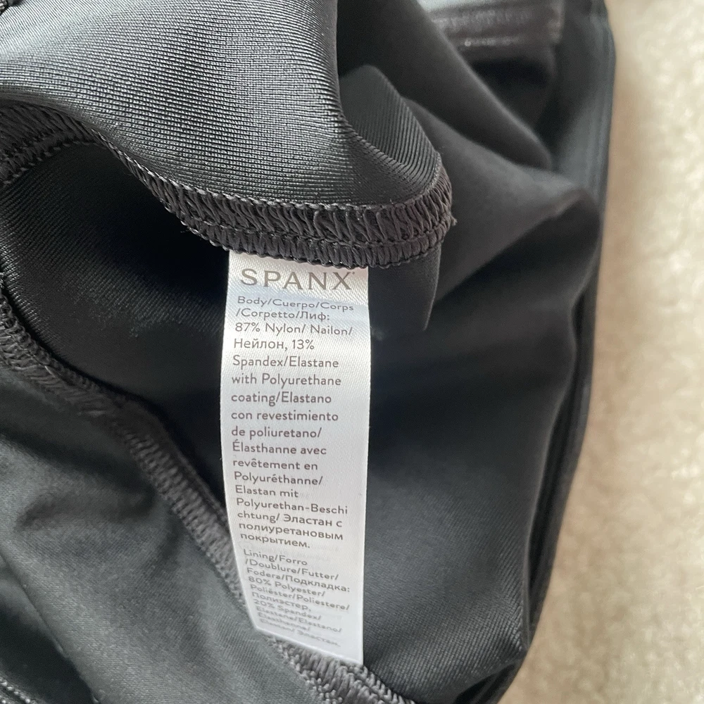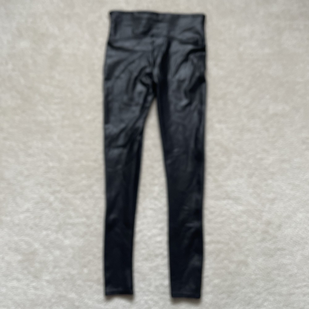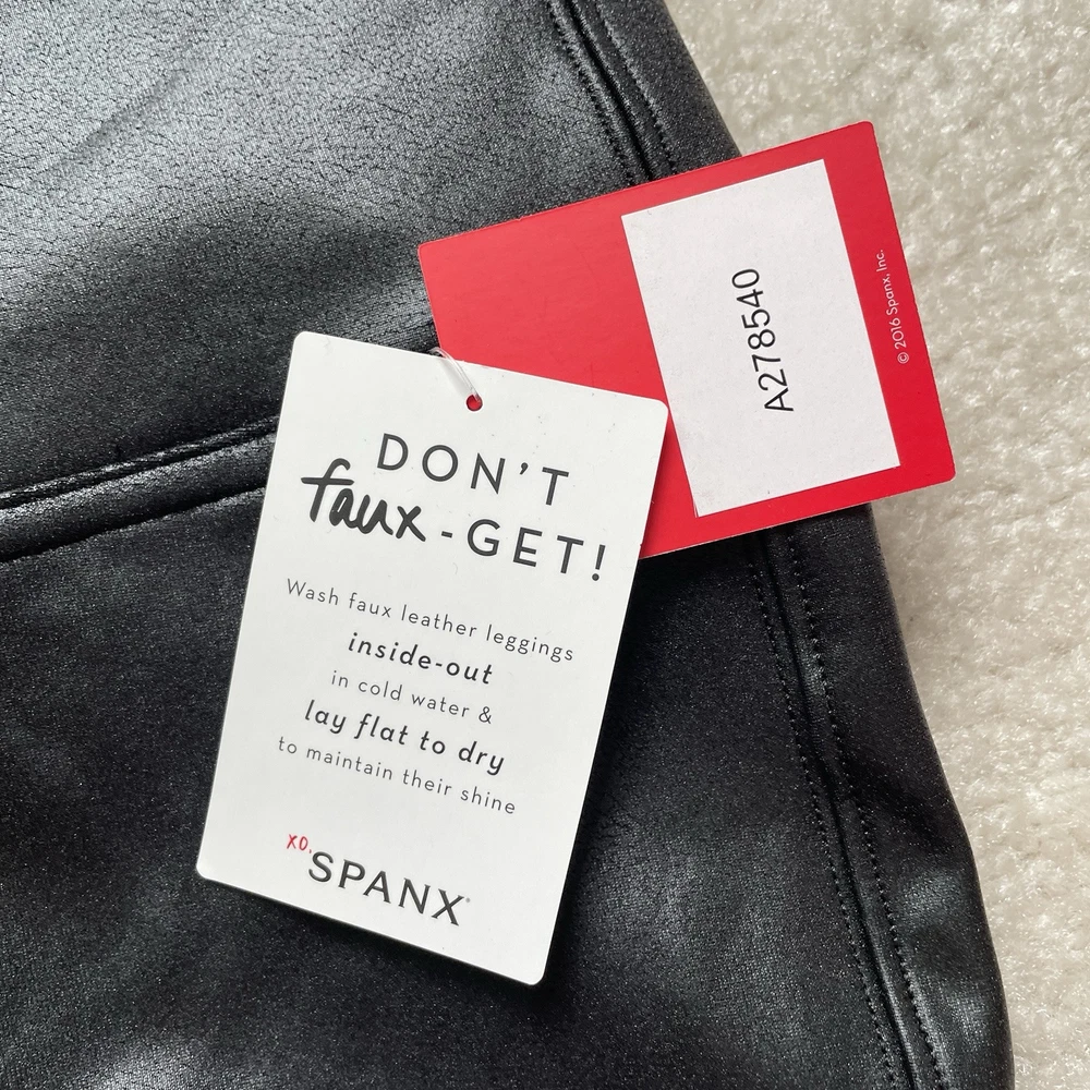 Elevate your wardrobe with these Spanx faux leather black leggings, perfect for any stylish woman. These leggings come in a size medium and are brand new with tags. The blended fabric provides a comfortable stretch while shaping your figure. These leggings have it all - a sleek black color, a flattering style, and are even machine washable for easy care. Whether you're dressing up for a night out or running errands during the day, these Spanx leggings are a versatile addition to any outfit. *small blemish on right side waistband-see photo Please review photos for details, measurements and condition