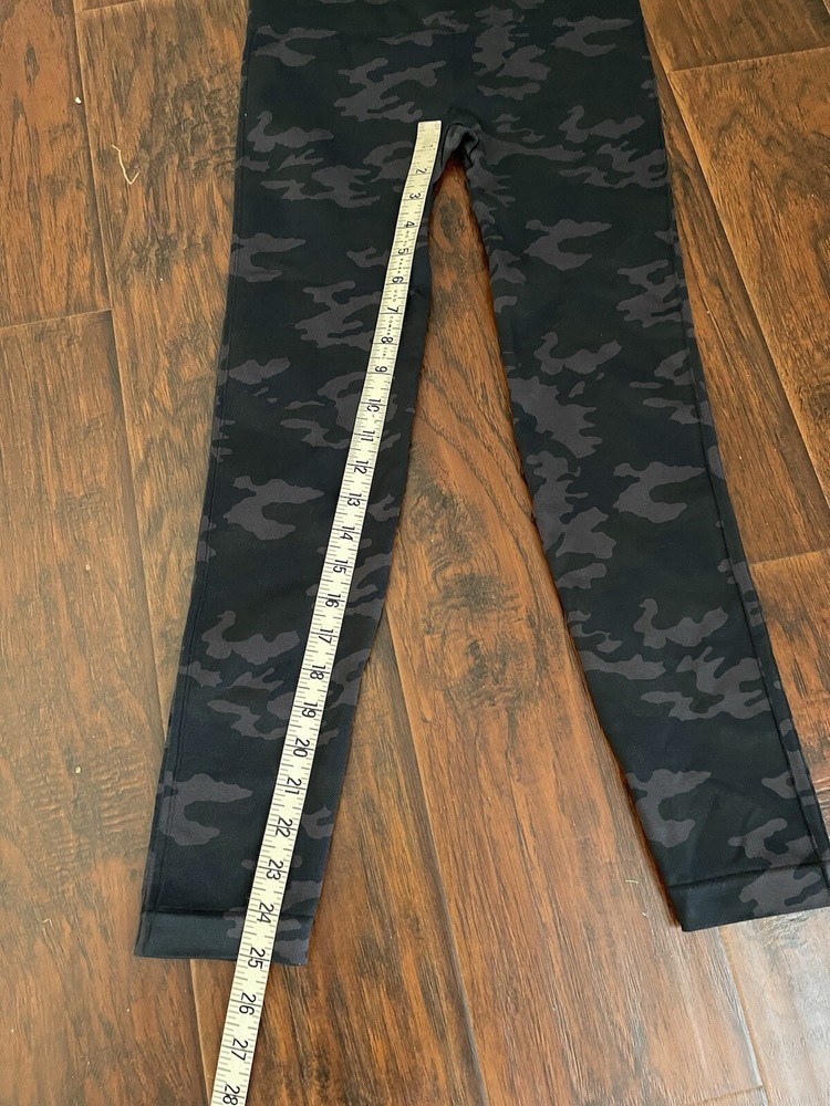 The Spanx Seamless Shaping Leggings in size L are designed for women and feature a camouflage pattern in black. These ankle-length leggings are ideal for athletic activities such as gym training, walking, yoga, and bodybuilding. They offer shaping benefits and a seamless design, making them suitable for both athletic performance and casual athleisure wear.