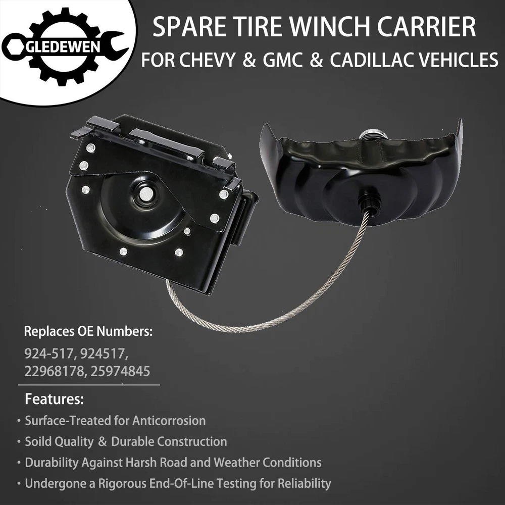 Fits the Following Vehicles: 2002-2018 Cadillac Escalade 2003-2018 Cadillac Escalade ESV 2002-2013 Cadillac Escalade EXT 2007-2013 Chevy Avalanche 2002-2006 Chevy Avalanche 1500 2002-2006 Chevy Avalanche 2500 2015-2018 Chevy Suburban 2001-2014 Chevy Suburban 1500 2001-2013 Chevy Suburban 2500 2001-2018 Chevy Tahoe 2001-2018 GMC Yukon 2015-2018 GMC Yukon XL 2001-2014 GMC Yukon XL 1500 2001-2013 GMC Yukon XL 2500 Replaces Part Numbers: 924-517, 924517, 22968178, 25974845, 15204233, 10385565, 15079644, 15148541, 15148542, 15190799, 15193543, 15198875, 15257931, 15295859, 15866166, 15866167, 15866168, 15866169, 15866170, 15868463, 19153286, 19208218, 22968178, 22968179, 25792481, 25792482, 25792483, 25912262, 25912263, 25912264, 25974846, 25974847 Quality Guarantee: 24-Month Warranty At , we take pride in the quality of our products and in your satisfaction. If you have any problems, do not hesitate to contact us. 【OEM DESIGN】This tire hoist lift is manufactured to the OE specification to provide factory-fresh appearance and direct-fit, that smoothly lift or lower the spare tyre. No more miserable experience after the improved design of removing secondary latch 【PREMIUM QUALITY】Long life-span matters, that is why our spare tire carrier is crafted from surface-treated reinforce steel for increased corrosion resistance, to outlast any other aftermarket winch available. Provide maximum durability and excellent performance 【FITMENTS】2007-2013 Chevy Avalanche, 2002-2006 Avalanche 1500 2500, 2015-2018 Suburban, 2001-2014 Suburban 1500, 2001-2013 Suburban 2500, 01-18 Tahoe | 2001-2018 GMC Yukon, 15-2018 Yukon XL, 01-14 Yukon XL 1500, 01-13 Yukon XL 2500 | 2002-2018 Cadillac Escalade, 03-18 Escalade ESV, 02-13 Escalade EXT 【REPLACE OE NUMBER】924-517, 924517, 22968178, 25974845, 15204233, 10385565, 15079644, 15148541, 15148542, 15190799, 15193543, 15198875, 15257931, 15295859, 15866166, 15866167, 15866168, 15866169, 15866170, 15868463, 19153286, 19208218, 22968178, 22968179, 25792481, 25792482, 25792483, 25912262, 25912263, 25912264, 25974846, 25974847 【24-MONTH WARRANTY】 This tire winch hoist has endurance rigorous tests to guarantee long-term dependability and increased rigidity. If for any reason at all, you are not fully satisfied with the tyre winch carrier, you can contact us through amazon message to apply the service of carefree REPLACEMENT or REFUND