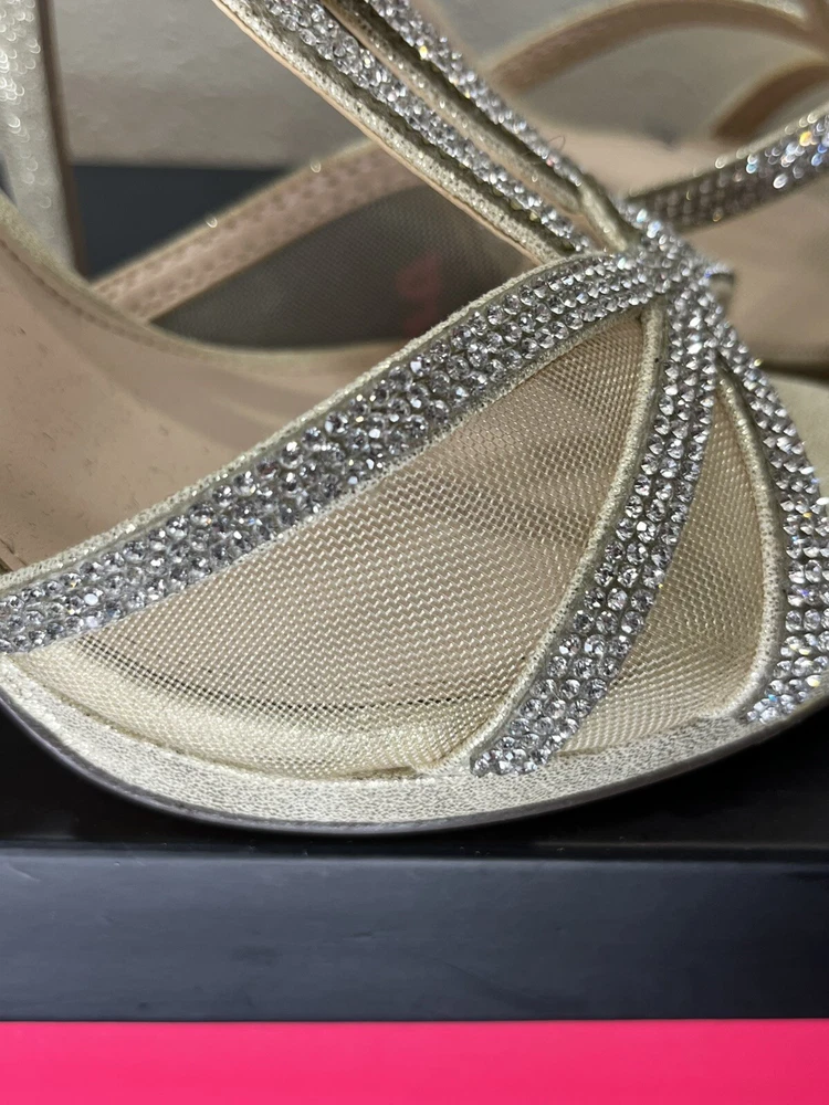 Step out in style with these Silver rhinestones on a beige base, 'Touch of Nina' Heels. The strappy sandals feature a sparkly silver rhinestone pattern with glitter and beaded accents. The open toe stiletto heels are perfect for formal occasions and add a touch of glamour to any dress. The shoes are available in women's size 7M and are suitable for various events. The synthetic upper material ensures durability, while the stiletto heel style provides a chic and elegant look. Absolutely gorgeous pair of shoes. Perfect for prom, homecoming, any formal event. These shoes are an excellent condition and barely show where if it were not for a little soil on the bottom of the SOLE. These issues come in their original box.