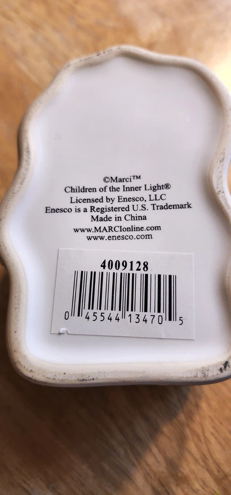 This trinket box is in great condition. There are no chips or cracks that can be seen. It is 4" long X 3" wide X 2" deep.