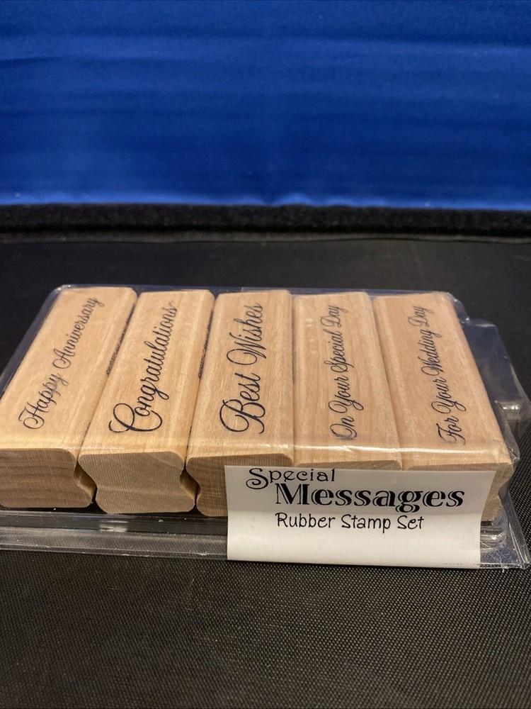 The "SPECIAL MESSAGES SET" by Stampendous is a collection of 5 wood-mounted rubber stamps designed for various crafting activities like rubber stamping and scrapbooking. These stamps are specifically intended for use in card making and paper crafting projects, allowing users to add special messages to their creations. Made in the United States, this set features high-quality rubber stamps that can be used repeatedly for creating personalized and unique crafts. Each stamp in the set is mounted on wood, providing durability and ease of use for crafters of all skill levels.