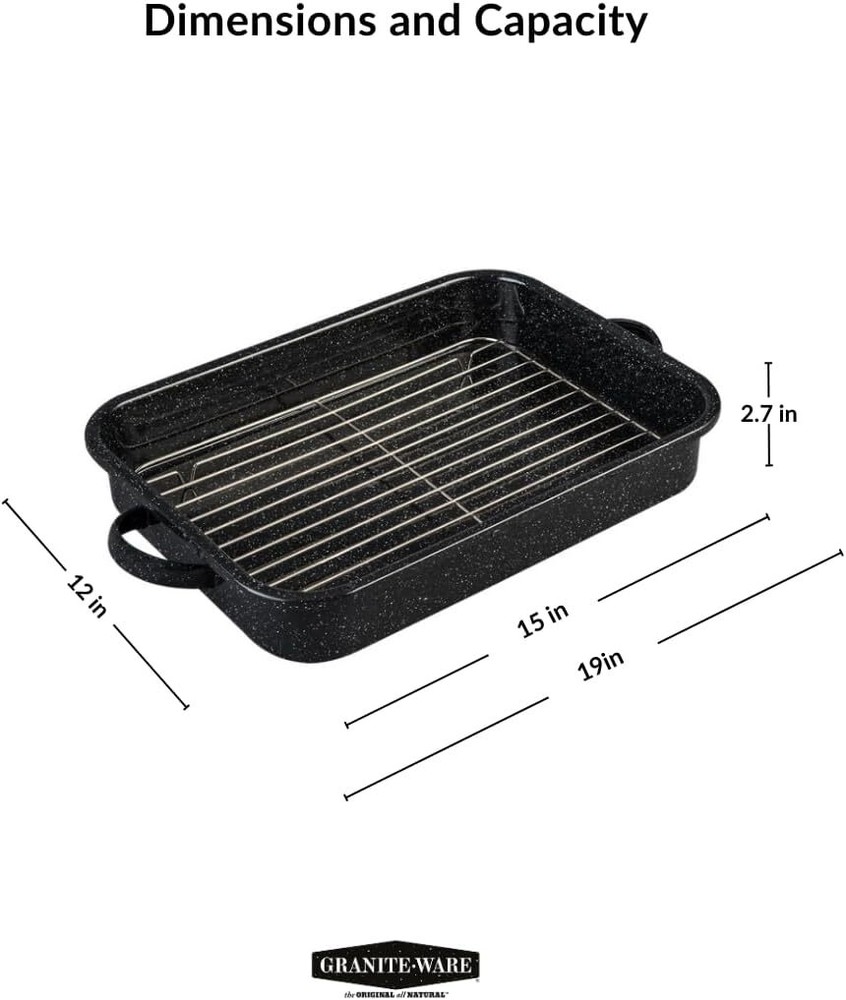 Open Roasting Pan with Flat Rack (Speckled Black) - Accommodates up to 25 lb poultry or roast. CAPACITY: The 19 inch Roasting Pan is ideal fot preparing medium-large cuts of meat, poultry, or other dishes, accomodates up to a 25 lb poultry or roast. Resistant to temperatures up to 932°, providing versatile cooking options. DISHWASHER SAFE: Effortless cleaning is at your fingertips with this feature, ensuring it's safe to be placed in the dishwasher. This not only saves you valuable time but also minimizes effort, especially after a satisfying meal. VERSATILITY: Beyond its primary function, this pan proves itself indispensable for baking, broiling, grilling, or even serving. Its unique construction ensures even heating and faster cooking times, adding a touch of efficiency to your culinary endeavors. CHEMICAL-FREE: Our product is free from harmful substances like PFOA and PTFE, ensuring a cooking experience that is both safe and reliable. By eliminating these chemicals, we reduce the risk of exposure, promote environmental sustainability, and provide you with the confidence to enjoy your meals. The glass interior preserves the natural taste of your food without any alterations. DURABLE AND REUSABLE: Our product boasts a long-lasting color glare that remains intact for many years, ensuring both aesthetic appeal and functionality. Moreover, it won't compromise the taste of your food; in fact, it enhances flavors! The inert glass surface doesn't absorb foods, guaranteeing that the taste remains unaltered, setting it apart from other surfaces.