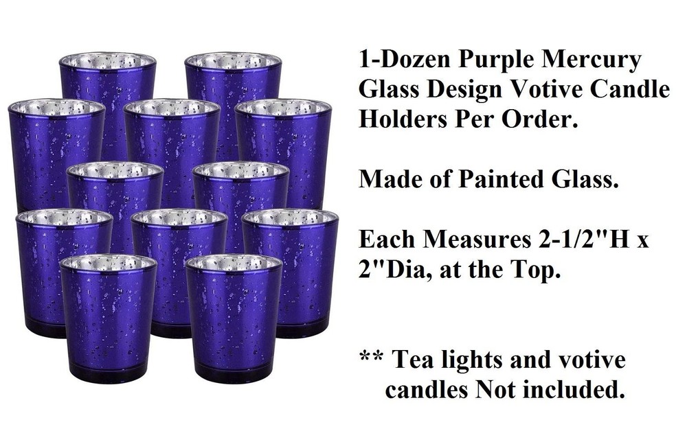 Speckled Purple Mercury Glass Votive Candle Holders 12-PC Party Holiday Decor Speckled Purple Mercury Glass Votive Candle Holders 12-PC Party Holiday Decor Click image to enlarge Description Speckled Purple Mercury Glass Votive Candle Holders 12-PC Party Holiday Decor. These lovely votive holders are the perfect complement to a purple-themed event. Great for wedding receptions, bridal showers, baby showers or birthday gatherings, these votive holders may be small, but provide a big boost to your purple decorations. Details: Includes 1 Dozen Holders Each Measures 2 1/2"High x 2"Diameter Each Made of Glass Can Be Used for Either Flame or No-Flame Candles Recommended for Votive Style Candles Candles Not Included ~Buy more than one item at the same time from our eBay store and save in shipping costs!~ (If buying different items, just put them all in your cart before paying, to get the combined shipping discount!) WARNING TO CALIFORNIA RESIDENTS: The materials used as colored decorations on the exterior of this product contain lead and/or cadmium, chemicals known to the State of California to cause birth defects or other reproductive harm. For more information, go to www.P65Warnings.ca.gov/product Shipping We use UPS SurePost, UPS, USPS and FedEx SmartPost to deliver our products to your home, depending on which method is more efficient for your order. We use suppliers for some of our orders and our suppliers will choose the service that is used for these orders. PLEASE MAKE SURE YOUR ADDRESS CAN BE VERIFIED BY USPS. Please allow 7-10 days for the item to reach your home. We cannot be responsible for items shipped to incorrect or incomplete addresses, which may result in the cancellation of your order. YES, we do combine shipping! The highest shipping cost item ships at regular price, and each additional item ships at $2.00 more in additional shipping charges. If you are buying several different items from our store, put them all into your cart before paying to get the combined shipping discount. Terms of Sale Unless otherwise noted, we accept returns up to 30 Days after your purchase, through the eBay Returns System. Please use eBay to contact us if there is any problems or issues with your order. In some cases, we order the item purchased from one of our suppliers, and it is shipped directly from our supplier to the customer. There are times when an item unexpectedly becomes unavailable from our supplier. We do our best to check on all of the items availability several timea a day. If an item is unexpectedly unavailable, we will issue a refund immediately. Contact Us Please use the message center in eBay to contact us. We check our message box in eBay several times a day. If you have any questions or concerns with your order, please feel free to contact us. We care very much about our customers being 100% happy with their purchases. We would very much appreciate you letting us resolve any issues you may have with your order by contacting us first, before taking any other unnecessary actions. Pictures sell! Auctiva offers Free Image Hosting and Editing. Showcase your items with Auctiva's Listing Templates! THE simple solution for eBay sellers. Track Page Views With Auctiva's Counter