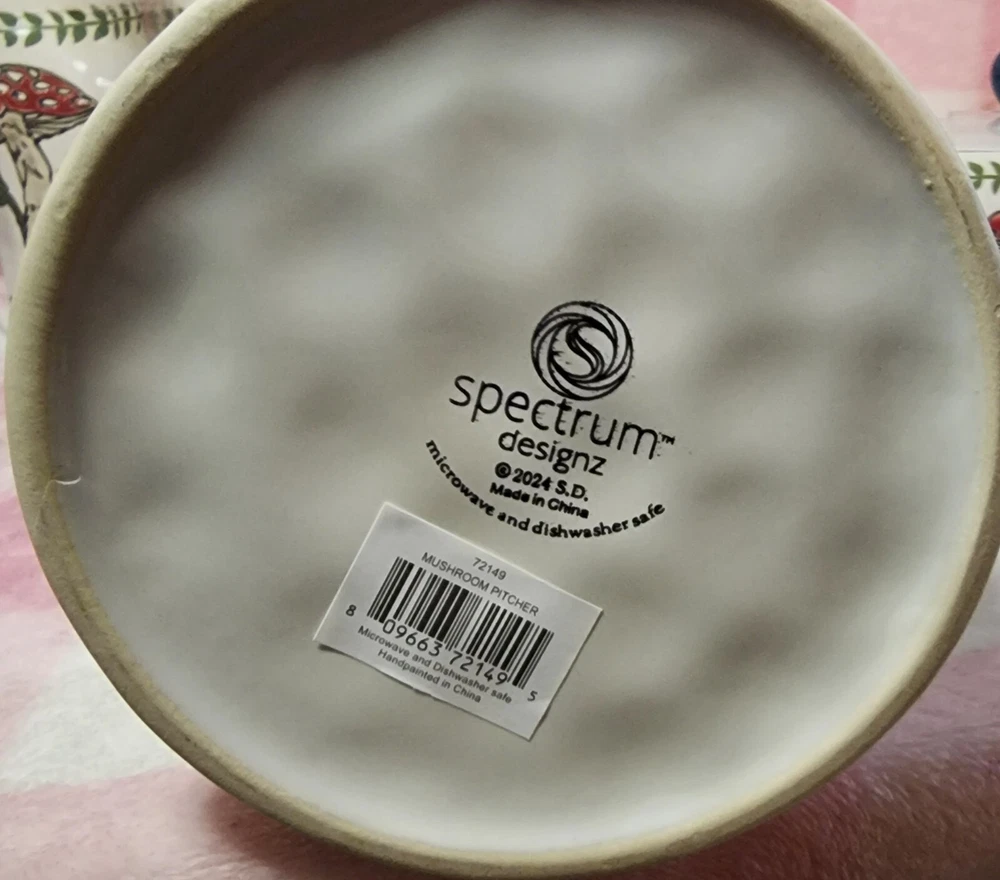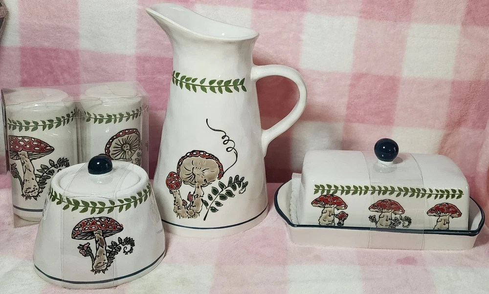 Beautiful ceramic seven piece serving set from Spectrum Designz in whimsical cottagecore mushroom design. Includes pitcher, butter plate with lid, sugar dish with lid, and salt & pepper shakers. Ships with care next business day from smoke-free home.