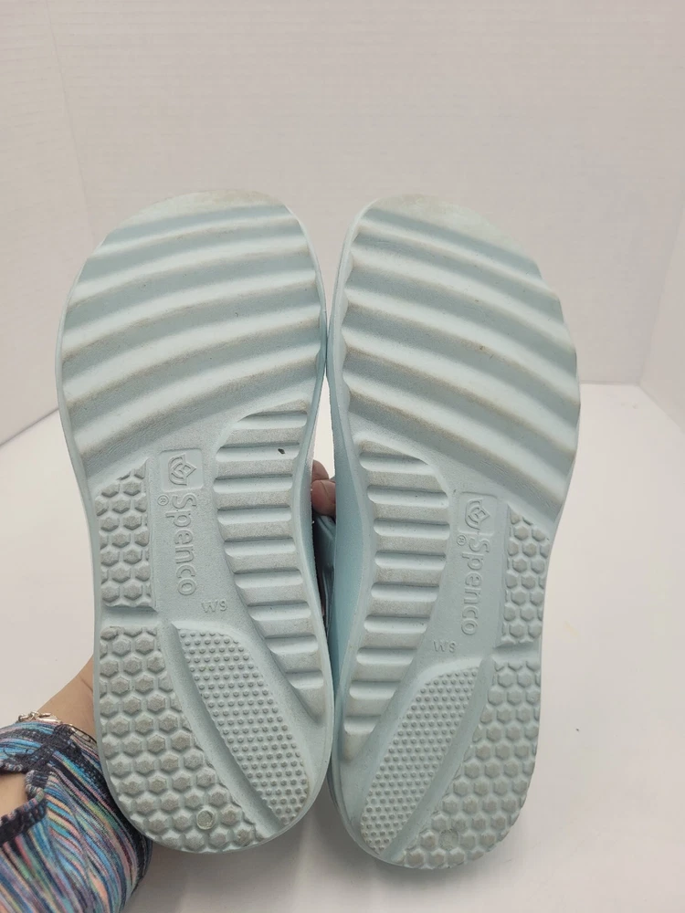 Step up your comfort game with these Spenco Fusion Slim slide sandals. Designed with arch support, cushioning, slip resistance, and orthopedic features, these sandals are perfect for all-day wear. They are lightweight, waterproof, and breathable, making them ideal for winter, summer, fall, and spring. These sandals have a round toe shape, slip-on closure, and a flat heel style. The light blue color, strap accents, and solid pattern give them a modern and beachy vibe. These sandals are perfect for travel, activewear, casual wear, and more. Get ready to enjoy your all-day comfort with these Spenco Fusion Slim slide sandals. X