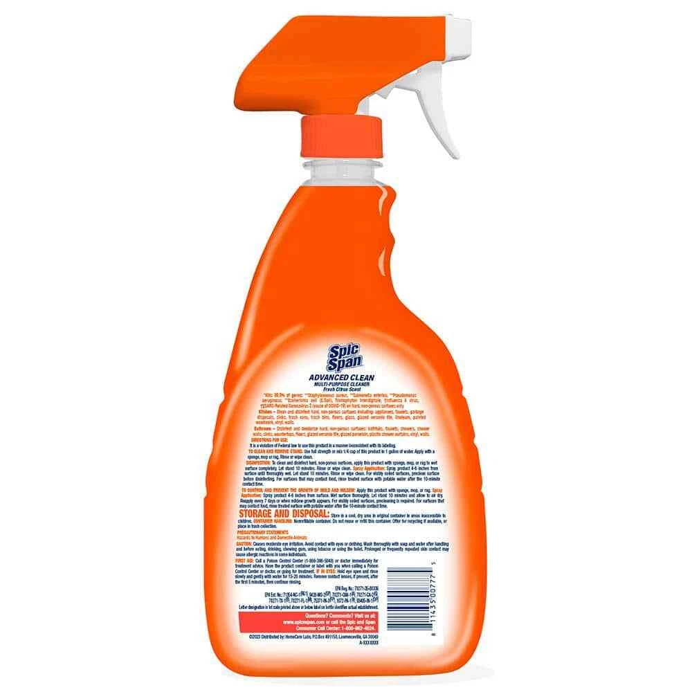 Spic and Span 32 oz. Advanced Clean All Purpose Cleaner and Disinfectant Spray, Fresh Citrus Formulated to kill bacteria and viruses Ideal for cleaning tough grease and grime Suitable for use on hard and non-porous surfaces Disinfects hard surfaces around your home, including glass Fresh Citrus scent leaves your home smelling fresh and clean Non-porous surfaces in the home or on the job site Use in kitchens and bathrooms on washable hard, nonporous surfaces of sinks, tubs and appliance exteriors Cuts through grease and grime Fresh citrus scent Fresh Citrus Scent Spic and Span Everyday Antibacterial Spray is an effective all-purpose cleaner which disinfects and kills household bacteria and viruses around the home or on the job site. Use this product to cut through grease and grime on washable hard, nonporous surfaces including kitchens and bathrooms. for ingredient information, questions and comments visit us at SpicnSpan.