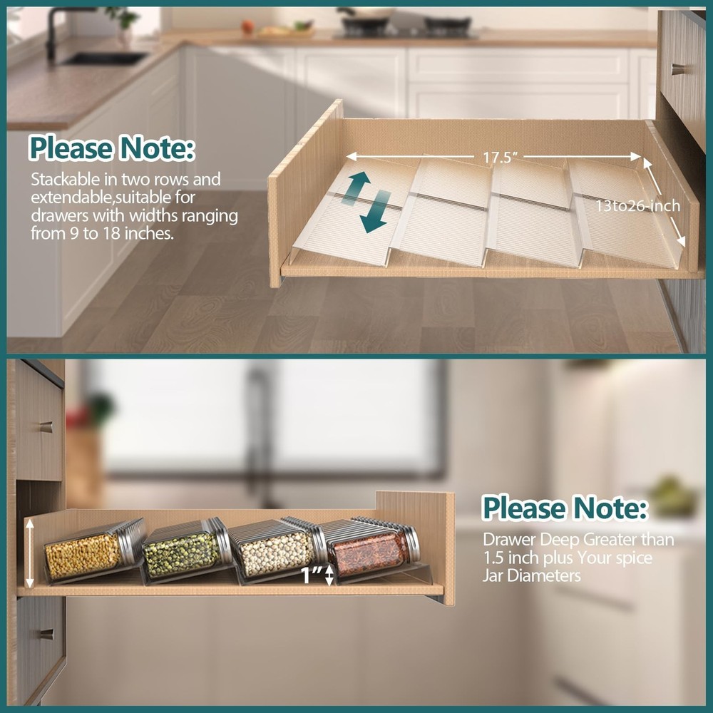 Spice Drawer Organizer, Spice Rack Drawer for Kitchen,4 Tier Clear Acrylic, Expandable From 13" to 26" Spice Rack Tray for Cabinet/Countertop(4 Pcs Clear) Product Details Color: Clear-4 Pcs Brand: SZWQILIN MPN: zc-1 UPC: 705735965616 EAN: 0705735965616 Material: Acrylic Color: Clear-4 Pcs Special Feature: Spice Drawer Organizer Product Dimensions: 13"D x 4.3"W x 1"H Shelf Type: Drawer Spice Rack Material: Acrylic Color: Clear-4 Pcs Special Feature: Spice Drawer Organizer Product Dimensions: 13"D x 4.3"W x 1"H Shelf Type: Drawer Spice Rack Number of Shelves: 4 Room Type: Kitchen Assembly Required: No Mounting Type: Tabletop Brand: SZWQILIN Is Customizable: No UPC: 705735965616 Manufacturer: SZWQILIN Part Number: zc-1 Item Weight: 14.4 ounces Item model number: zc-1 Special Features: Spice Drawer Organizer Batteries Included?: No Batteries Required?: No Date First Available: March 19, 2024 - Expandable design: The spice drawer organizer is designed to expand from 13" to 26", making it suitable for various drawer sizes and ensuring maximum storage capacity. Fits your drawers, cabinets or countertops,and can hold up to 64 standard 4-ounce spice jars. 4-tier organization: With four tiers, this spice rack drawer provides ample space to store and organize your spices, seasoning packets, and other kitchen essentials in a neat and accessible manner,The angled design opens the drawer and the labels of the spice bottles are visible at a glance Easy to clean: The smooth surface of the organizer allows for effortless cleaning. Simply wipe it with a damp cloth or wash it under running water for quick and convenient maintenance. Premium Materials: Made of high-quality acrylic material, this spice organizer is sturdy and built to last. It is resistant to scratches, cracks, and stains, ensuring long-term usability. Stylish and practical: The Clear acrylic and sleek design of this spice rack drawer organizer add a touch of elegance to any kitchen decor. It not only keeps your spices organized but also enhances the overall aesthetic appeal of your kitchen space. also good for organising nail polish, lipstick, perfume or some medicine bottles