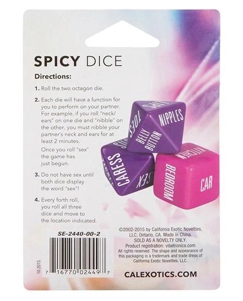 Enjoy unlimited erotic possibilities with the raunchy Spicy Dice. The adult fun game is designed for acreative and erotic play that directs and controls your pleasure and ecstasy. Share the thrill of chancing your luck on the roll of a dice, by throwing 3 dices and following the suggestively sensual instructions. Take turns to gamble your way to ultimate climax satisfaction. The game comprises of 3 colored dice. The 2 octagonal dice feature playful and arousing functions for you and your lover to perform on each other. The classic square die indicates the perfect location for your steamy spontaneous pleasure. Take turns rolling the dice, and following the instructions for at least two minutes. Enjoy tickling toes or caress privates until your time is up. Once your lover throws the dice, you can relax and enjoy your turn at receiving the heightened sensuous pleasure. The game is suitable for thefirst time and experienced users who want to ramp up the fun. Take a chance and satisfy your lover by following the rules of the game. No matter how aroused and turned on you get you cannot have sex until both dice display the word 'sex.' Roll the dice and play out your determined choices until you get lucky. The fully portable, travel-sized intimate party game can be used for spontaneous play whenever you go. Spice up your seduction technique and explore endless possibilities for red-hot and passionate trysts. ----------------------------------------------------------------------------------------------------------------------------------------------- Extra Discount Offer Order from our Website and save more money than Ebay. Please DM us "WEBSITE LINK" CLICK HERE :> Chat with us save up to 20% Extra OFF on every orders. We are available 24*7 eBay Store: https://www.ebay.com/str/qualitykinghub ----------------------------------------------------------------------------------------------------------------------------------------------- Why Shop With Us? 1. Our goal is to provide the best customer service. All Inquiries are answered within 24 hours and our friendly customer service team aims to resolve any issues quickly and effectively. 2.We will provide you with free & fast delivery. Your order would be shipped out within 1 business days and to your doorstep excluding oversized items. 3.We are always here to help the best possible way we can. We are constantly improving our services and hope you will keep coming back. Please do not hesitate to leave us your 5 Star ★★★★★ positive feedback if you are satisfied with our products ,delivery or services. As a seller , Positive Feedback is very important to us. We try our best to make our customers happy. If you have any question about your order, please contact us ,please let us know before you Leave the Negative feedback ,We are willing to do our best to make up for it, Thank you very much ! ----------------------------------------------------------------------------------------------------------------------------------------------- Shipping Policy We use different suppliers across the US to ensure your item is delivered as fast as possible.We provide FREE SHIPPING within the United States. We believe in quality and long term relationship with our respected customers. We Ship Only In the USA and 99% orders Shipped same business day and deliver to our customers within 3-5 days. ----------------------------------------------------------------------------------------------------------------------------------------------- Payment Policy We want to ensure all our buyers are offered all the benefits that eBay has to offer.In order to ensure all our buyers to qualify for eBay Buyer Protection Program, we accept only payments through PayPal. PayPal allows you a variety of payment options quickly and securely. We require immediate payment in order to ensure all our customers have equal access to our inventory. ----------------------------------------------------------------------------------------------------------------------------------------------------------------------------------------------------------------------- Return Policy Every item is 100% brand new direct from the manufacturer (no exceptions). All items must be returned in its original packaging and all parts must be included If a product is damaged or broken, notification must be received within the first 5 business days when the product is delivered. During returns, the package will be inspected before a refund is issued. ----------------------------------------------------------------------------------------------------------------------------------------------------------------------------------------------------------------------- Contact Us If you have Any Questions Or Unsatisfied with your purchase, please Email us firstly to get a better solution before you leave a neutral or negative feedback, we work hard to make sure every customer is 100% satisfied and resolve any problem for you. Please email us first in the following situations: 1.The item can't work properly. 2.The item broke on the post. 3.You bought or received the wrong items. 4.You have not received your shipment within the period. 5.Before you give us Negative feedback. 6.Before you open a case/return on eBay. All questions will be replied within 24 hours (Except Saturday and Sunday or holidays). Thank you for your kindness! -----------------------------------------------------------------------------------------------------------------------------------------------------------------------------------------------------------------------