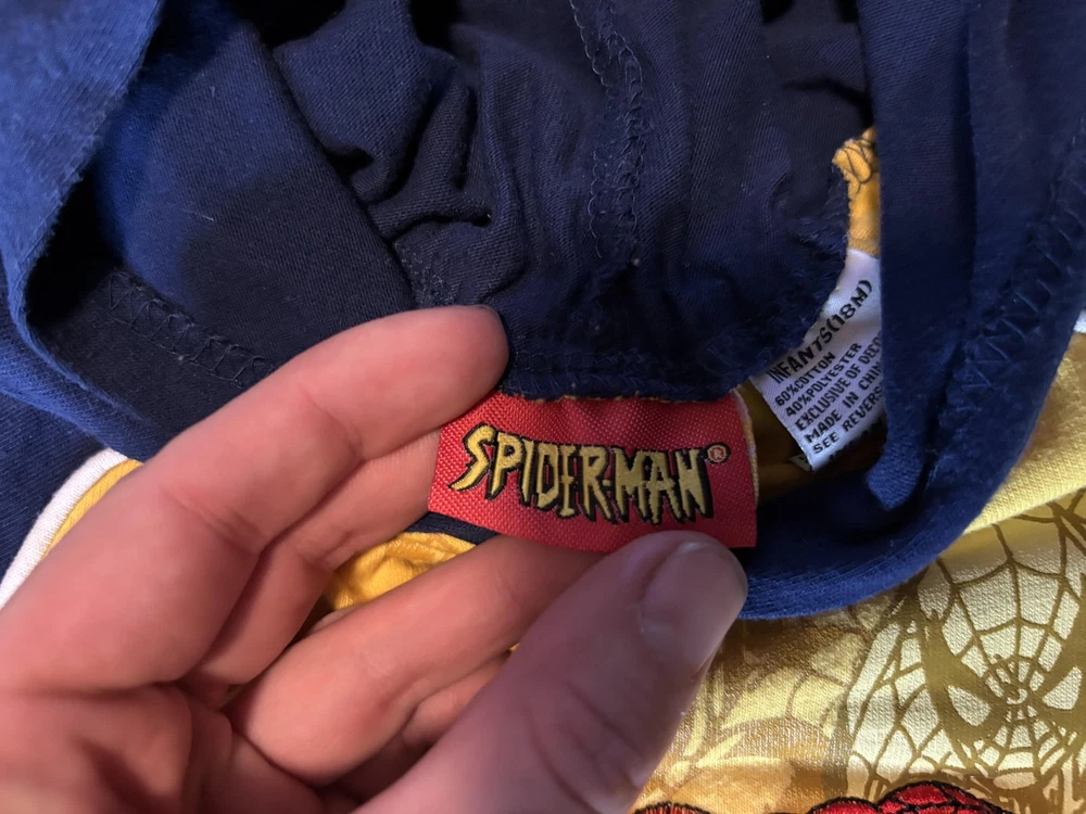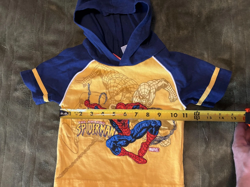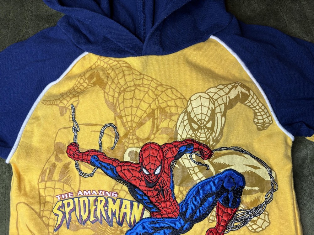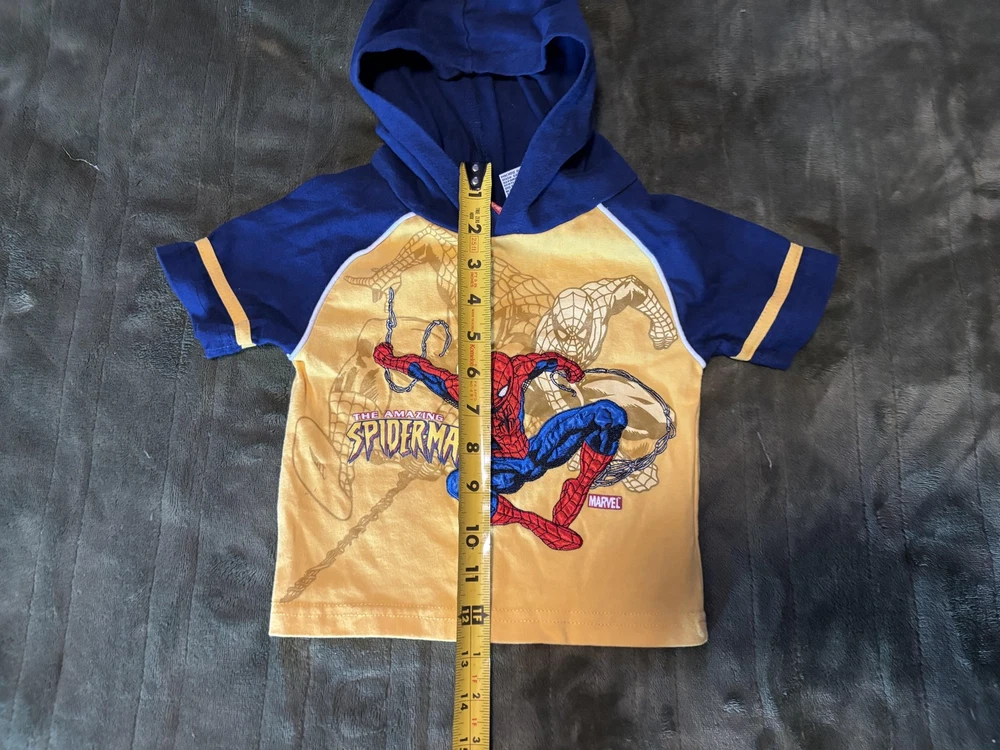 Brand: Spider-Man / Marvel Style: Boys hooded short sleeve graphic shirt with pullover design Size: Infants 18M (approx 18-24 months) Material: 60% cotton, 40% polyester; yellow body with blue hood and sleeves and white piping trim Design details: Front features large embroidered and printed The Amazing Spider-Man graphic with swinging Spider-Man artwork and Marvel logo, contrast sleeve cuffs with yellow stripe, soft knit hood Tag details: Made in China; RN 46795; style #64672004; UP #9550518247; 2006 Marvel Characters, Inc. Care: Machine wash cold with like colors, gentle cycle, tumble dry low, do not iron on print Keywords: Spider-Man shirt, boys hooded tee, Marvel superhero top, toddler graphic T-shirt