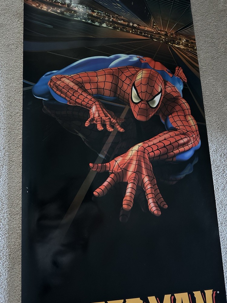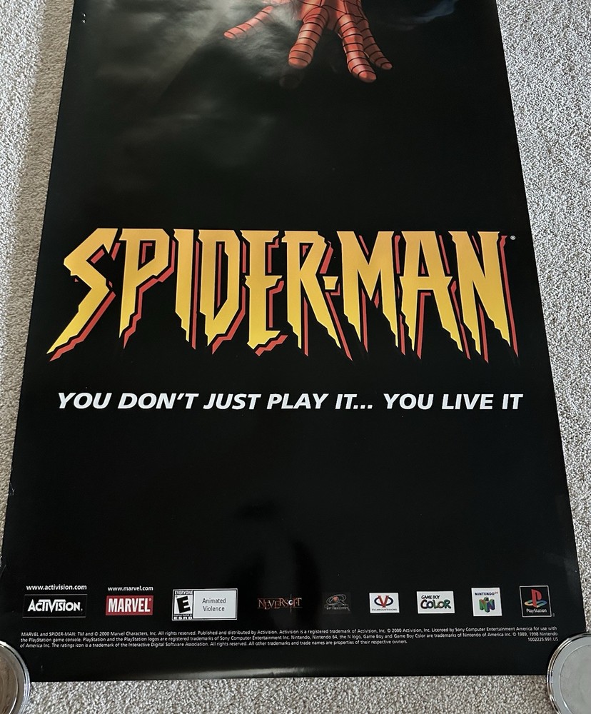 The product is a Spider-Man video game poster featuring the popular Marvel character on the Sony PlayStation and Nintendo 64 consoles from the year 2000. This poster is part of the Marvel product line and showcases Spider-Man as the main character in the Spider-Man video game series. Perfect for fans of the superhero genre, this vintage poster would be a great addition to any gaming or comic book collection. 10-22-25