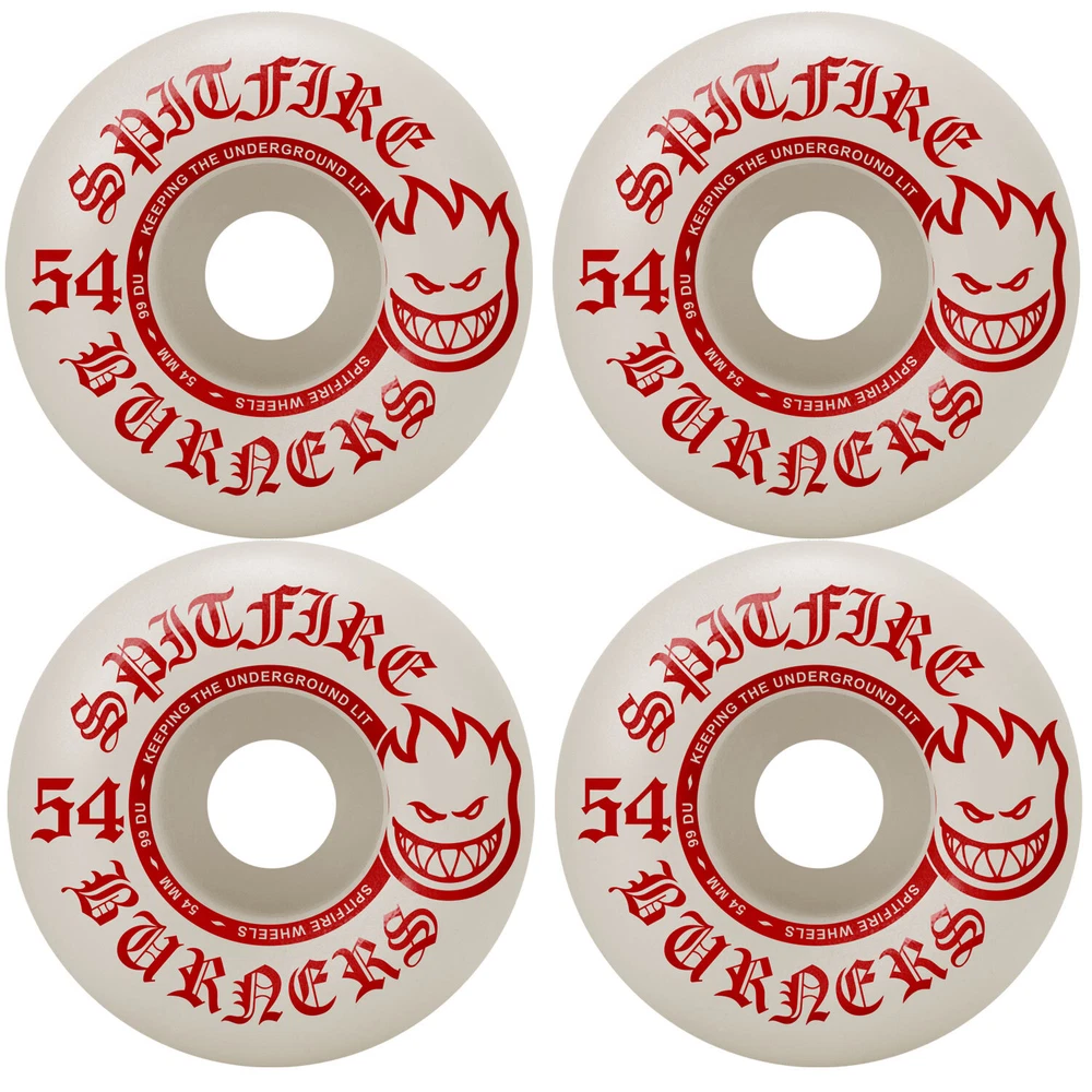 Product Description Spitfire Skateboard Wheels Burners 54mm 99A White/Red with Abec 5 Bearings This package includes 1 set of wheels (4wheels) and 8 bearings. The newly developed burners offer a new tier in Spitfires line. Using a unique new urethane, the burners provide an option for any skater looking for a high-quality wheel that’s great to ride and doesn’t sacrifice performance for the price. Poured in the Bighead shape, 99A durometer hardness. 54mm x 34.5mm. Amp Bearings are the epitome of durability and speed. These high-quality ABEC 5s feature enhanced corosion resistance, and hardened steel balls to ensure long lasting durability. Pre-lubed with Amp Synthetic Speed Oil. BRAND Spitfire MODEL Burners SIZE 54mm COLOR White/Red CONDITION Brand New The feeling of a new set of wheels is second to none. Well, maybe it’s second to saving a bunch of money. Get the best wheels at the best price from TGM Skateboards. We have hundreds of wheels available, no matter what you are looking for. Traditional skate wheels, cruiser wheels, longboard wheels…we’ve got them all at the absolute best prices available! Wheels are measured by Diameter (Width) and Durometer (Hardness). 50mm to 54mm with a hardness of 99A – 101A is the most common size wheel for street and park skaters, while 55mm to 64mm is typical for bowl and old school skaters. The larger the wheel, the longer the roll. The softer the wheel, the smoother the roll. Softer wheels are great for rough terrain and are also quieter (which is why filmers prefer large, soft wheels). Ultimately, it comes down to personal preference and the type of terrain the skateboard will be ridden on. 17 years being eBay's premier skateboard retailer with 350,000 positive feedback! With over 20,000 items in stock, we are experts on all aspects of skateboarding, longboarding, customer services, shipping speed and bang for your buck. Copyright ©2018 TGM Skateboards | All Rights Reserved