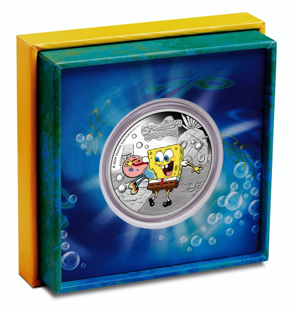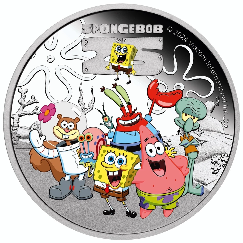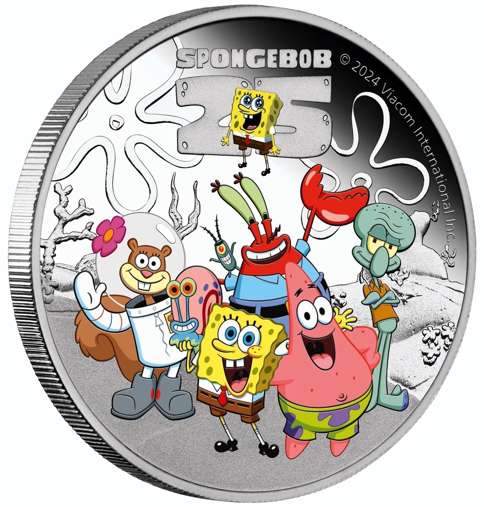 SpongeBob and friends Country: Tuvalu 2024 Metal: 9999 silver Weight: 1 oz Mintage: 5000 Quality: proof COA: Yes BOX: Yes