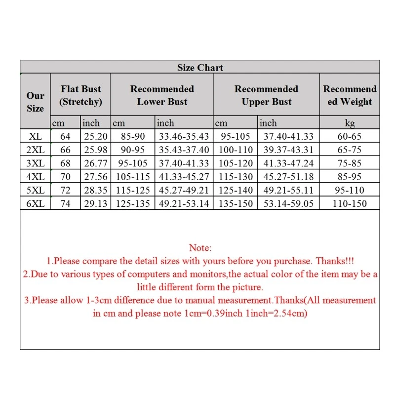 Sports Yoga Bra for Women No Underwire Padded Vest Plus Size Backless Underwear Features: and high Wide shoulder straps and wide band hem, to provide more support for your bust. With removable pads. There are small holes inside, you can take out the pads easily. This low back bralette with mesh panels in for key areas, to offer air permeability. Plain solid color, non-buckle, pull-on closure, seamless, iminimizes chafing. high chinlon material, skin-friendly, stretchy, soft and comfortable to wear. Suitable for yoga, pilates, dancing, jogging, running, fitness, gym, workout or daily wear. Specifications: Chinlon Color: Rose Red, Bean Paste, Flesh Color, Black, White Size: XL/2XL/3XL/4XL/5XL/6XL(Chinese Size,follow the size chart to please) Size:XL Under Chest:85cm-90cm(33.46inch-35.43inch) Upper Chest:95cm-105cm(37.40inch-41.33inch) Recommended Weight:60kg-65kg Size:2XL Under Chest:90cm-95cm(35.43inch-37.40inch) Upper Chest:100cm-110cm(39.37inch-43.31inch) Recommended Weight:65kg-75kg Size:3XL Under Chest:95cm-105cm(37.40inch-41.33inch) Upper Chest:105cm-120cm(41.33inch-47.24inch) Recommended Weight:75kg-85kg Size:4XL Under Chest:105cm-115cm(41.33inch-45.27inch) Upper Chest:115cm-130cm(45.27inch-51.18inch) Recommended Weight:85kg-95kg Size:5XL Under Chest:115cm-125cm(45.27inch-49.21inch) Upper Chest:125cm-140cm(49.21inch-55.11inch) Recommended Weight:95kg-110kg Size:6XL Under Chest:125cm-135cm(49.21inch-53.14inch) Upper Chest:135cm-150cm(53.14inch-59.05inch) Recommended Weight:110kg-150kg Package Includes: 1 x Bra note: 1cm=10mm=0.39inch No retail package. Please allow 1-3cm error due to manual measurement. pls make sure you do not mind before you bid. Due to the difference between different monitors, the picture may not reflect the actual color of the item. Thank you!