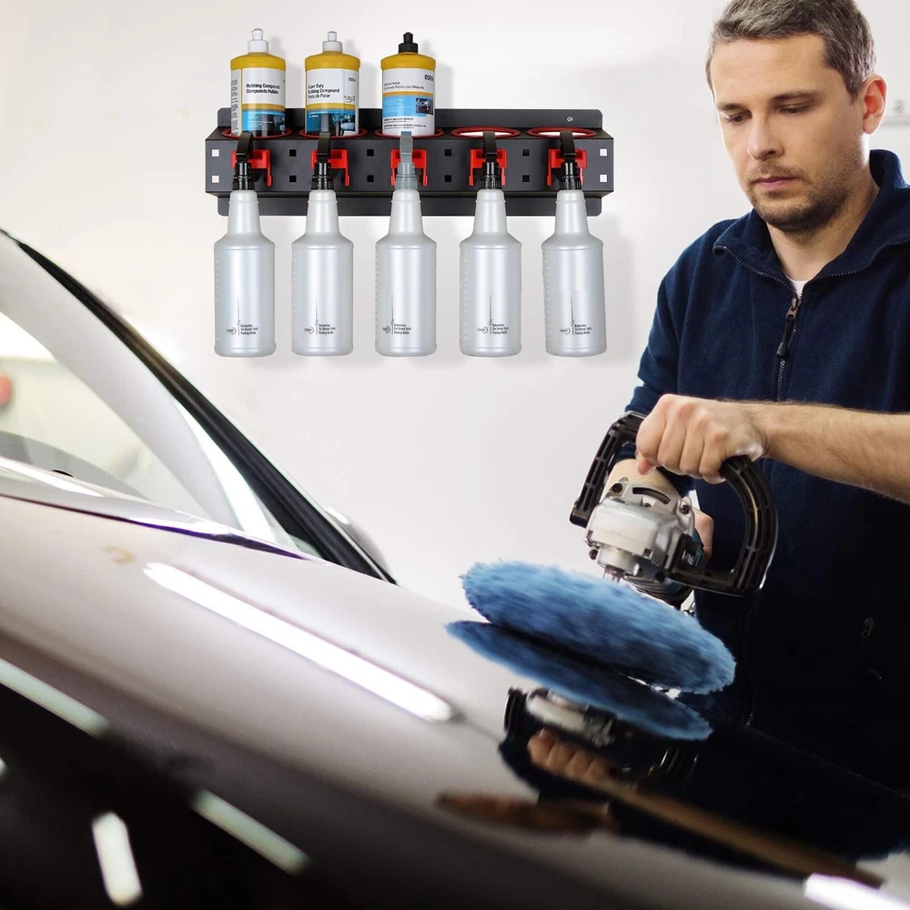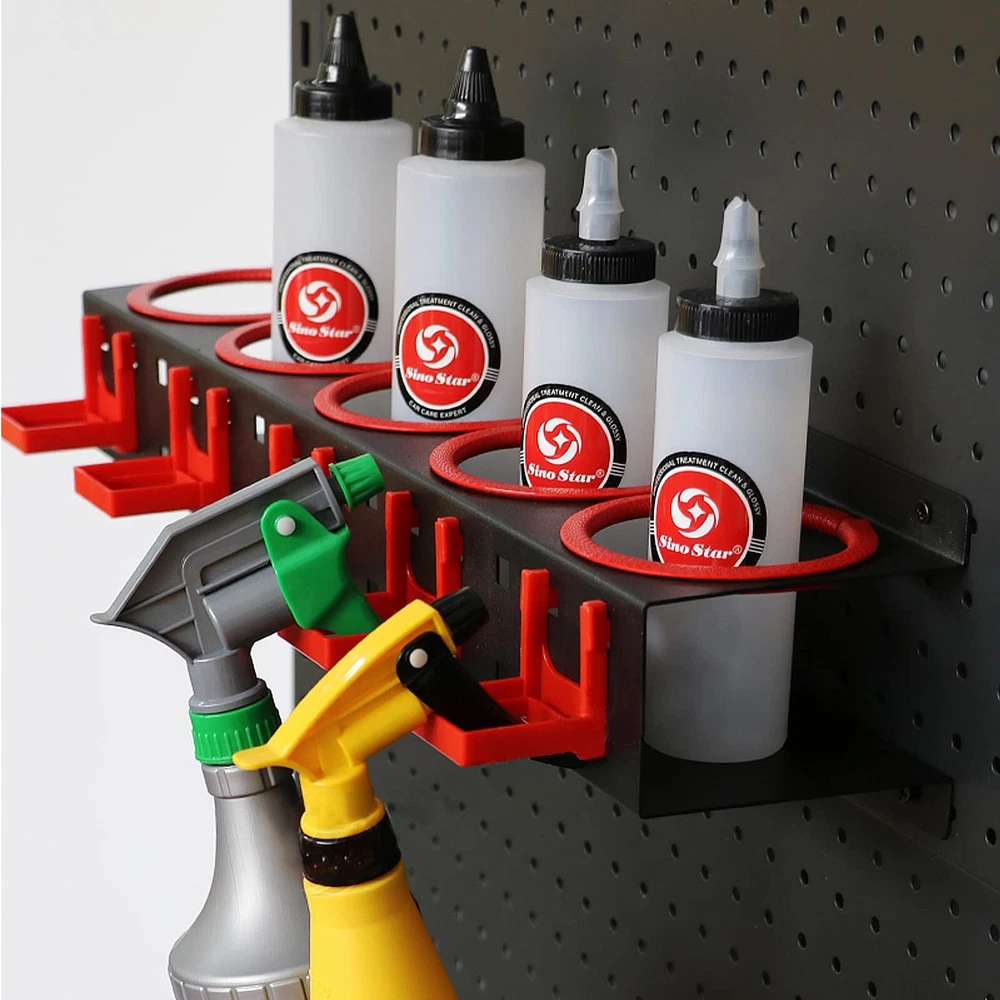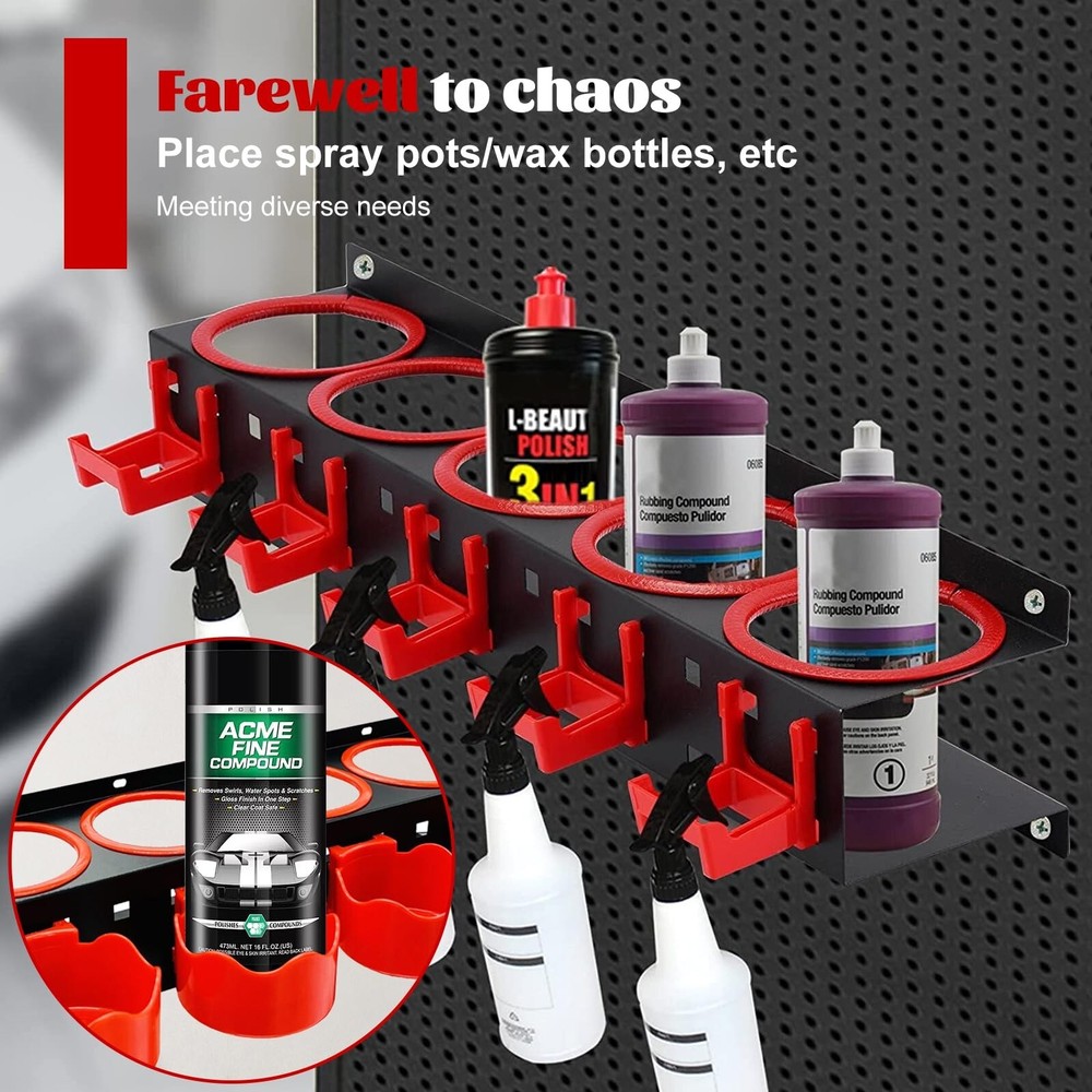 Spray Bottle Holder, 2 Pack Spray Bottle Storage Rack with Spray Bottle, Spray Bottle Wall Mount Organizer, Auto Cleaning Detailing Tools Hangers, Beauty Shop Accessory Spray Bottle Hanger Product Details Manufacturer: DWSFADA Brand: DWSFADA Model: yt7654r Item Weight: 4.99 pounds Product Dimensions: 4.7 x 21.6 x 4.7 inches Country of Origin: China Item model number: HY65211TR65 Manufacturer Part Number: JUYT553ERDF32 Special Features: Easy to Install Date First Available: June 13, 2023 Quality Material: Crafted from wear-resistant and sturdy carbon steel, this spray bottle hanger is smooth and free of burrs, ensuring easy maintenance and a strong load-bearing capacity. Trust in its durability and reliability. 2 Pack Spray Bottle Rack: The spray bottle organizer has 5 holes and is equipped with 5 hooks to store and place other tools, Two set spray bottle holder equipped with two kind hooks,that can match your different needs Easy to Install: Designed for wall mounting, this spray bottle organizer comes with screws and pre-drilled holes, ensuring quick and effortless installation. It provides a secure and reliable storage solution. Versatile Applications: Suitable for garages, auto repair shops, car washes, and more, this spray bottle holder offers easy access and storage for commonly used tools and spray paints. Keep your workspace organized and efficient. Large Storage Capacity: Featuring five circular slots and five square hooks, this spray bottle holder wall mount provides ample storage space for spray bottles, detailing bottles, and other tools. Keep your supplies within reach and neatly organized.