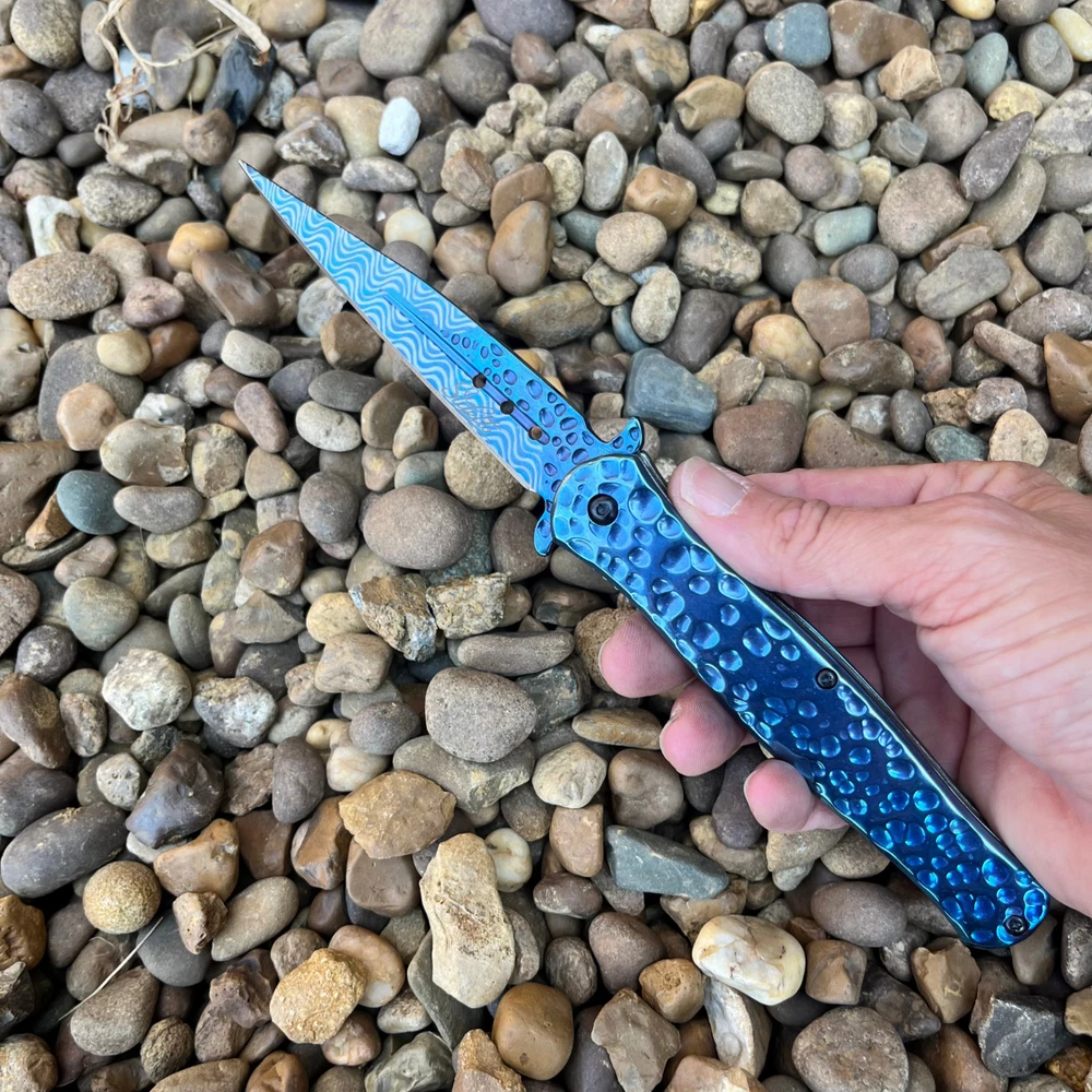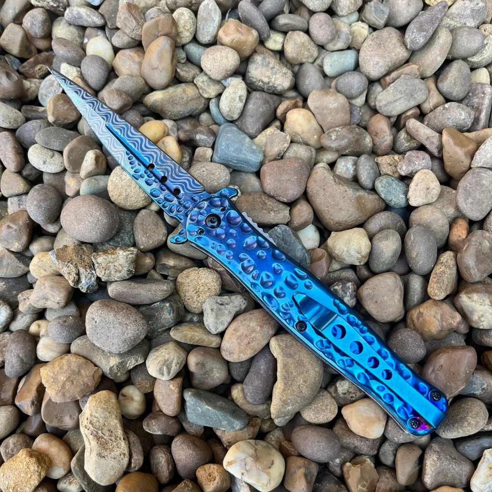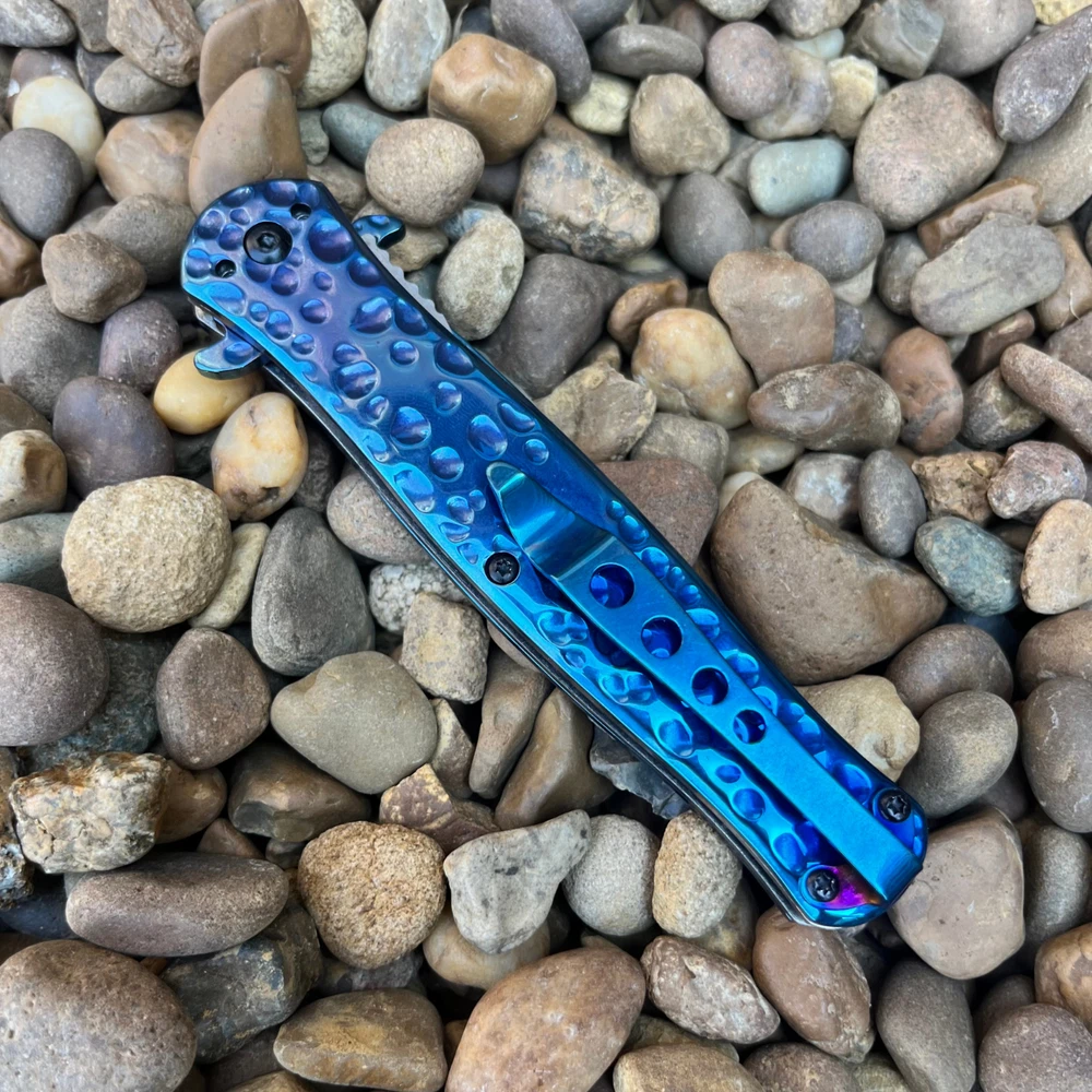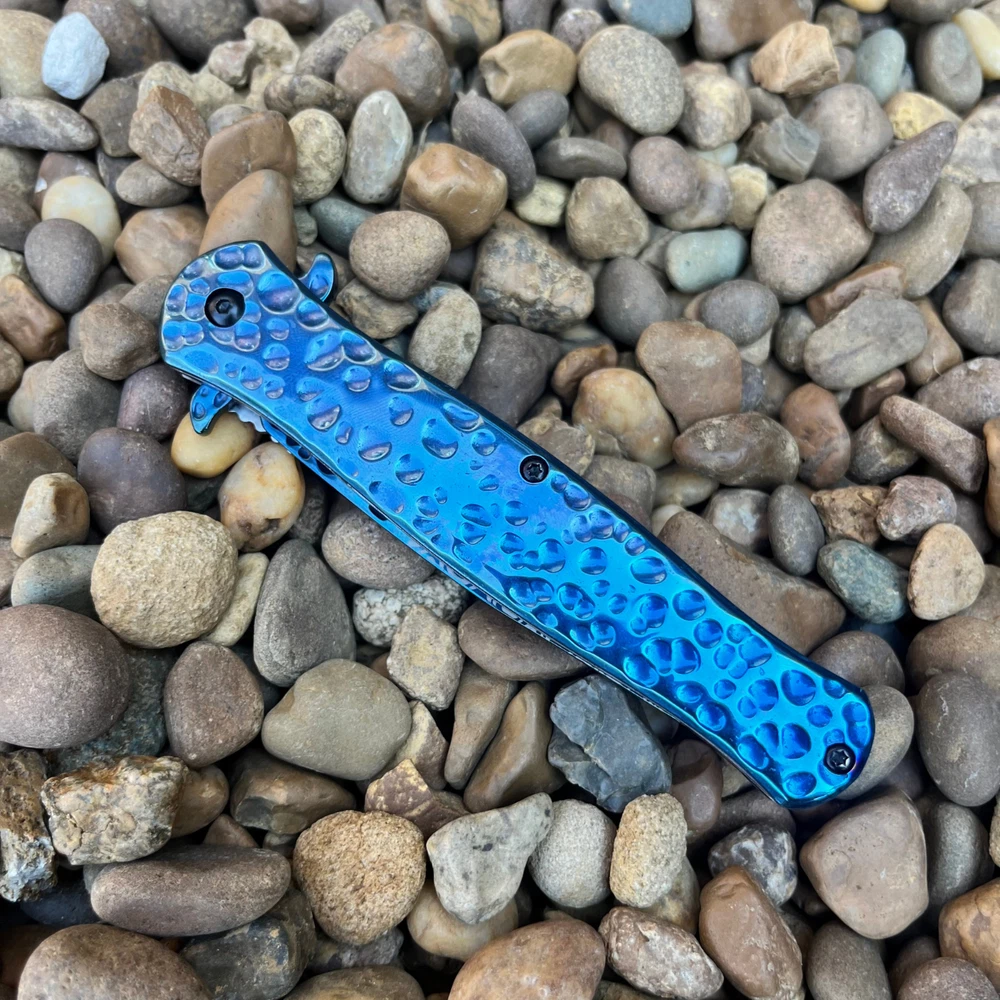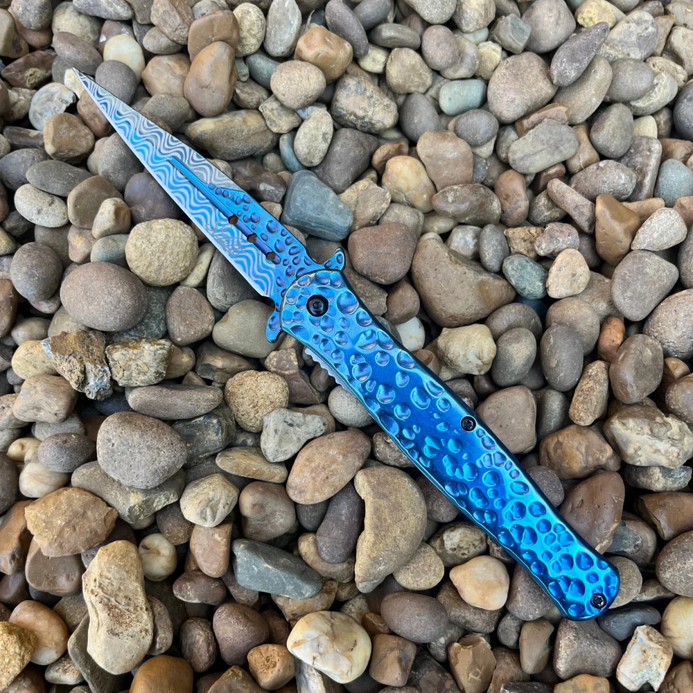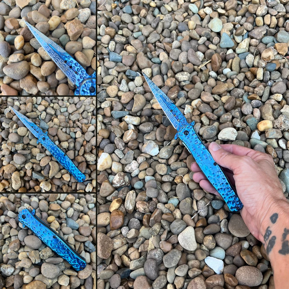 8.55" Hammered Metal Look Stiletto Knife Unleash the Power of Italian-Inspired Elegance Introducing our premium 8.5" stiletto knife, a masterpiece crafted with precision and style. The striking hammered metal finish adds a touch of rugged elegance, while the lightning-fast assisted opening mechanism ensures you're always ready for action. Key Features: 8.5" Overall Length: Commanding presence and impressive size. 4" Stainless Steel Blade: Durable and razor-sharp cutting edge. Hammered Metal Finish: Unique and eye-catching design. Spring Assisted Opening: Quick and effortless deployment. Blue Handle: Stylish and ergonomic for a comfortable grip. Perfect for: Outdoor enthusiasts Knife collectors Everyday carry (EDC) Tactical purposes Elevate Your Knife Collection Experience the perfect blend of form and function with this exceptional stiletto knife. Order yours today and discover the power and style of Italian craftsmanship. We strive for positive Feedback on all transactions. Your satisfaction is very important to us, if you experience a problem of any kind with your purchase please contact us first before leaving any feedback or opening any claims, any issues will be resolved more efficiently if you contact us first and deal directly with us. We do stand behind our products and will do anything in our power to make sure that you feel satisfied with your purchase. If you are not happy with your purchase, quality, DOA items. PLEASE email us , We would be more than happy to replace the item. Thank you for the cooperation.