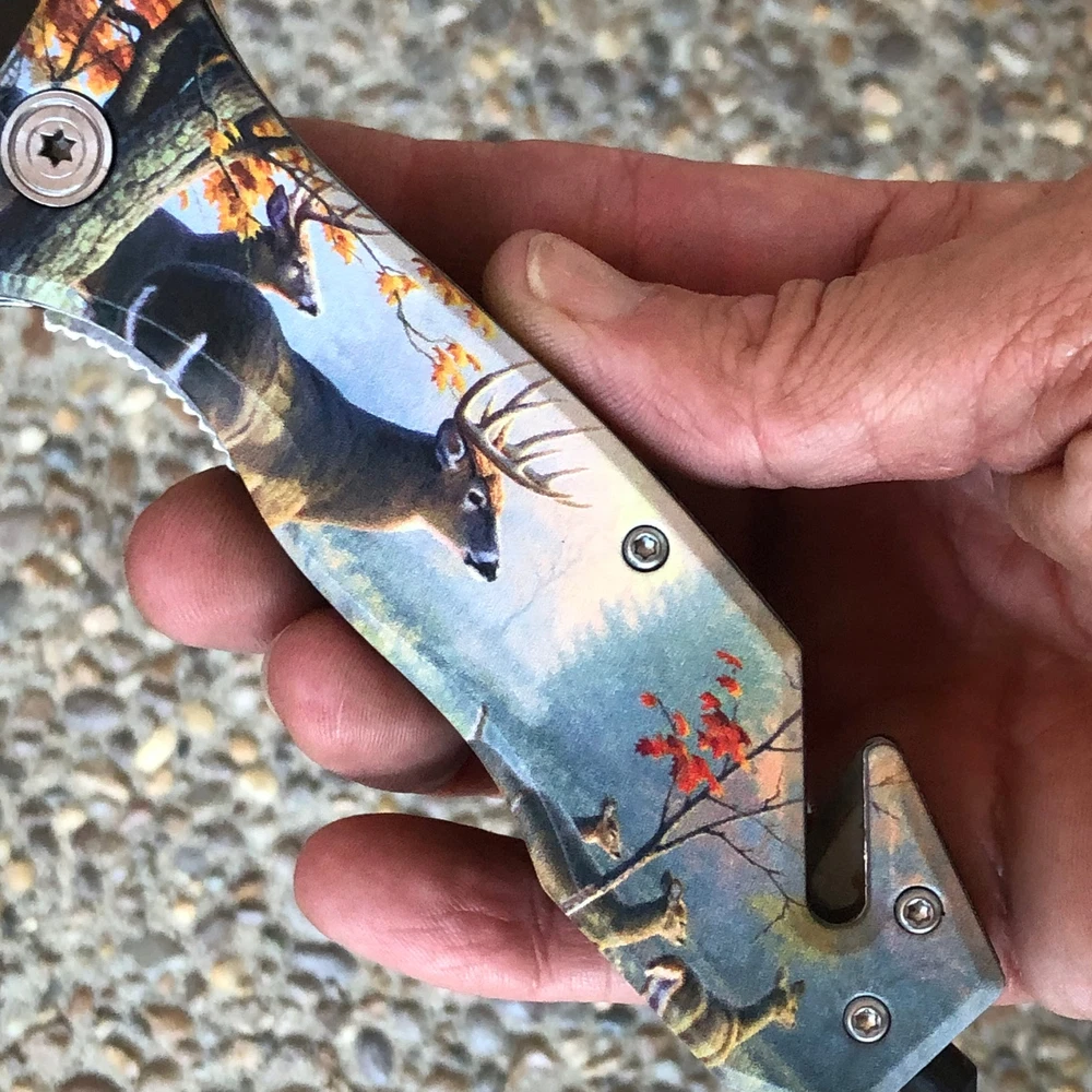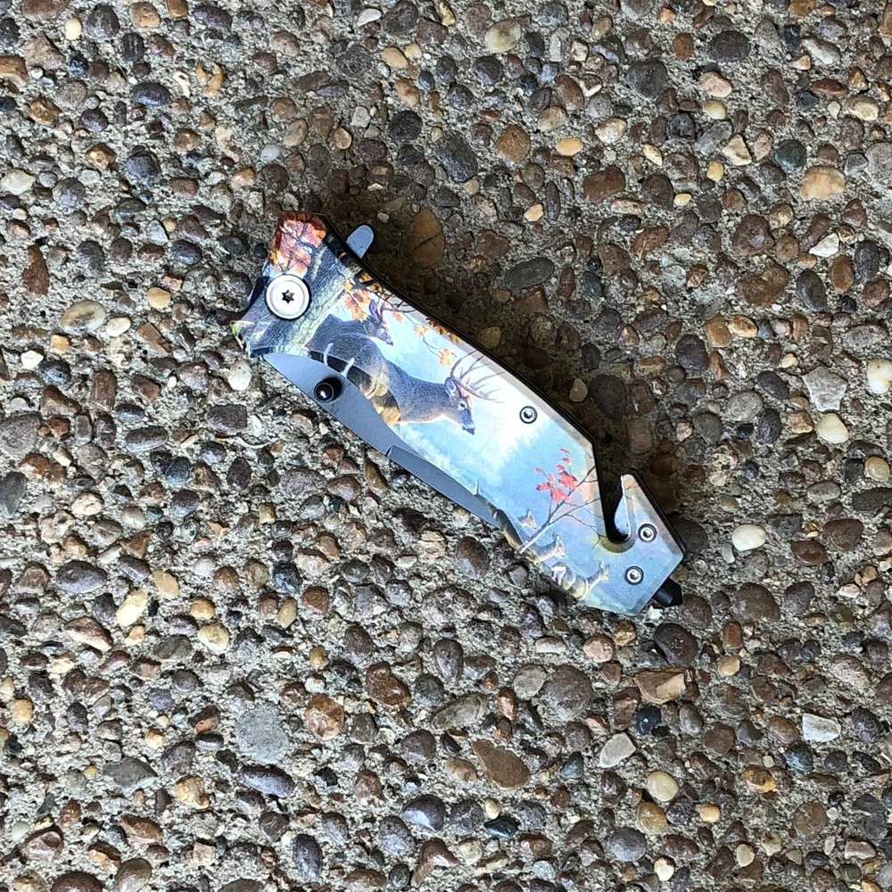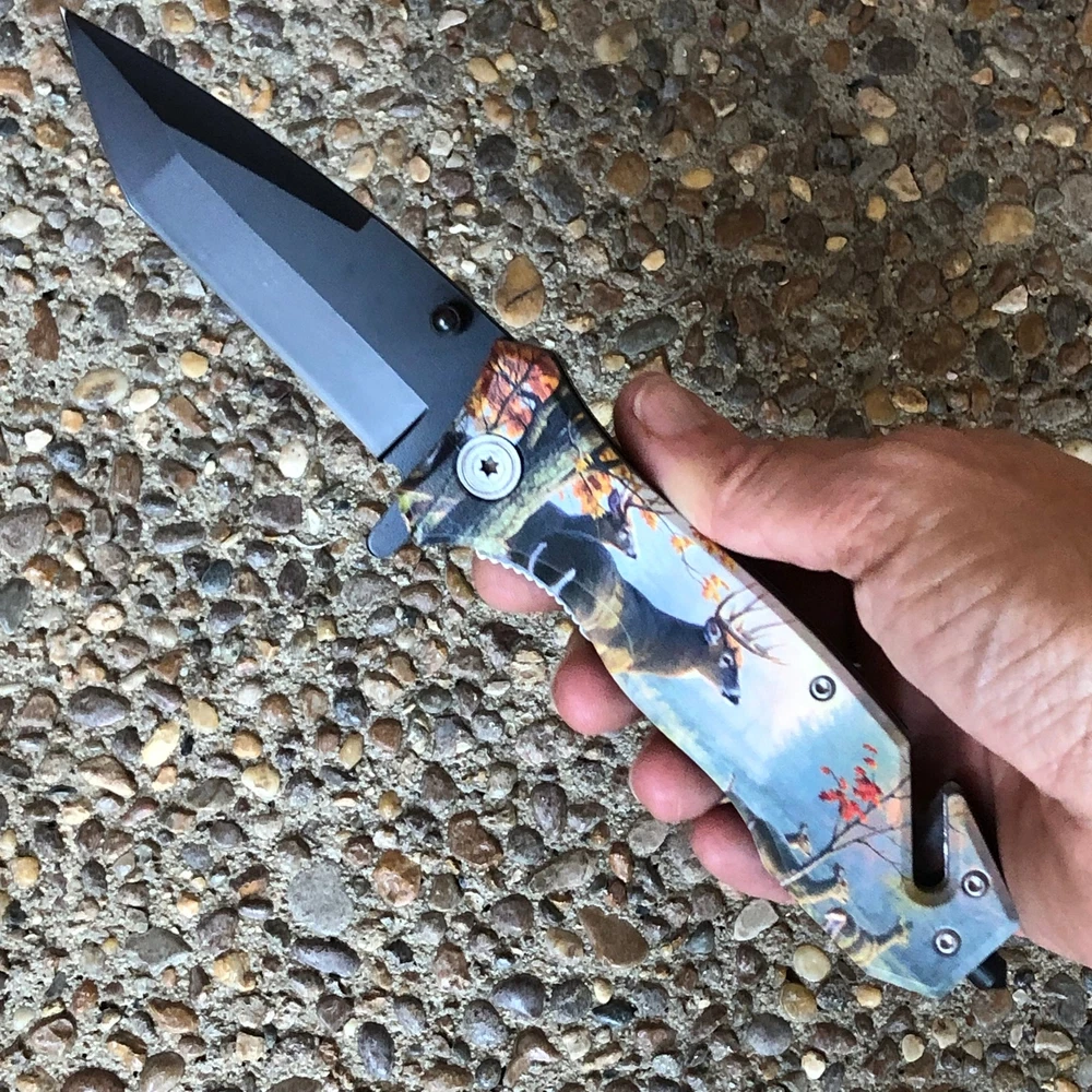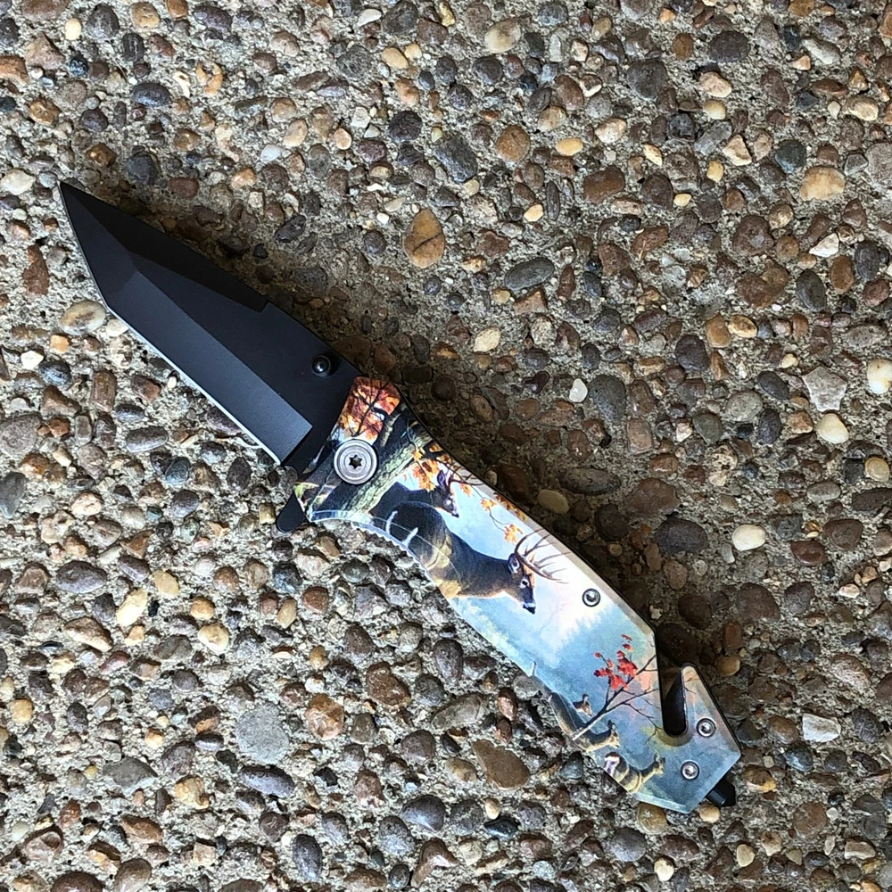 Get lightning-fast deployment with this TIGER-USA® Spring Assisted Folding Tanto Knife! It features a durable 3.5" 1065 German surgical steel tanto blade, perfect for a variety of cutting tasks. The 8" overall length provides excellent control, and the included pocket clip makes it easy to carry every day. Features: Unique Design: Eye-catching Dear-themed design Spring-Assisted Opening: Fast and smooth one-handed blade deployment Durable Blade: 3.5" tanto blade made from 1065 German surgical steel Convenient Carry: Includes a pocket clip for easy EDC Comfortable Grip: Ergonomic handle design for a secure hold Overall Length: 8 inches for a good balance of size and portability Great for: EDC, tactical use, outdoor activities We strive for positive Feedback on all transactions. Your satisfaction is very important to us, if you experience a problem of any kind with your purchase please contact us first before leaving any feedback or opening any claims, any issues will be resolved more efficiently if you contact us first and deal directly with us. We do stand behind our products and will do anything in our power to make sure that you feel satisfied with your purchase. If you are not happy with your purchase, quality, DOA items. PLEASE email us , We would be more than happy to replace the item. Thank you for the cooperation.