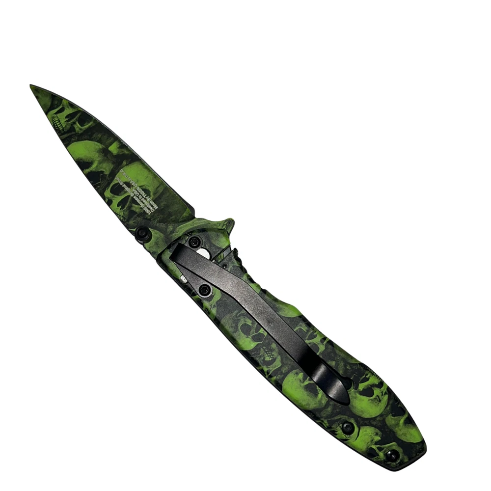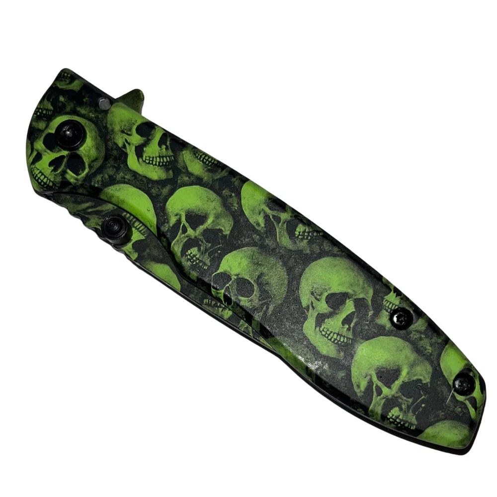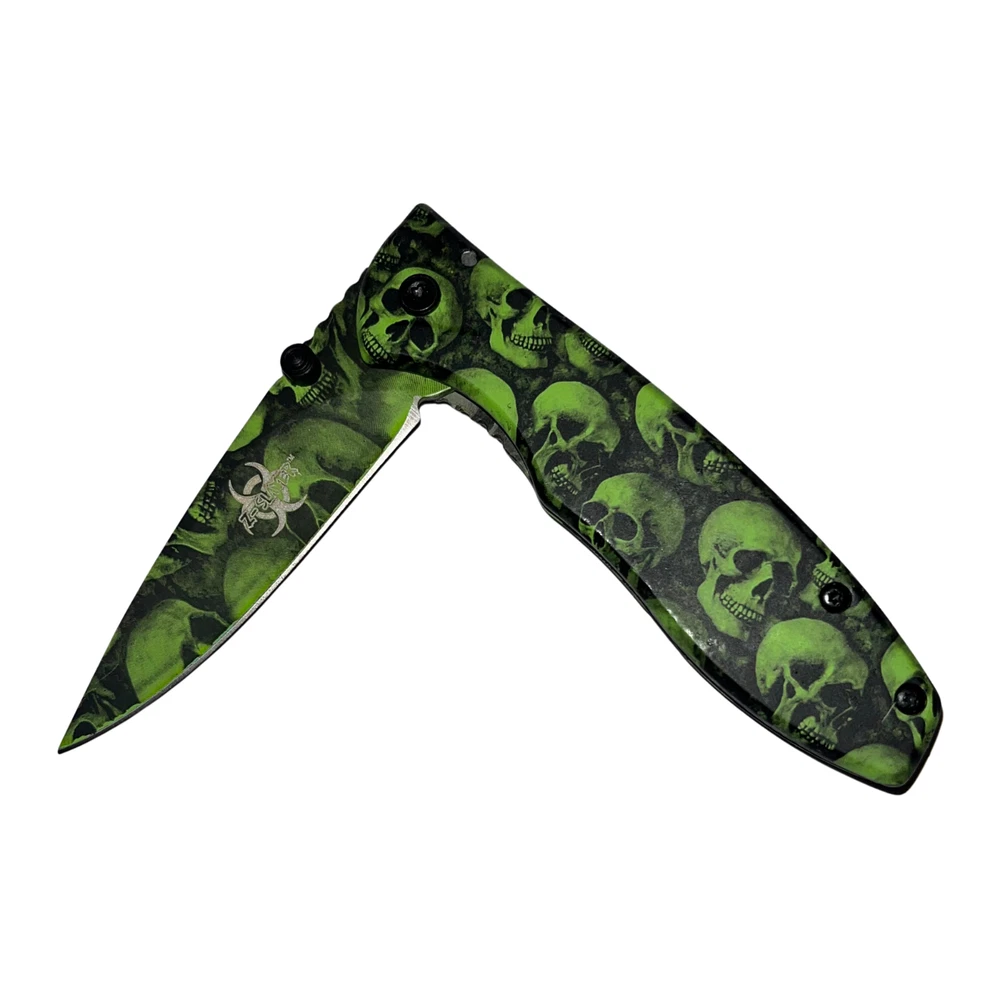 Undead survival has never been so easy with the Z-Slayer spring-assisted knife, skulls! This knife features some of the best specs of any Trigger Action knife out there, making it the ultimate pocket knife for Undead annihilation. The Trigger Action blade ejects with ease and has a razor-sharp blade edge, making it especially easy to slice up Undead flesh in a foggy graveyard. The Z-Slayer series never disappoints, and this knife is no exception, featuring the Z-Slayer logo etched on the blade. Features: Undead skulls finish Super fast Trigger Action blade Real surgical steel Razor-sharp blade edge - 2.75 inch blade Pocket clip included on handle - 3.75 inch handle Lightweight knife only 3.7 ounces Get your hands on this knife and never be without Undead protection. We strive for positive Feedback on all transactions. Your satisfaction is very important to us, if you experience a problem of any kind with your purchase please contact us first before leaving any feedback or opening any claims, any issues will be resolved more efficiently if you contact us first and deal directly with us. We do stand behind our products and will do anything in our power to make sure that you feel satisfied with your purchase. If you are not happy with your purchase, quality, DOA items. PLEASE email us , We would be more than happy to replace the item. Thank you for the cooperation.