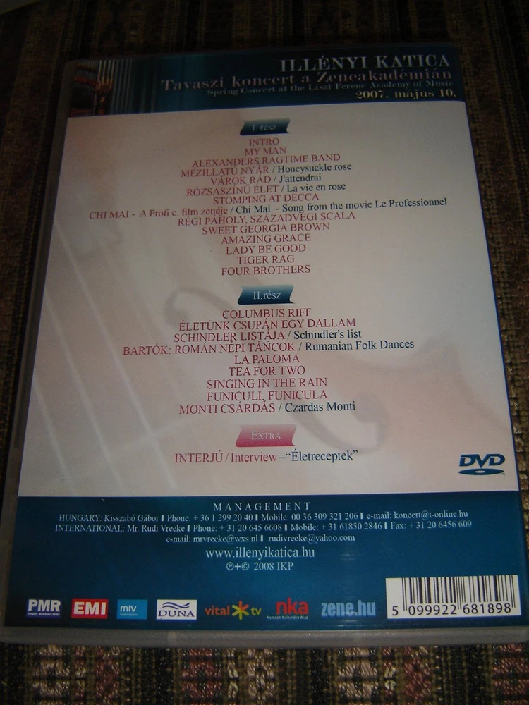 Further Details Title: Spring Concert at the Liszt Ferenc Academy of Music Tavaszi koncert a Zeneakadémián Illényi Katica 2007 May 10 / Audio: English, Hungarian Format: DVD Condition: New Number Of Discs: 1 Actors: Illényi Katica Region Code: DVD: 1 (US, Canada...) Studio: Retro Media Kiadó Description: I. rész 1. Intro 2. My Man 3. Alexanders Ragtime Band 4. Mézillatú nyár 5. Várok rád 6. Rózsaszínű élet 7. Stomping At Decca 8. Chi Mai - A Profi című film zenéje 9. Régi páholy, századvégi scala 10. Sweet Georgia Brown 11. Amazing Grace 12. Lady Be Good 13. Tiger Rag 14. Four Brothers II. rész 1. Columbus Riff 2. Életünk csupán egy dallam 3. Schindler listája 4. Bartók: Román népi táncok 5. La Paloma 6. Tea For Two 7. Singing In The Rain 8. Funiculi, funicula 9. Monti Csárdás Extra: Interjú - Életreceptek Illényi Katica a Zeneakadémia hallgatója volt 9 éves korától kezdve a Különleges tehetségek osztályában. Akkor még nem sejtette, hogy egyszer egy csodálatos koncertet ad majd azon a színpadon, ahol sok-sok vizsgáját figyelték árgus szemekkel tanárai. A 2007. május 10-én felvett előadáson egy 28 tagú vonósokkal és big banddel kiegészített nagyzenekar kísérte Illényi Katicát. Felcsendült többek között a klasszikus hegedűirodalom egy-egy gyöngyszeme, valamint világhírű filmzenék, jazz standardek, olasz dallamok, francia sanzonok és Gerschwin leghíresebb szerzeményei. Néhány dal a koncert műsorából: Sweet Georgia Brown, Lady Be Good, Edith Piaf - La vie en Rose című világslágere, Tea for Two, Amazing Grace, Schindler listája, Sound of Music, Funicuri, funicula, La Paloma és a Singing in the Rain. Közreműködtek: Illényi Katica – hegedű, ének Bolba Tamás – zongora Oláh Szabolcs – gitár Hárs Viktor – basszusgitár Kovács Zsolt – dob Gráf Ádám – trombita, szárnykürt Fekete-Kovács Kornél – trombita, szárnykürt, altkürt Mester Dániel – alt-szaxofon, klarinét Nagy Attila – tenor-szaxofon, klarinét, fuvola Korb Attila – harsona Atlantisz Kamarazenekar DVDs ARE REGION 2 UNLESS OTHERWISE STATED Playback Region 2 :This will not play on most DVD players sold in the U.S., U.S. Territories, Canada, and Bermuda. You will require a multi-region DVD player and a PAL compatible TV to view. Missing Information? Please contact us if any details are missing and where possible we will add the information to our listing.