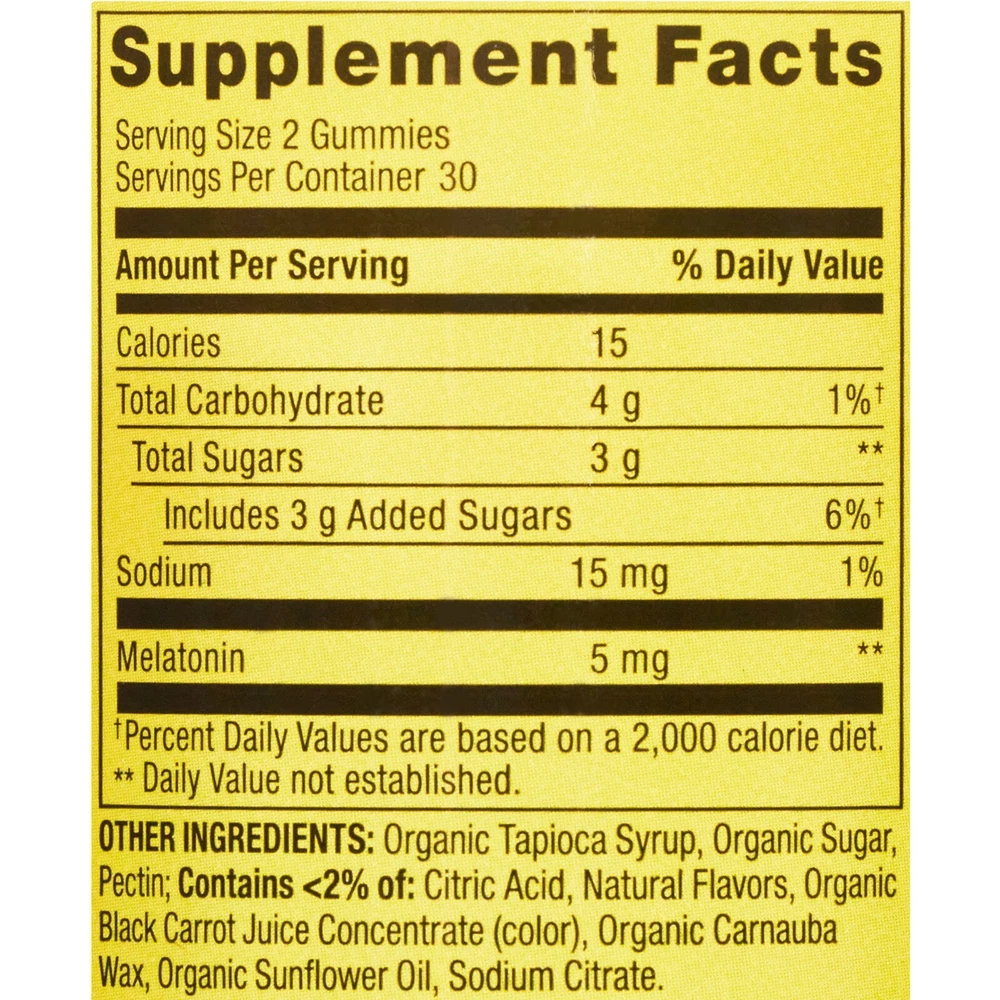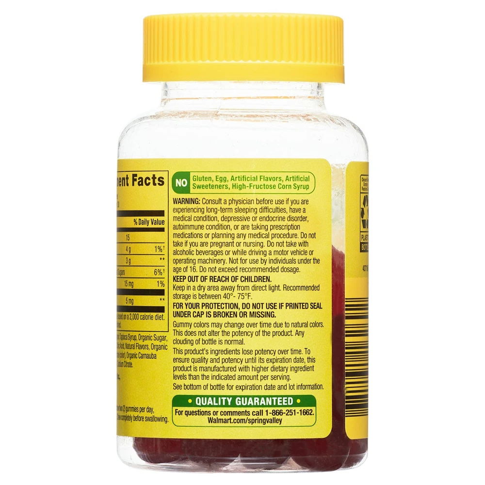 Product details Spring Valley Melatonin Pectin Dietary Supplement Gummies, Strawberry, Spring Valley Pectin-Based Melatonin Gummies are the simplest, best-tasting way to take Melatonin. Our delicious and easy to chew gummies make taking Melatonin a joy. Non-GMO Spring Valley Vegetarian Melatonin Gummies contain 5 mg of Melatonin per serving. Melatonin helps regulate sleep and wake cycles and may support more restful sleep in circumstances of altered sleep schedules such as jet lag or shift work. Take control of your sleep with Spring Valley Pectin-Based Melatonin Gummies. Spring Valley Melatonin Pectin Dietary Supplement Gummies, Strawberry, 5 mg, 60 Count Spring Valley Melatonin Adult Pectin-Based Gummies, 5 mg, 60 count 5 mg of Melatonin per serving Helps regulate sleep and wake cycles May support more restful sleep in circumstances of altered sleep schedules Delicious Easy to take