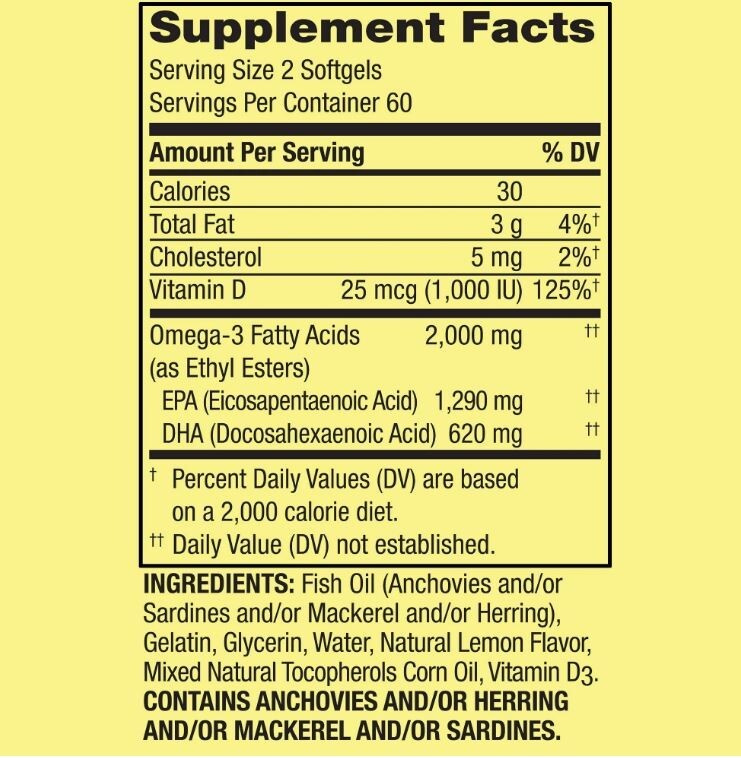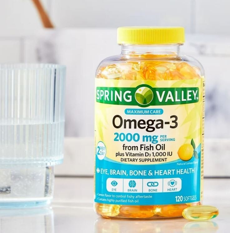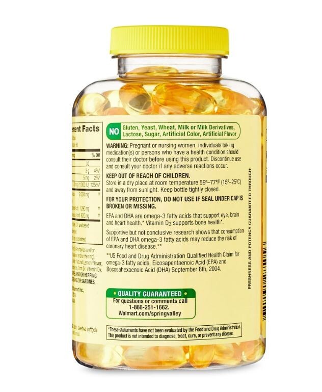 About This Item We aim to show you accurate product information. Manufacturers, suppliers and others provide what you see here, and we have not verified it. Supplement your health with the Spring Valley Omega-3 Fish Oil Plus Vitamin D3 Softgels. Our bodies don't naturally produce enough omega-3s, so we must consume them to maintain proper levels. With 2000 milligrams of omega-3s per serving, it's easy to stay on a healthy track with Spring Valley fish oil supplements. Our enteric coated product helps reduce the fish burps associated with some other standard fish oil formulas. The EPA and DHA omega-3s found in fish oil promote maternal health and a healthy pregnancy while supporting fetal and infant brain, eye and nervous system development. DHA accounts for 97 percent of the omega-3 fats in the brain, and they are important for healthy brain tissue development in children and teens. Vitamin D3 supports bone health in those that are deficient and helps in calcium absorption. Bring home the Spring Valley Omega-3 Fish Oil Plus Vitamin D3 Softgels. Spring Valley understands living a healthy, balanced lifestyle is the key to being your best self. With an affordable range of products inspired by nature, Spring Valley supports your and your family's health and holistic wellbeing. Spring Valley Omega-3 Fish Oil Plus Vitamin D3 Softgels, 120 Count: Contains 2000 mg of fish oil 1040 mg EPA/740 mg DHA plus vitamin D3 20 mcg EPA and DHA omega-3s found in fish oil promote maternal health and a healthy pregnancy while supporting fetal and infant brain, eye and nervous system development Vitamin D3 supports bone health Coconut burst flavor Easy to use squeeze packet *These statements have not been evaluated by the Food and Drug Administration. This product is not intended to diagnose, treat, cure, or prevent any disease. Indications: Health Concern: Bone & Joint Health Supplementation Vision & Eye Health Skin Care Concern: Vegetarians-NO,Vegans-NO, Ingredients: Ingredients: Ingredients: Fish oil (Anchovies and/or Sardines and/or Mackerel and/or Herring), Gelatin, Glycerin, Water, Natural Lemon Flavor, Mixed Natural Tocopherols, Corn Oil, Vitamin D3 Specifications Gender Unisex Items Included false Primary Ingredient Omega-3 Food Form Softgels Title Spring Valley 2000 mg, 120 ct, Omega-3 Fish Oil + Vitamin D Softgels Count 120 Price Per Unit UOM Each Brand Spring Valley Body Part Body PPU Quantity of Units 120 Each Count Per Pack 120 Product Name Spring Valley Omega-3 Fish Oil Plus Vitamin D3 Softgels, 120 Count Food Allergen Statements CONTAINS Anchovy, Herring, Mackerel AND Sardine. Flavor Natural Lemon Condition New Units Per Consumer Unit 1 Size Regular Form Softgels ~ Will be wrapped with care. ~ ~FREE SHIPPING~ Any questions, please feel free to contact us. Buy with confidence! Thanks for looking!