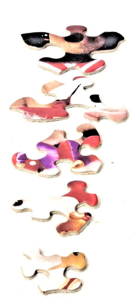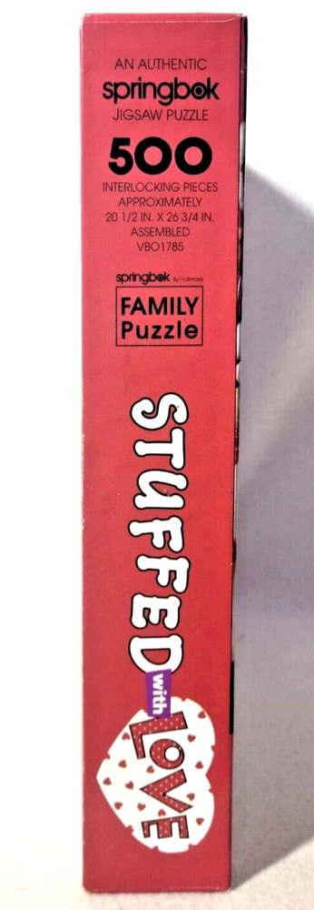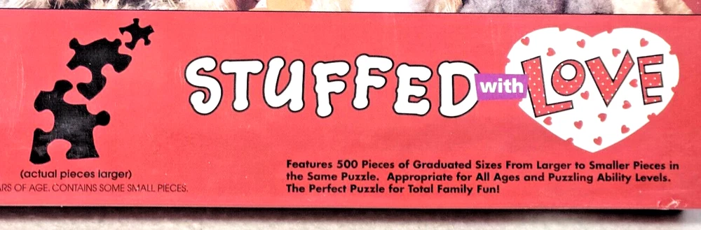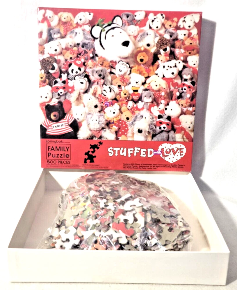 This jigsaw puzzle features a delightful family of stuffed animals, perfect for any puzzle enthusiast who loves a challenge. With 500 pieces made of high-quality cardboard, this puzzle is sure to satisfy experienced puzzlers and beginners alike. The colorful design and interlocking pieces make for a fun and engaging experience. The puzzle pieces are graduated in size, so every member of the household can contribute, small pieces for the more nimble fingers and larger pieces for those fingers that are just now learning how to figure things out. The puzzle is from 1996 and is a vintage piece that comes from a smoke-free household. It is recommended for ages 10 and up.The puzzle is a great addition to any collection and is sure to bring a smile to your face. Doing puzzles has some hidden benefits . Excellent qualities : Cultivate concentration, patience, and temper your will Movement development : Train hand-eye coordination and precise small movements Spatial intelligence : Improve visual discrimination of colors and shapes Critical thinking ability : Understand the relationship between parts and the whole, and draw inferences from one example to explore the future Relaxes your mind : Relieve work pressure and release yourself Brain development : Enhance memory and may help prevent or slow brain degeneration * We did not work the puzzle or count the pieces, but we verify the number count at your request . Each item we ship is carefully packaged to prevent any damage and is shipped immediately with tracking.