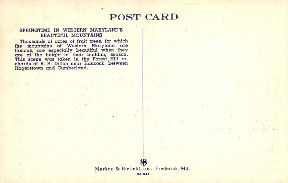 MAKE AN OFFER. THE MORE YOU BUY THE BETTER DEAL I WILL ACCEPT Experience the breathtaking beauty of thousands of fruit trees in full bloom along U.S. 40 in Western Maryland. This postcard captures the vibrant colors of the Forest Hill orchards near Hancock, between Hagerstown and Cumberland.