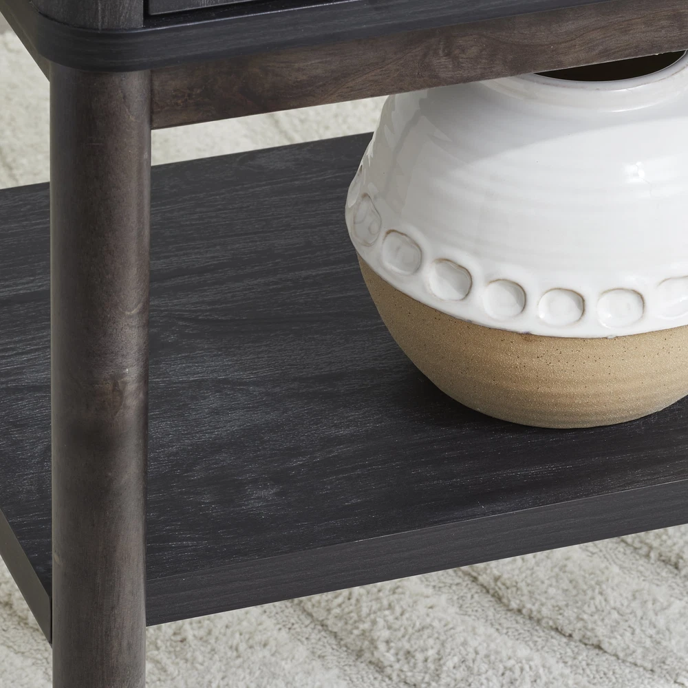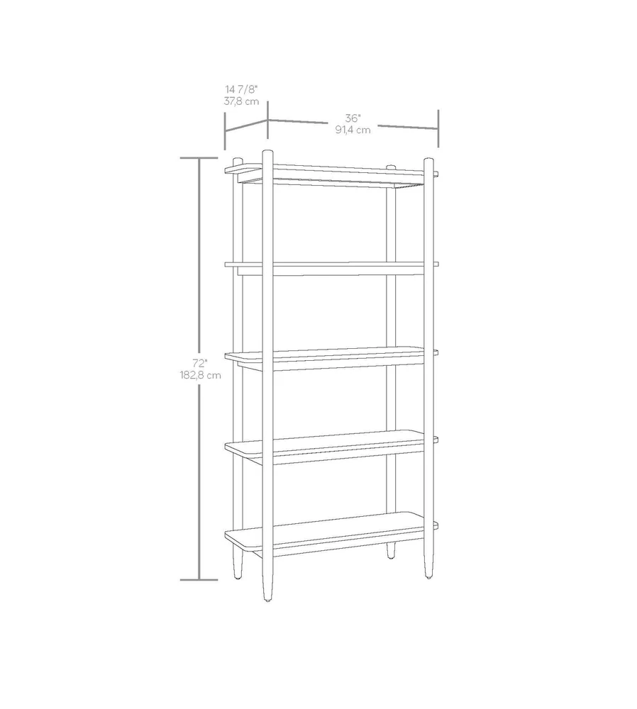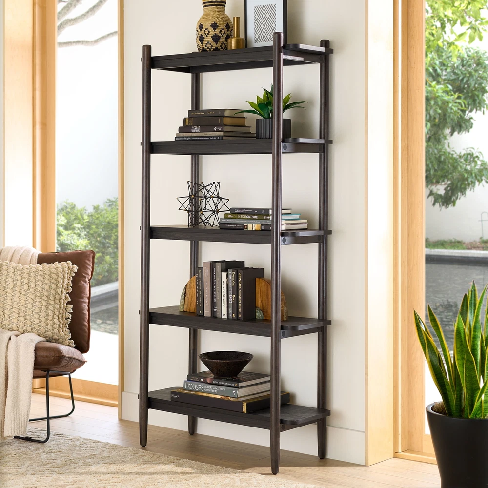This chic, open bookshelf from the Better Homes & Gardens® Springwood Collection will offer a versatile and trendy solution to any storage dilemma. The large shelves of this 5 shelf bookshelf are a perfect place to display home décor items like decorative plants, an array of knick-knacks and collectibles, and framed photos of your family and friends. Standing on fashionably tapered legs, this tall bookcase with five spacious shelves will provide the room to store a collection of novels, children’s books, or organizing totes or baskets. Mix and match any number of items on this tall, display bookcase. There’s room for everything! Its beautiful and bold design makes this open bookshelf a great addition to the living room, office, or even in the bedroom. Any room in the home will benefit from the neutral tones of this dark, Charcoal finish. Finished on all sides for any angle of placement, this beautiful 5-shelf bookcase will create functional storage solutions without sacrificing style. Assembled Dimensions: 35.98" L X 14.88" W X 71.97" H Open shelving for storage and display Holds books, binders, framed photos, collectibles, and more Solid Wood Accents Charcoal finish Model #: 434761 Box Dimensions: 77.01" L x 17.13" W x 6.89" H