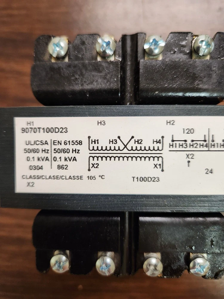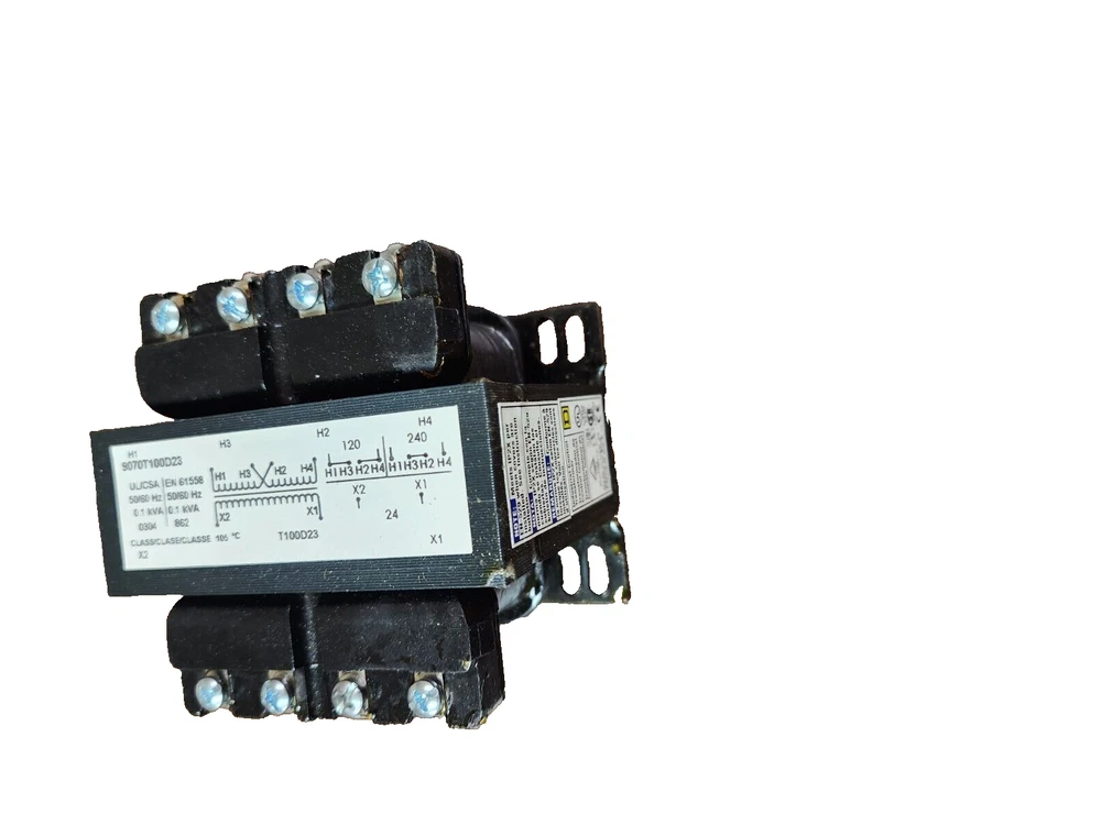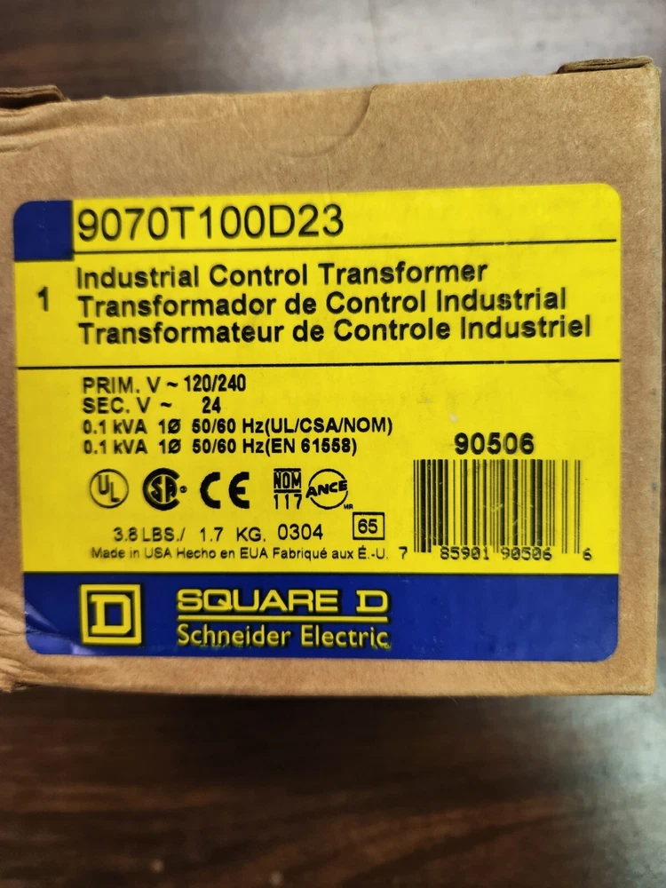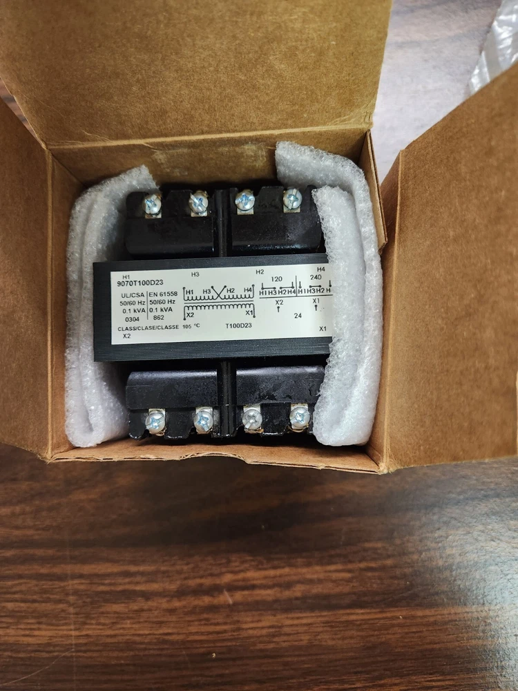 Square D, Control transformers, Primary 120 / 240 volts, secondary 24 volts, .1 KVA , Catalog # 9070T100D23 New in original box. Note: package open to takephotos