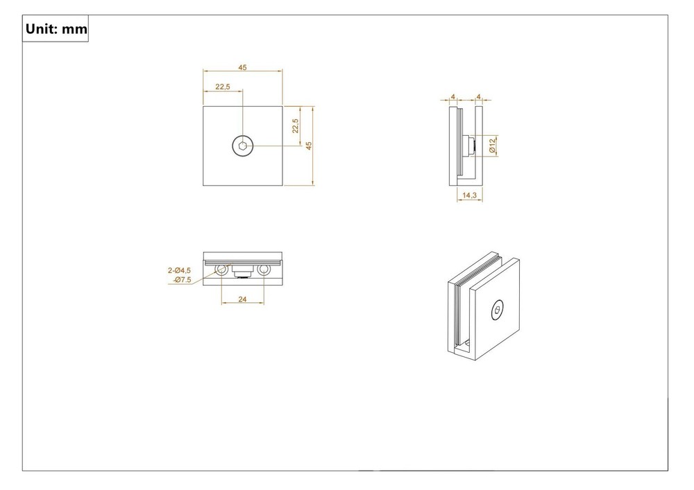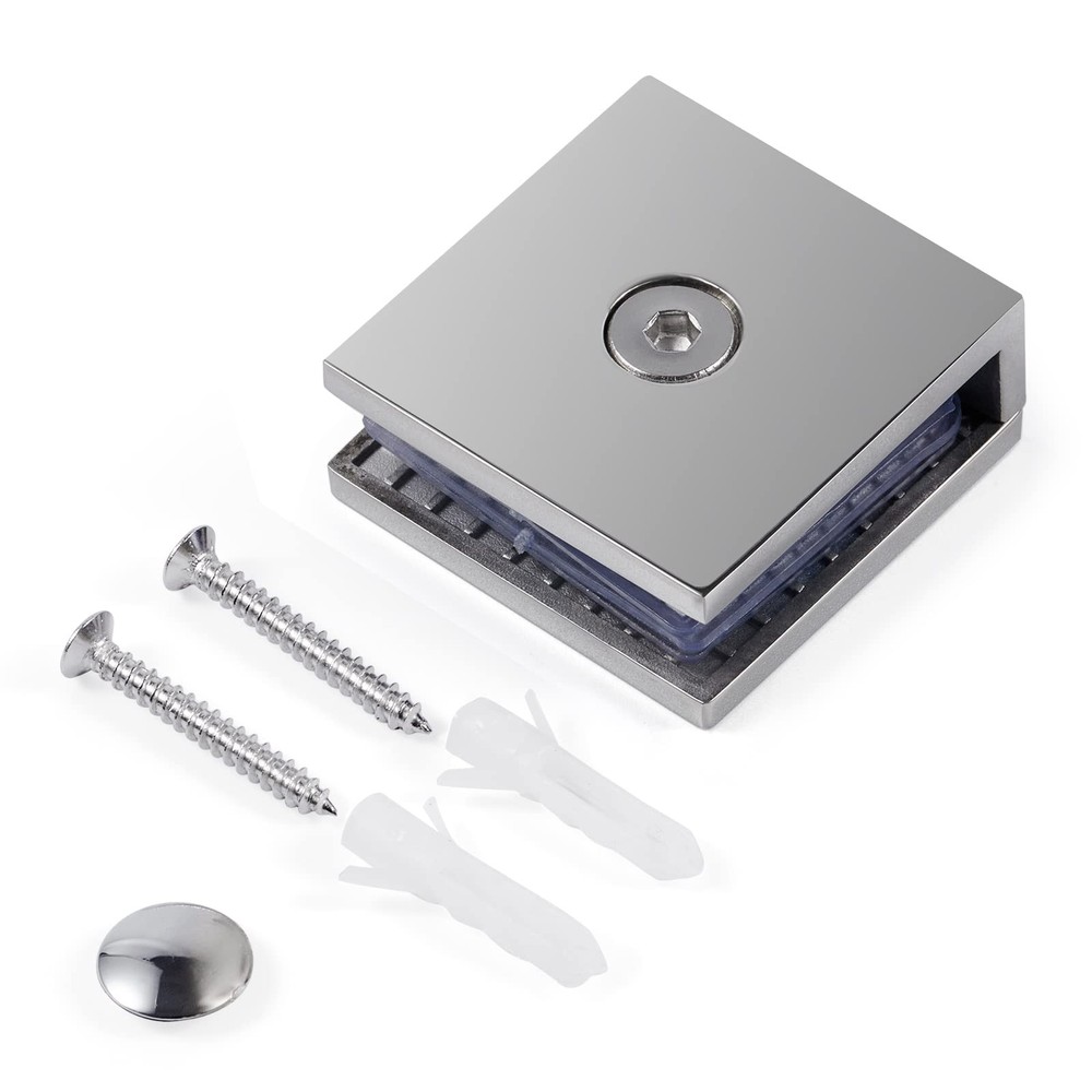 The Square Frameless Glass Clamp is a high-quality fixing bracket designed specifically for modern bathrooms and shower enclosures. Made of 304 stainless steel, this glass clamp is suitable for connecting glass-to-glass or glass-to-wall, ensuring a secure installation for frameless glass doors and panels. It is compatible with tempered glass thicknesses ranging from 5/16 to 1/2 inches (8-12 mm), making it an ideal choice for both residential and commercial applications. Installation Instructions: Preparation: Before installation, ensure you have reviewed the product requirements and prepared the glass drilling template. A 1/2-inch diameter hole needs to be pre-drilled in the glass. Drill Positioning: Use the provided template to mark the correct drilling positions on the glass and ensure precise alignment. Installation Process: Make sure the glass edges are smooth and undamaged. Align the clamp with the drilled holes and install it securely. Use the included rubber gaskets to adjust for the glass thickness and ensure a stable and secure fit. Tighten the expansion screws to enhance overall support and finish with the decorative cover for a polished look. Safety Check: After installation, double-check the stability of the clamp to ensure the glass panels are securely fixed without any looseness. Product Features: Outstanding Specifications: This clamp features a robust 4/25-inch (4mm) thick body design for superior load-bearing capacity, ensuring the glass stays securely in place without the risk of loosening or falling. The included non-slip gaskets are compatible with different thicknesses of tempered glass (5/16 to 1/2 inches/8-12 mm). Superior Durability and Corrosion Resistance: Crafted from premium 304 stainless steel, this clamp is specifically designed for humid environments, offering excellent resistance to corrosion and rust. Even in high-humidity spaces like bathrooms and shower areas, it effectively withstands the effects of water vapor and chemicals, maintaining its stability and aesthetics over time. Complete Installation Kit: Includes two retaining clips, decorative covers, rubber gaskets, mounting screws, expansion screws, and rubber sleeves. All accessories are carefully designed to ensure an easy and secure installation process with long-lasting stability. Multi-Scene Applications: Whether it's for bathroom renovations, shower door installations, or office glass partitions, this clamp offers robust functionality and a modern aesthetic that enhances the beauty and utility of any space. Perfectly suited for homes, hotels, office spaces, or commercial settings. 1.Easy to Install: 1/2 inch diameter Holes need to be drilled in the glass door first for safety of use. Please drill holes according to the drawings for this glass connector and use samples to locate the holes. 2.Product Specifications: This shower door bracket is suitable for fixing the glass panel and the wall at a precise 0-degree angle. The 4/25 inch (4mm) thickness of the fixed glass shower panel clamp provides better load bearing without worrying that the glass will easily loose or fall out. The included gaskets allow adjustment to suit different thicknesses (5/16- 1/2 inch/ 8mm- 12mm) of tempered glass and reduce friction between the glass and the hinge. 3.Excellent durability and corrosion resistance:This fixing clip is made of high quality 304 stainless steel, designed for humid environments, with excellent resistance to corrosion and rust. Even in high humidity environments such as bathrooms and showers, 304 stainless steel can effectively resist the erosion of water vapor and chemicals, keeping the product stable and beautiful for a long time. Whether in daily use or in harsh conditions, the clip ensures long-lasting durability and worry-free performance, making it the ideal choice for long-term use. 4.Modern Style: The bright silver polished nickel surface gives the glass mounting bracket an exquisite gloss and elegant appearance, with a delicate metallic texture and a smooth, shiny effect. Its minimalist and modern design style makes it a perfect fit for home bathrooms, hotels, or office spaces, exuding a fashionable and refined atmosphere. This bracket not only enhances the visual appeal of the shower area but also combines functionality with aesthetics, becoming a standout feature in any space, highlighting modern elegance and brilliance. 5.The complete kit includes two retaining clips, decorative cover, rubber gasket, mounting screws, expansion screws and rubber sleeve, providing a complete set of accessories to ensure easy installation and stable use. Each accessory is well designed, the fixing clips provide strong support, the decorative cover enhances the appearance, the rubber gasket reduces friction and protects the glass, the expanding screws increase the stability of the installation and the rubber sleeve extends the service life. Perfect for all bathroom and shower door installation needs.