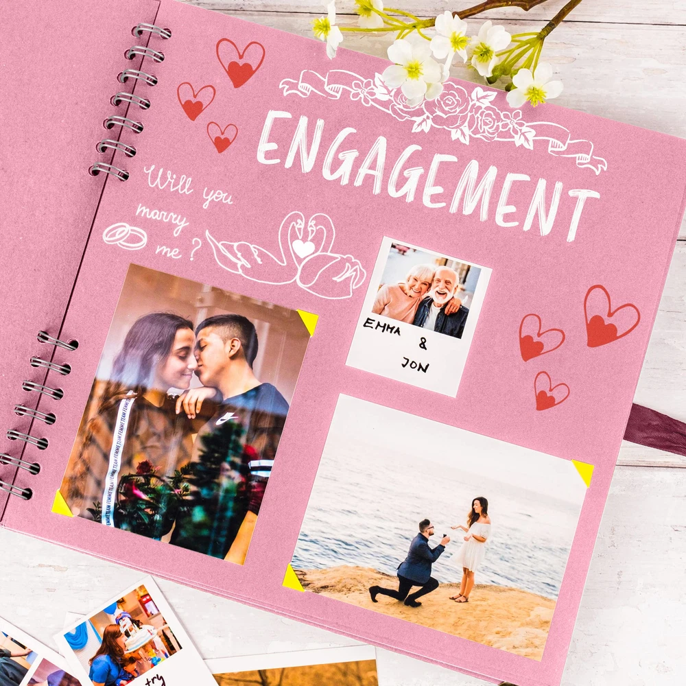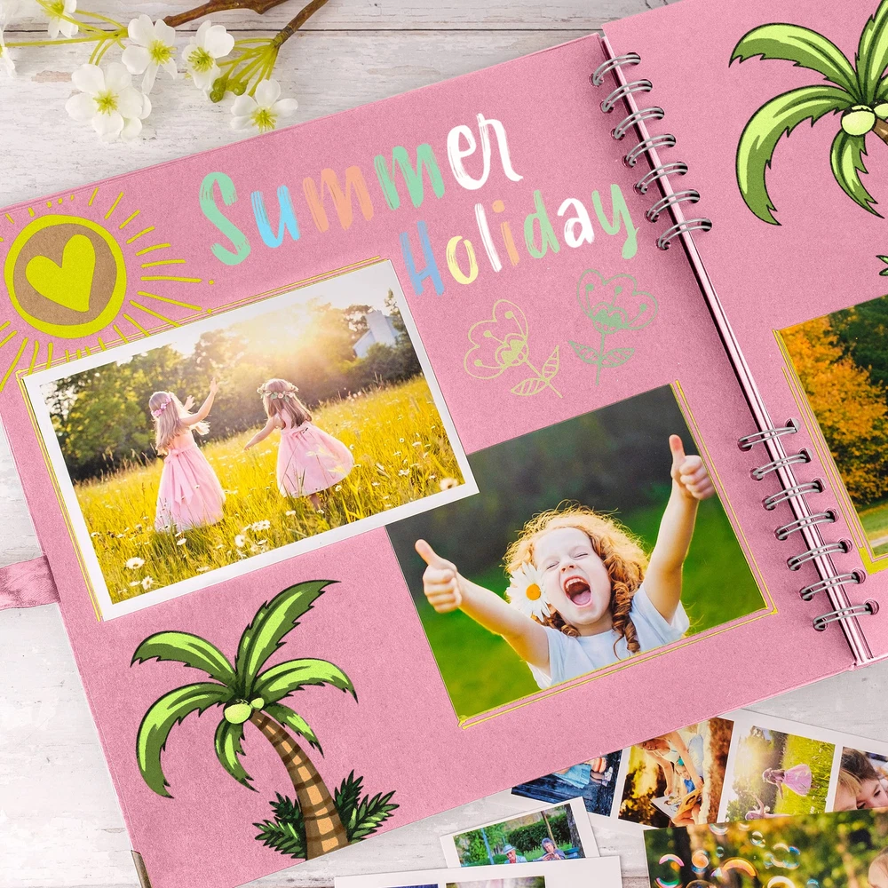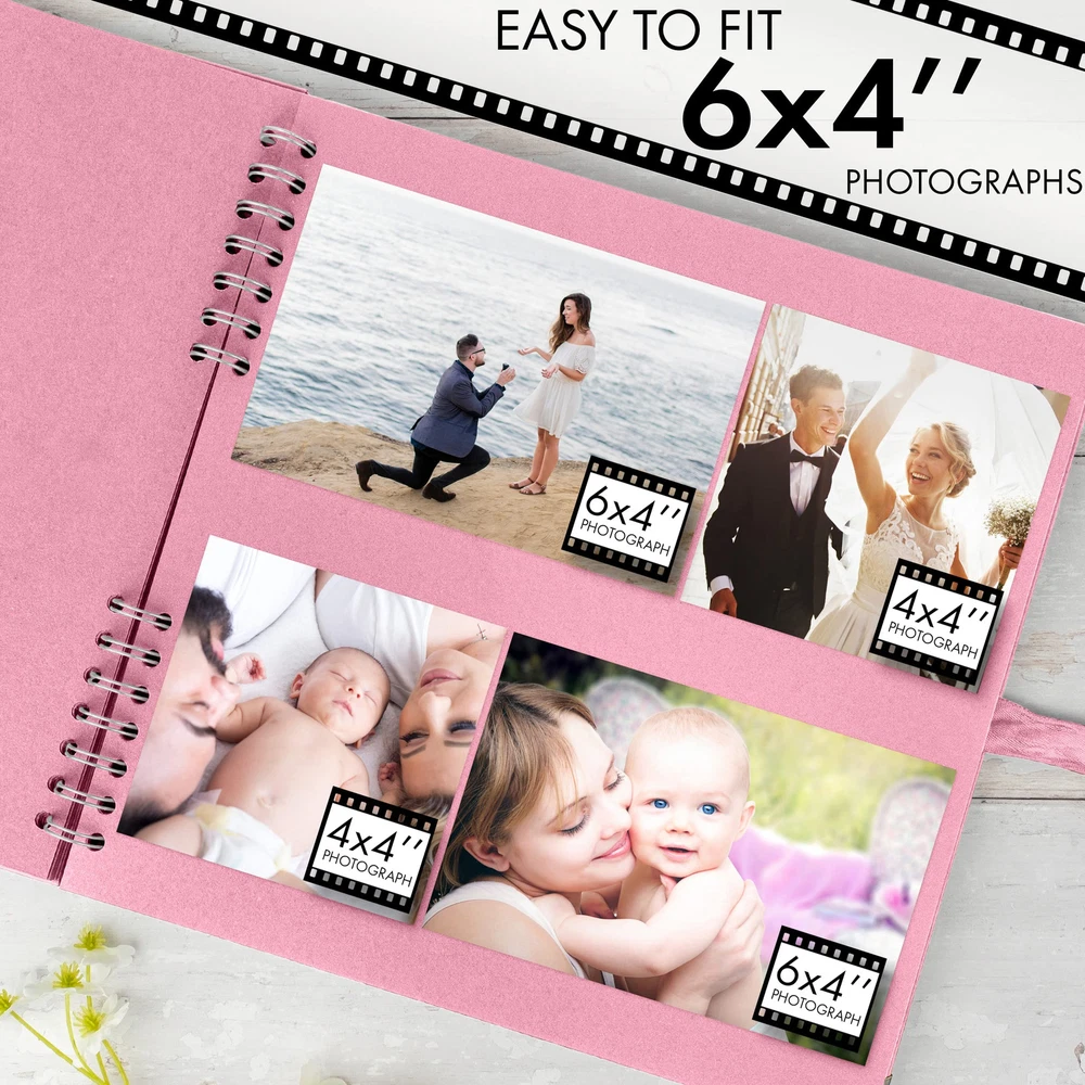 Scrapbook This 11 x 11 Inch scrapbooks is durable and suitable for long term storage for you and your loved ones beautiful memories. It has 40 sheets, 80 pages of high quality thick paper, designed with ribbon closure, hard cover and corner protectors The spiral bound spine allows the scrap book to expand to fit in your photos, postcards, souvenirs. You can tie the ribbon into a bow or other style that you like and make your photo album scrapbook as individual as your memories and keep them endlessly The hardcover protects the pages, you can design the hardcover and inside pages of this photo book with paints, pens, stickers and even add glitter for a touch of sparkle and shine. You can look back over time at your amazing creation, So get creative now Scrapbooking is all about telling a story so think about the experiences in your life that means the most to you, lays flat on the desk, hold your art pen, write and record your happy memories beside the photos, Easy to fit 6 x 4 inch photos It makes an ideal gift for Anniversary, Mothers Day, Birthday, Valentines Day, Christmas, Wedding guest book, Baby memory book and for recording your travels or add your creative touches and embellishments to make it your own. Package Includes: 1 x Scrapbook