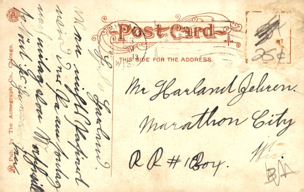 Postcard with address for Mr. Harland Jeleren in Marathon City, RR #1 Boy. Gulo Harland.