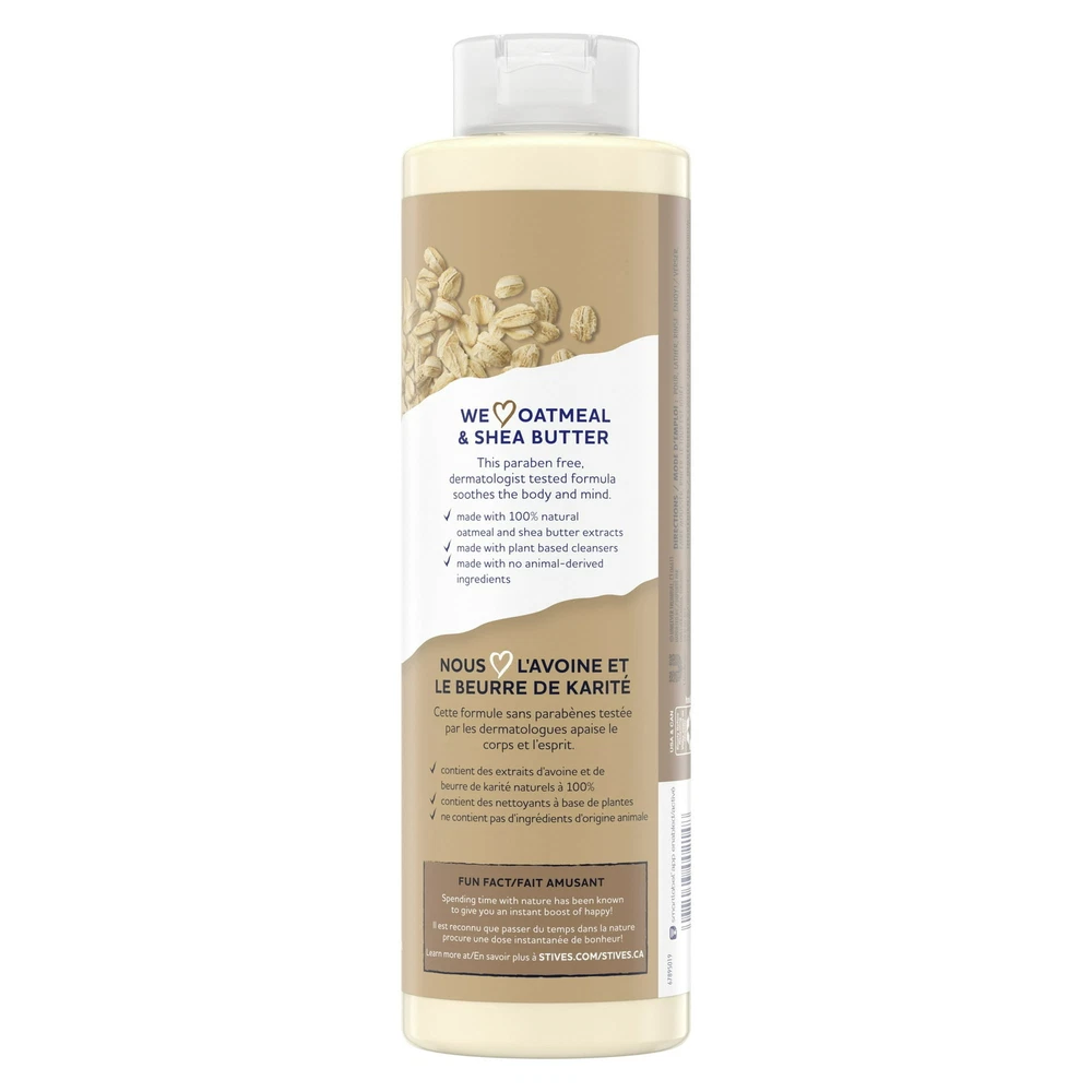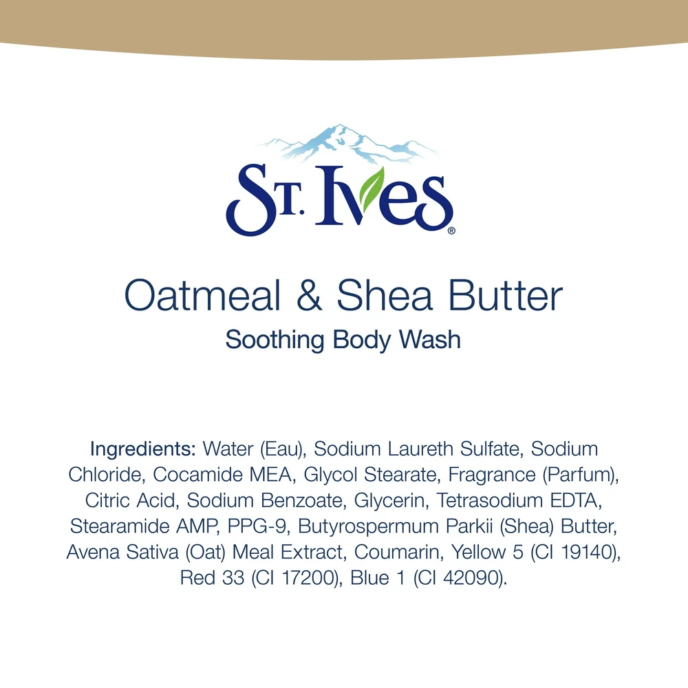 About this item Product details St. Ives Soothing Body Wash with Oatmeal and Shea Butter harnesses the natural soothing properties of these 100% natural extracts to give you softer, smoother healthy skin with every use. Fragranced with the delicate sweetness of shea butter, it works gently to improve the look and feel of dry and irritated skin to help calm redness and inflammation every time you use it. Transform your daily shower into a more spa-like experience with this natural body wash, which uses safe, powerful nutrients to cleanse and soothe sensitive skin — and is gentle enough to help skin stay healthy every single day. To use, simple squeeze into the palm of your hand, or onto a loofah or washcloth and apply directly to the body. Rinse clean and follow with your favorite body lotion to maximize moisture and softness. St. Ives has a long history of using natural ingredients and is committed to taking care of the planet that has served as its inspiration since its earliest days. To that end, its products — including this soothing women's body wash — use plant-based ingredients, recycled packaging, and are cruelty-free. An amazing addition to your existing collection of bath products, this moisturizing body wash for women is a good option for those who like shea butter body wash, coconut body wash, oatmeal body wash, lavender body wash and other natural body wash or body wash for sensitive skin. St. Ives Oatmeal & Shea Butter Soothing Body Wash soothes the mind, body, and soul while cleansing skin with a sudsy sumptuous lather. This cleanser is paraben-free and dermatologist tested. This body wash bottle is made from 100% recycled plastic. Known for our signature natural extracts, our body wash is made with 100% natural oatmeal and shea butter extracts Our St. Ives Oatmeal & Shea Butter Soothing Body Wash is made with plant-based cleansers and does not contain any animal-derived ingredients Treat yourself to a full-body cleanse! Our body wash not only leaves your skin glowing, but also effectively washes away dirt and bacteria. It can clean hands just as effectively as hand soap