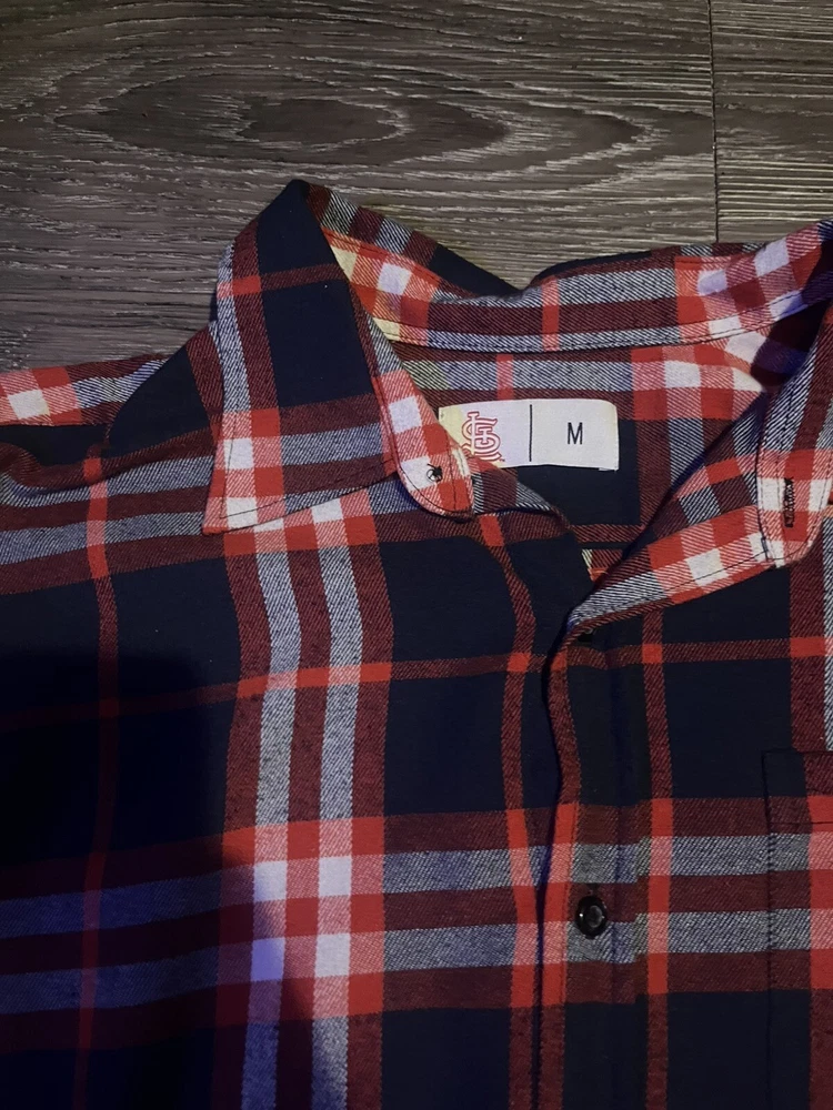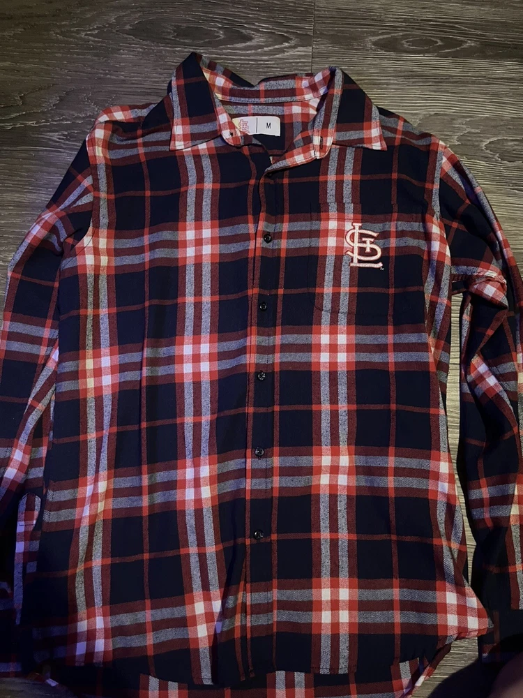 Show your support for the St. Louis Cardinals with this cozy flannel shirt! Made in China and featuring the iconic team logo, this unisex adult shirt is perfect for any Cardinals fan. The shirt is a size medium and is brand new, making it an ideal addition to your fan apparel collection. Wear it to the next game or to any sporting event to show your team spirit. This shirt is a must-have for any true Cardinals fan.