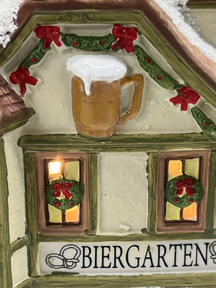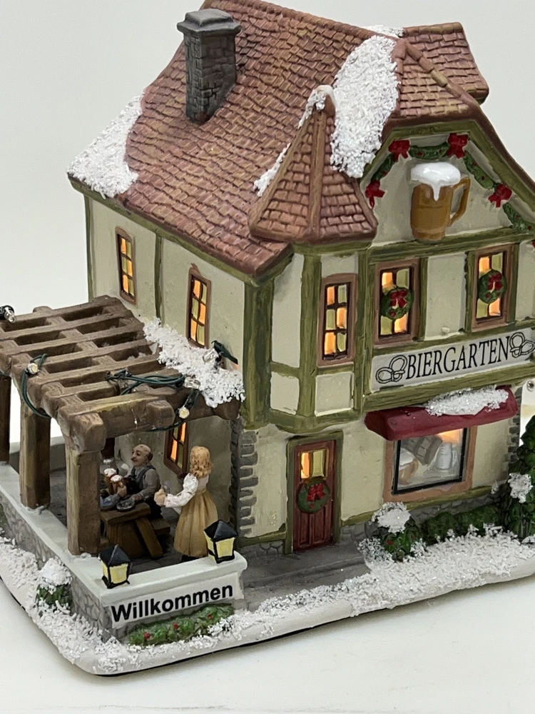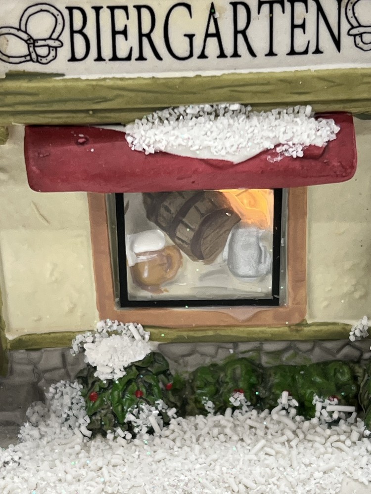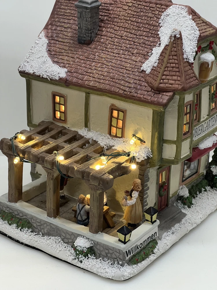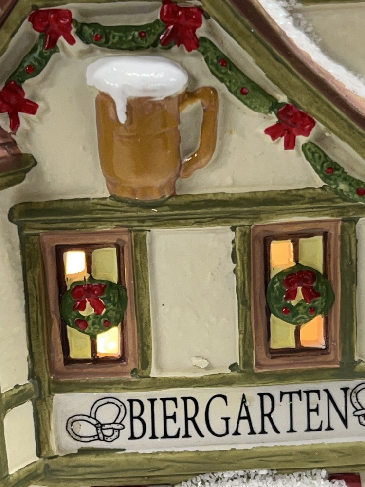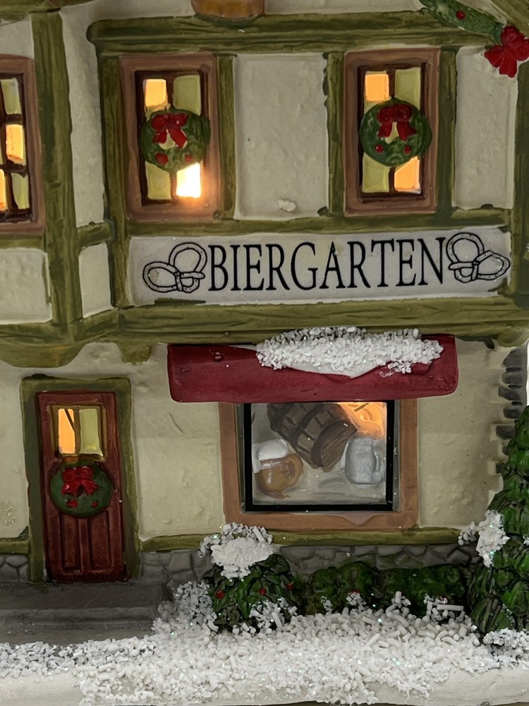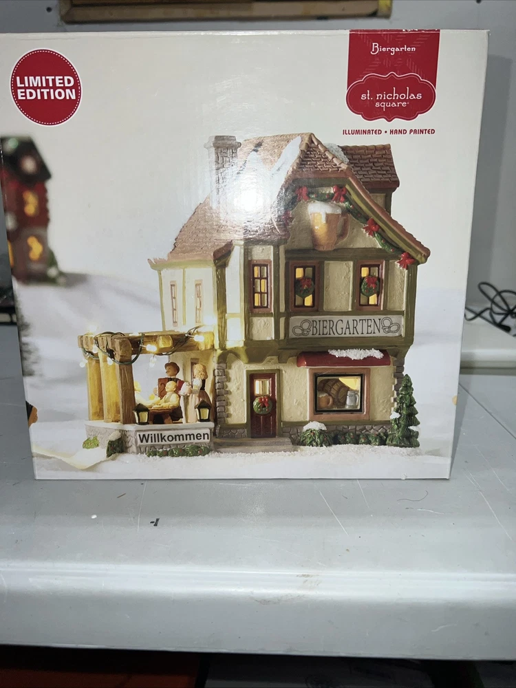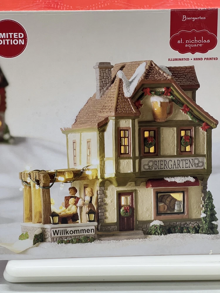 This St. Nicholas Square "Biergarten" Limited Edition Village Collection item from 2018 is a medium-sized ceramic beer garden house, hand-painted in a whimsical Mediterranean style. It features illuminated 3D effects and comes boxed. Ideal for a seasonal village display, this retired piece is perfect for Christmas and any room decor. It includes an adapter and is part of the St. Nicholas Square Village Collection, adding a festive touch to your holiday decorations. Absolutely incredible perfect pristine condition! Comes with all original perfect packaging, box like brand new , comes with A/C adapter and bulb . Lights over outdoor patio blink on & off . Beautiful item to add to your village!