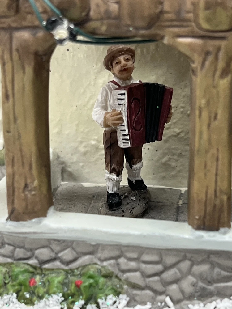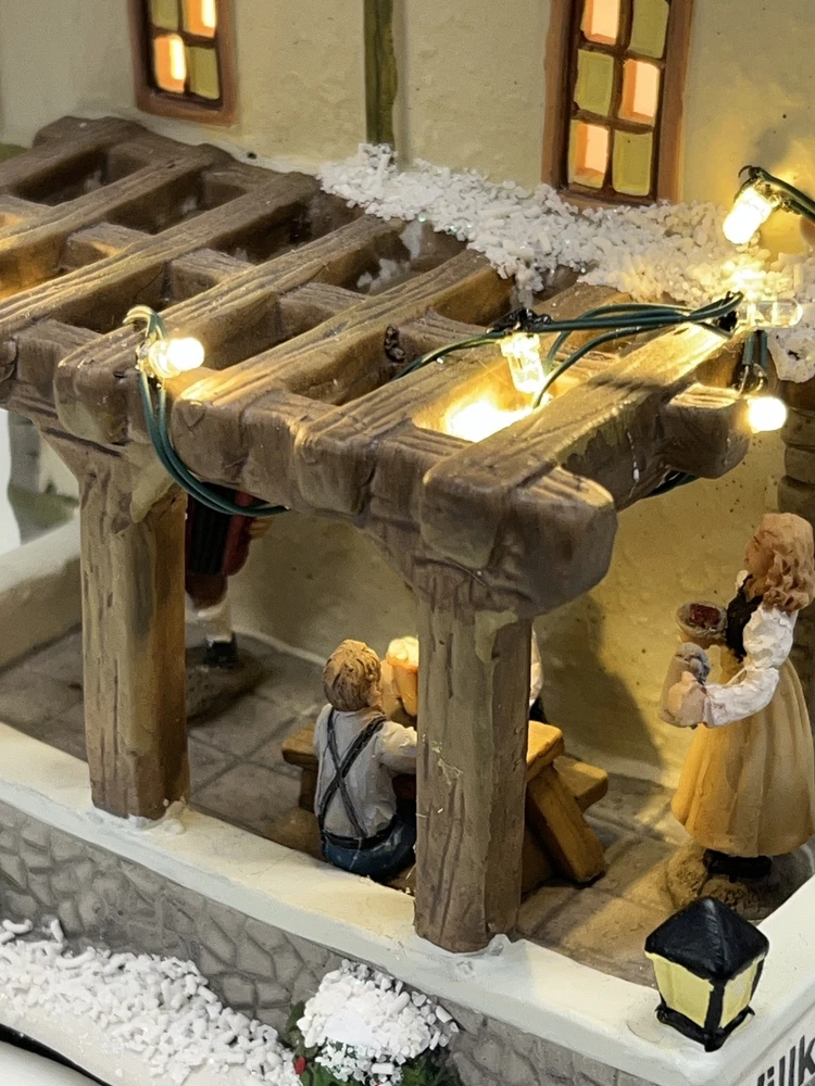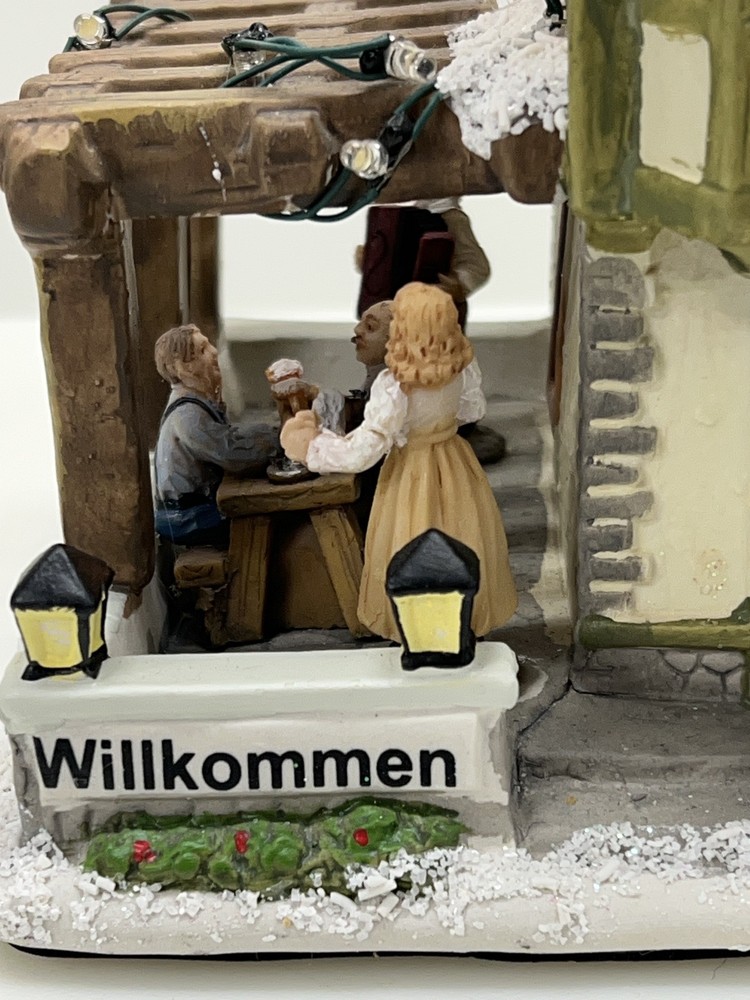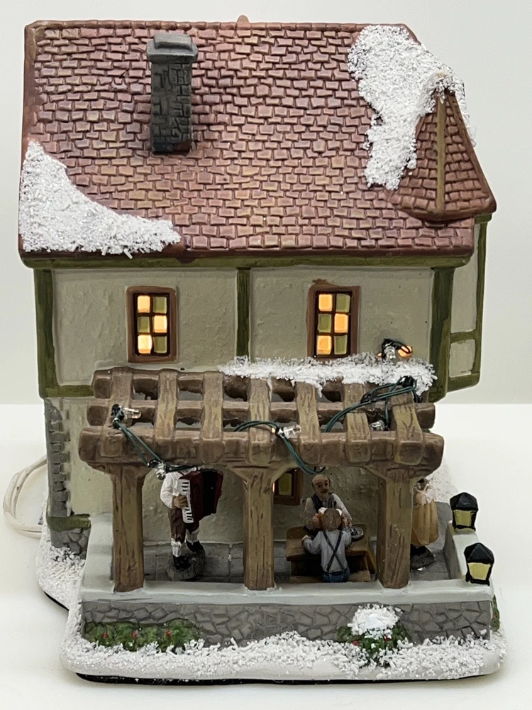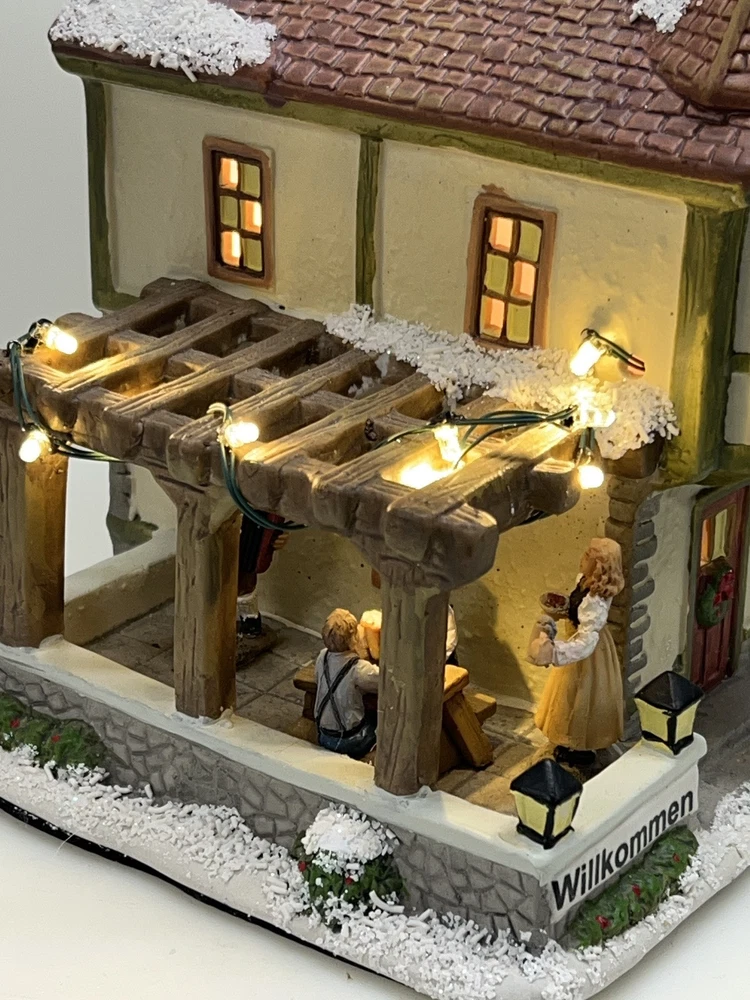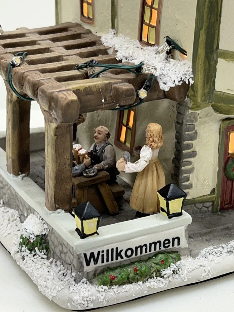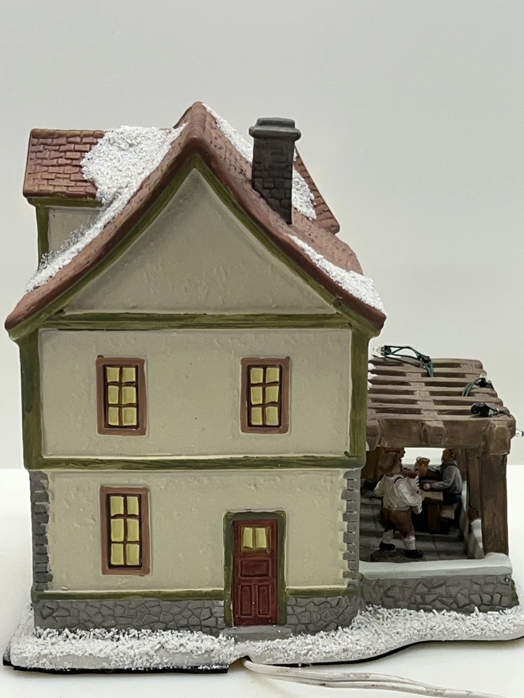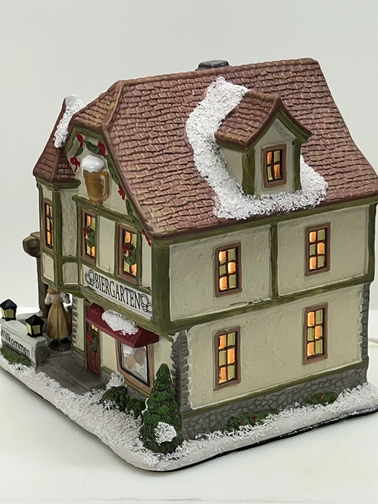 This St. Nicholas Square "Biergarten" Limited Edition Village Collection item from 2018 is a medium-sized ceramic beer garden house, hand-painted in a whimsical Mediterranean style. It features illuminated 3D effects and comes boxed. Ideal for a seasonal village display, this retired piece is perfect for Christmas and any room decor. It includes an adapter and is part of the St. Nicholas Square Village Collection, adding a festive touch to your holiday decorations. Absolutely incredible perfect pristine condition! Comes with all original perfect packaging, box like brand new , comes with A/C adapter and bulb . Lights over outdoor patio blink on & off . Beautiful item to add to your village!