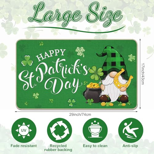 30 Days Return Policy Fast Delivery Trusted seller St Patrick's Day Doormat 17 x 29 Inch Linen Rubber St. Patricks Gnomes Mat Non Slip Clover Shamrock Welcome Door Mat Happy St. Patrick's Day Floor Rug for Irish Indoor Outdoor Entrance Decor Product Description Decorative Mat: the package contains 1 St. Patrick's Day doormat, beautifully crafted with cute gnome and four leaf clover patterns, and the words [Happy St. Patrick's Day], which fully meets your decoration needs, adds a festive atmosp, and brings you convenience and aesthetic enjoyment Ideal Size: Irish decorative door mat measures approx. 17 x 29 inches, this doormat is the ideal size to place in your entryway, keeping a balance between being noticeable and not occupying too much space, making it an eye catching and practical addition to your home, and other places Durable Material: this washable shamrock floor rug is made of quality linen rubber, robust and enduring, not easy to break, deform, or wear out, can withstand heavy foot traffic over the holiday season, it is suitable for indoors and outdoors for long time use Anti Slip Design: the St Patrick's Day flax mat are crafted with an anti slip rubber backing, ensuring safety for steps taken, which makes it a reliable choice for homes, reducing the risk of slipping during the bustling holiday season, keeping your guest safe and festive Cheerful Holiday Spirit: the clover washable doormat provide a festive upgrade to your decor; The vibrant clover keep in contrast to the green mat, immediately establishing a merry atmosp, and leaving a deep impression on your guests Shipping Returns Payment Shipping Shipping is FREE to all addresses other than APO/PO boxes in the lower 48 states. All our stock ships from US-based warehouses. Shipped via USPS or UPS (depending on location and package weight) Unless stated otherwise, all orders will ship within 24-72 hours of your payment being processed. Check our feedback to see the great reviews of FAST shipping we offer. Returns As our valued customer, we will do our best to make sure the product you receive arrives to you on time and as expected. If you are not satisfied with your purchase, please contact us within 30 days of receiving your order to process a return. Payment We currently accept payment via eBay managed payments only. Once payment is cleared, we will dispatch your shipment within 1-3 business days. Please refer to the "Shipping" tab for more information regarding shipping speed to your destination.