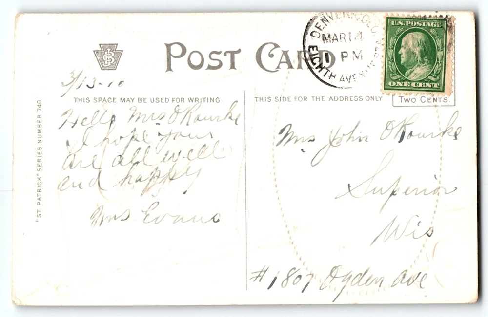 Posted with cancel. Antique vintage original embossed Saint Patrick's Day postcard. Has corner dings and some age wear. Stock#sp167. Additional postcards are in our store. All post cards are old originals and may or may not have writing on back. Bundle and save by using cart and making single payment.