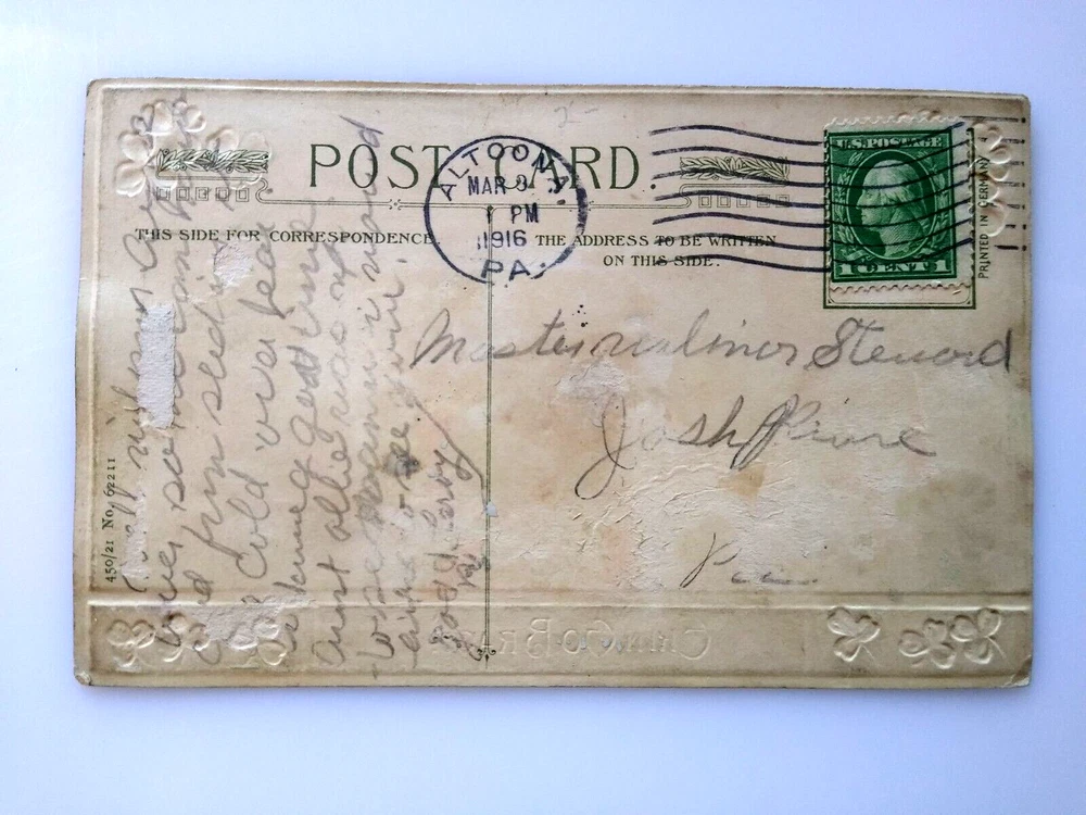 Material: Paper Type: Printed (Lithograph) Brand/Publisher: John Winsch Subject: Ireland Number of Items in Set: 1 Theme: Art, Greetings, Holiday, People, Irish, Lake, Clovers, Rocks, Mountains, Vendor Cart, Cart, Buggy Country/Region of Manufacture: Germany Era: Pre-War (Pre-1914) Year Manufactured: 1913 Unit of Sale: Single Unit Artist: John Winsch Occasion: St. Patrick's Day Features: Divided Back, Embossed Postage Condition: Posted Custom Bundle: No Time Period Manufactured: 1900-1919 Original/Licensed Reprint: Original Size: Standard (5.5 x 3.5 in)