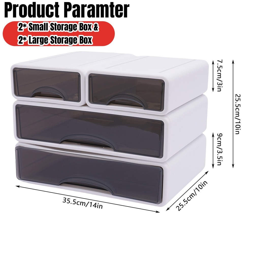 Stackable Storage Box With 4*Drawer Desk Organizer Storage Container Neat Large Welcome to our store~ Product Parameters: Material: PP Color: White Mounting Type: Tabletop Mount Special Feature: Stackable Shape: Rectangular Small Storage Box Size: 25*17*7.5cm/9.8*6.7*3in Large Storage Box Size: 35.5*25.5*9cm/14*10*3.5in Total Height(Stackable): 25.5cm/ 10in Product Size: 35*26*27cm/13.8*10.2*10.6in Net Weight: 2kg/4.41lbs Gross Weight: 2.11kg/4.65lbs Package Includes: 2* Small Storage Box 2* Large Storage Box Product Features: High-quality Material: The product is made of high-quality MDF and the surface is painted, with high hardness, strong pressure resistance, and anti-corrosion performance. Fashionable Appearance: Its simple lines and a classic color scheme can be used as a home decoration to add atmosphere and beauty. It can also be used to display your decorations such as vases, green plants, and books. High Stability: The thickened panels and 4 outward extending wooden feet provide the product with great stability and give it a strong weight-bearing capacity (44.09~66.14lbs). Storage Assistant: Double drawers and a wide countertop (39.3*18.9 inches) can increase your storage space so that you can store items in an organized manner. Thoughtful Design: The 16.5inch coffee table height can adjust to most sofa heights. 13.78inches floor height and open bottom allow you to sit comfortably on the floor and extend your legs without restriction. Easy to Carry and Clean: The small size (39.3*18.9*16.5 in) makes it easy to carry out and store, and it is ideal for dormitories, small apartments, and other rooms where the space is tight. And its simple structure and smooth surface of the product make it easy to clean. Easy to Install: Simple product structure, complete installation parts, and a detailed electronic English instruction allow you to install more easily and accurately. Note: Please allow the slight color difference caused by the shooting light and 1-3cm error due to manual measurement and make sure you do not mind before ordering. Details Bottom Wear Resistance: The bottom is designed with a recess that fits into the top card slot while increasing wear resistance. Curved Handle: The curved handle allows you to push and pull the drawer more smoothly, and its edges are finely polished so that they won't hurt. Payment Delivery details Terms of sales About us Contact us Payment We accept ebay payment 。 Fees such as import duties, taxes are not included in the item price or shipping costs. These charges are the buyer's responsibility. Delivery details Shipping: 2-9 working days to: USA Terms of sales We maintain high standards of excellence and strive for hundred percent customer satisfaction. Feedback is very important to us. We hope that you contact us immediately before you give neutral or negative feedback, so that we can address your concerns. It is impossible to address issues if we do not know about them! About us Your satis faction is our ultimate goal. We work hard to earn your trust and future business. Our certified technicians have tested each item before shipping. The unit comes with 1 year limited warranty on all manufacturing defects. a) If you receive a defective item, you may return it or ask for a discount. Please contact us within 14 days after you receive the package. b) What you returned must be intact and in its original packaging as re? u. Customer is responsible for shipping costs of the returned item. c) We will cover the cost of shipping back t with the shipping rate indicated in the registration page. We will send you a new unit or refund the full payment you paid. Thank you. Contact us Business Hour Business Hour: Monday To Friday: 8:30 AM to 5:00 PM (Beijing China time) Due to time zones, our reply to your questions may not be immediately. But within above working time, we will reply your email within 24 hours. If it's non-workdays, please kindly be patient and wait till Monday. Please contact us with ebay message. Please feel free to contact us if you have any questions. Monday To Friday: 8:30 AM to 5:00 PM (Beijing China time) Due to time zones, our reply to your questions may not be immediately. But within above working time, we will reply your email within 24 hours. If it's non-workdays, please kindly be patient and wait till Monday. Please contact us with ebay message. Please feel free to contact us if you have any questions. Custom Bundle No Features Long service life, High Quality Packaging, Unique Appearance Warranty Three years Highlights Nice and Practical, High Quality Packaging, High quality W/ warranty!, Easy installation,Convenient Use,Easy Operation Feature * Great Durability,Convenient Use Year of manufacture 2023 Surface Finish Made of high quality material Manufacturer Warranty 3 Years Material PP Shape Rectangular Style Simple Color White Number of Drawers 4 Type Stackable Office Storage Box Mounting Tabletop Mount Small Storage Box Size 25*17*7.5cm/9.8*6.7*3in Large Storage Box Size 35.5*25.5*9cm/14*10*3.5in Item Height 25.5cm/ 10in (total) Package Size 35*26*27cm/13.8*10.2*10.6in Net Weight 2kg/4.41lbs Gross Weight 2.11kg/4.65lbs Item Length 35.5cm/14in Item Width 25.5cm/10in UPC Does not apply Brand SENDERPICK MPN Does not apply