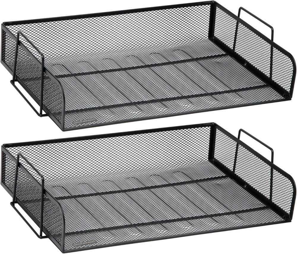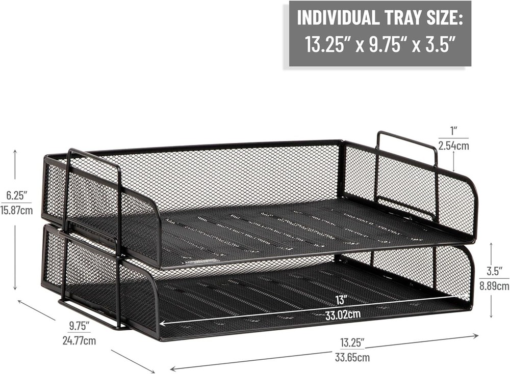 Stackable Paper Tray, Desktop Organizer, File Storage, Office, Metal Mesh, " L x " W x " H, 2 Pcs., Black Sleek & Functional Design: Metal mesh trays hold letter-size documents and enhance organization in any workspace No Assembly Required: Arrives ready to use—stack vertically or separate across different workspaces Compact & Versatile: Great for organizing paperwork, folders, schoolwork, or incoming mail at home or office Durable & Easy to Maintain: Steel mesh construction resists wear and cleans easily with mild soap and water Space-Saving Size: Each tray measures "L x "W x "H; total stacked height is " ( x x cm) Streamline your workspace with the 2-Tier Stackable Paper Tray—an efficient desktop organizer for letter-size documents, folders, and mail. These metal mesh trays help reduce clutter and promote productivity, whether used together as stackable letter trays or individually in separate areas of your office or home.Crafted from durable steel mesh, each tray offers visibility, strength, and easy access to contents. The open mesh design helps you quickly identify what you need while keeping your papers neat and accessible. No assembly is required—just unpack and organize. Ideal for anyone needing file trays for desk stackable storage, these trays are perfect for offices, classrooms, dorms, and home workstations.